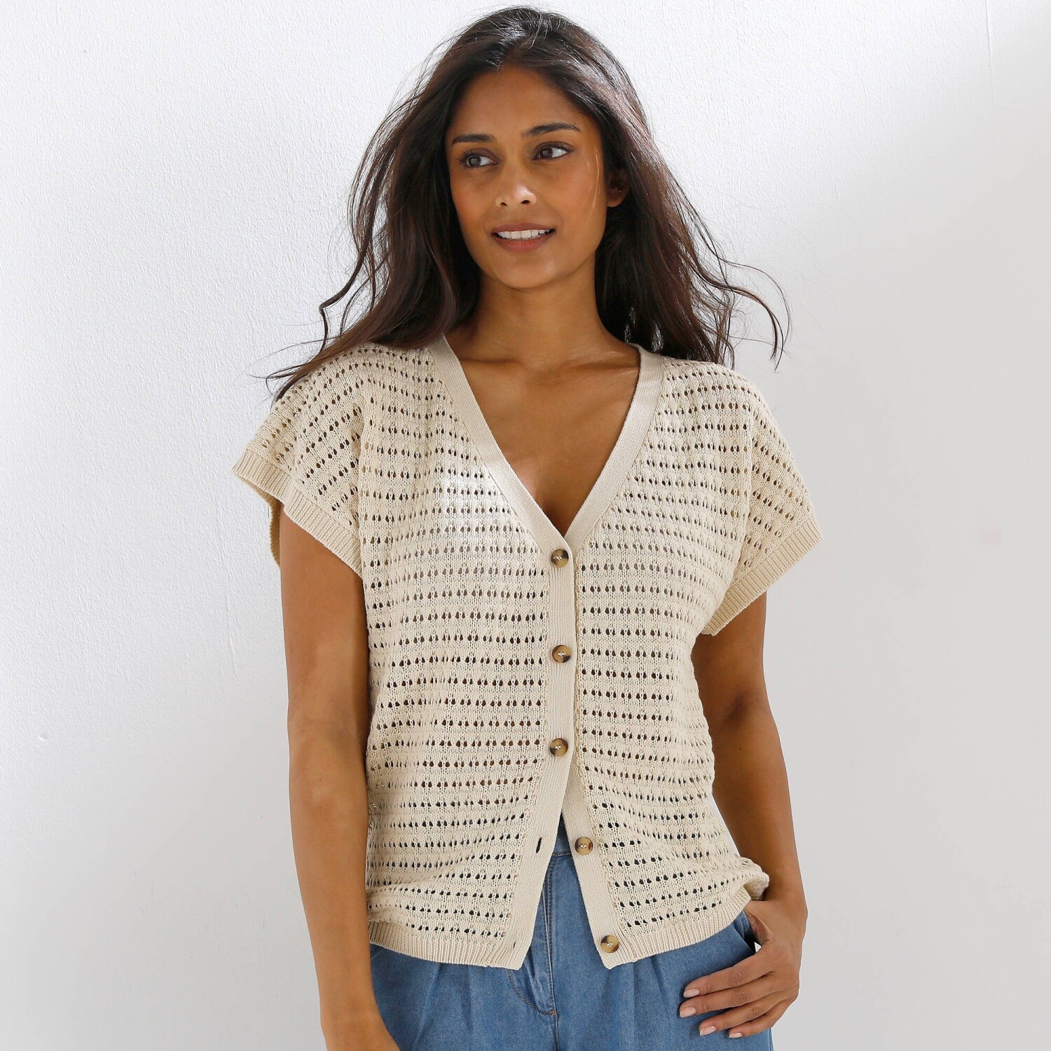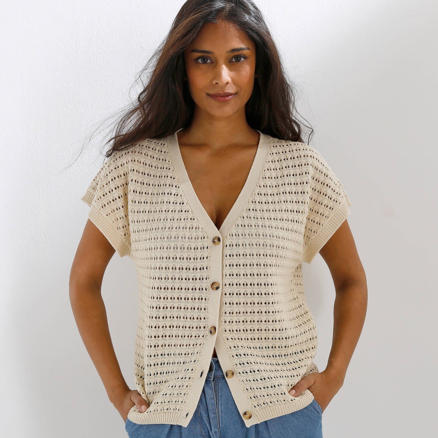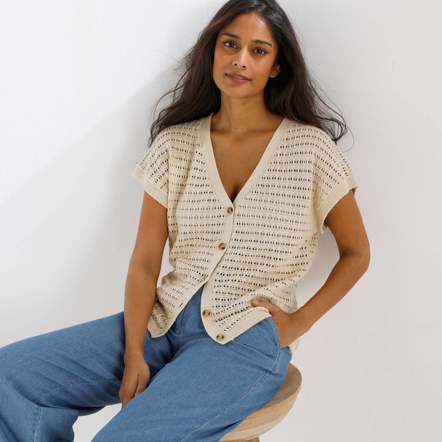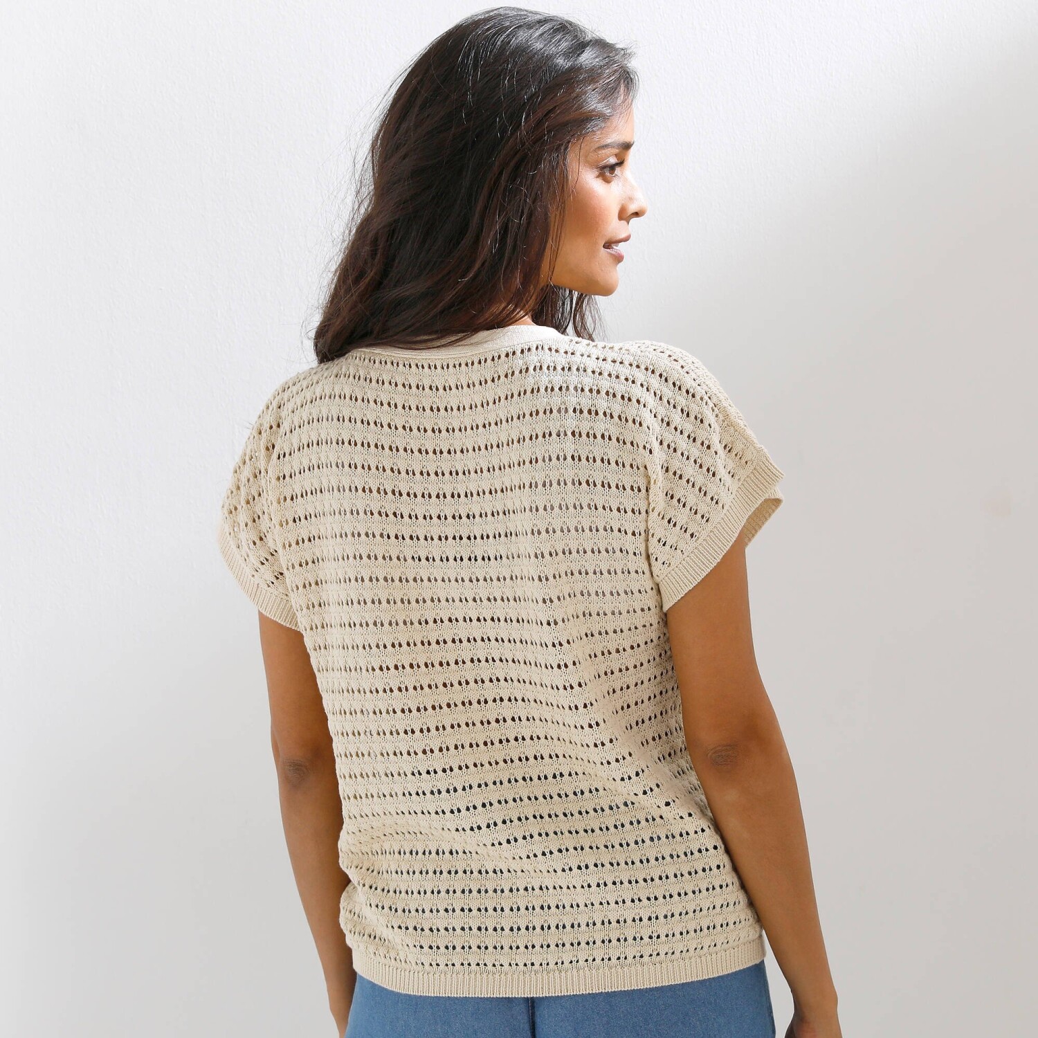 Blúzka s krátkymi rukávmi prináša skvelý vzhľad a pohodlie. Ažúrový vzor. Voľný, komfortný strih. Výstrih do "V" s gombíkovou légou. Voľné ramená. Nazberaný dolný lem. Možno prať v práčke.