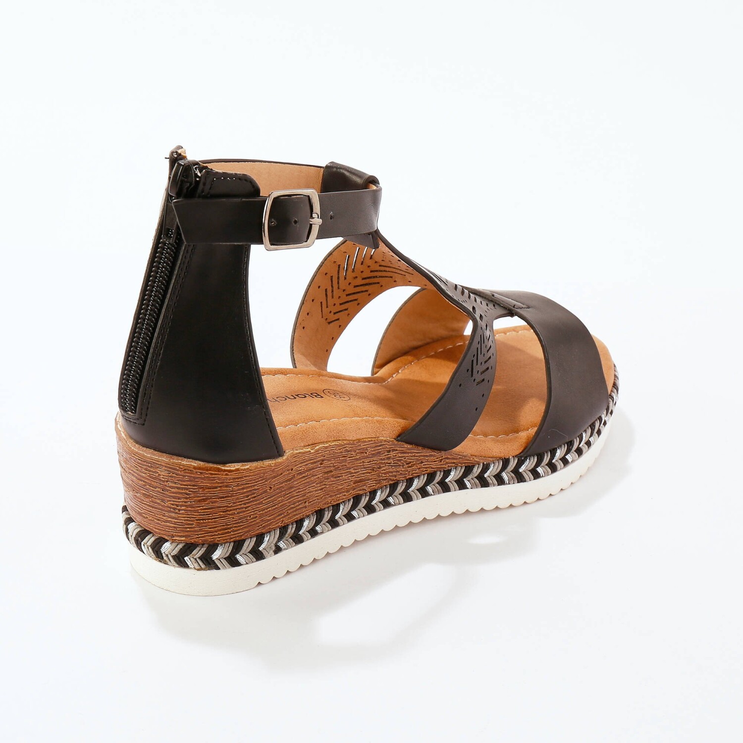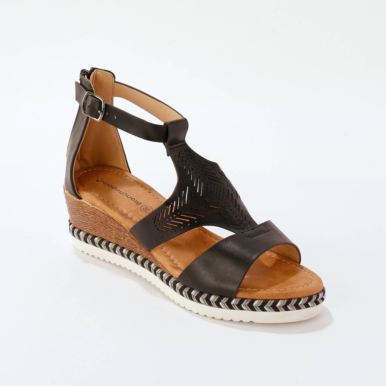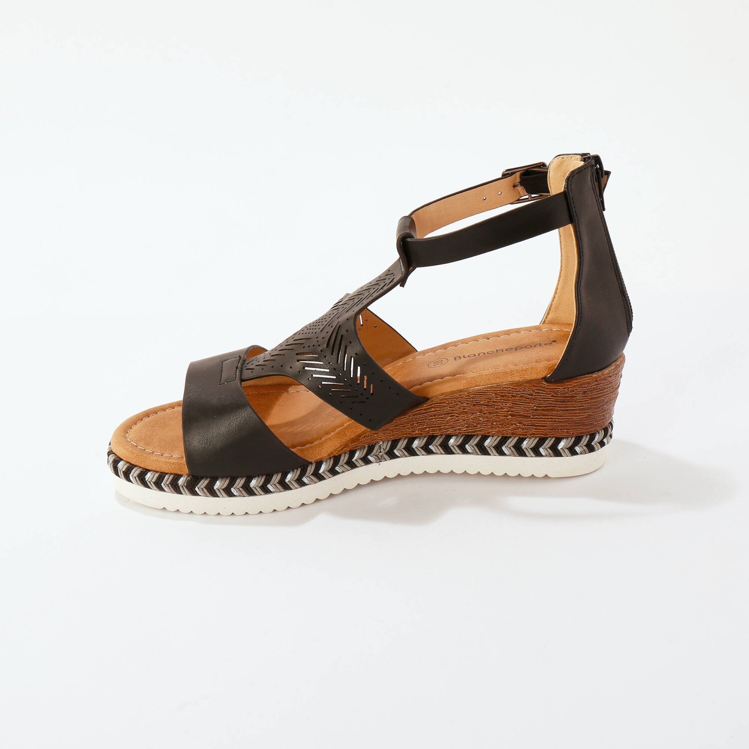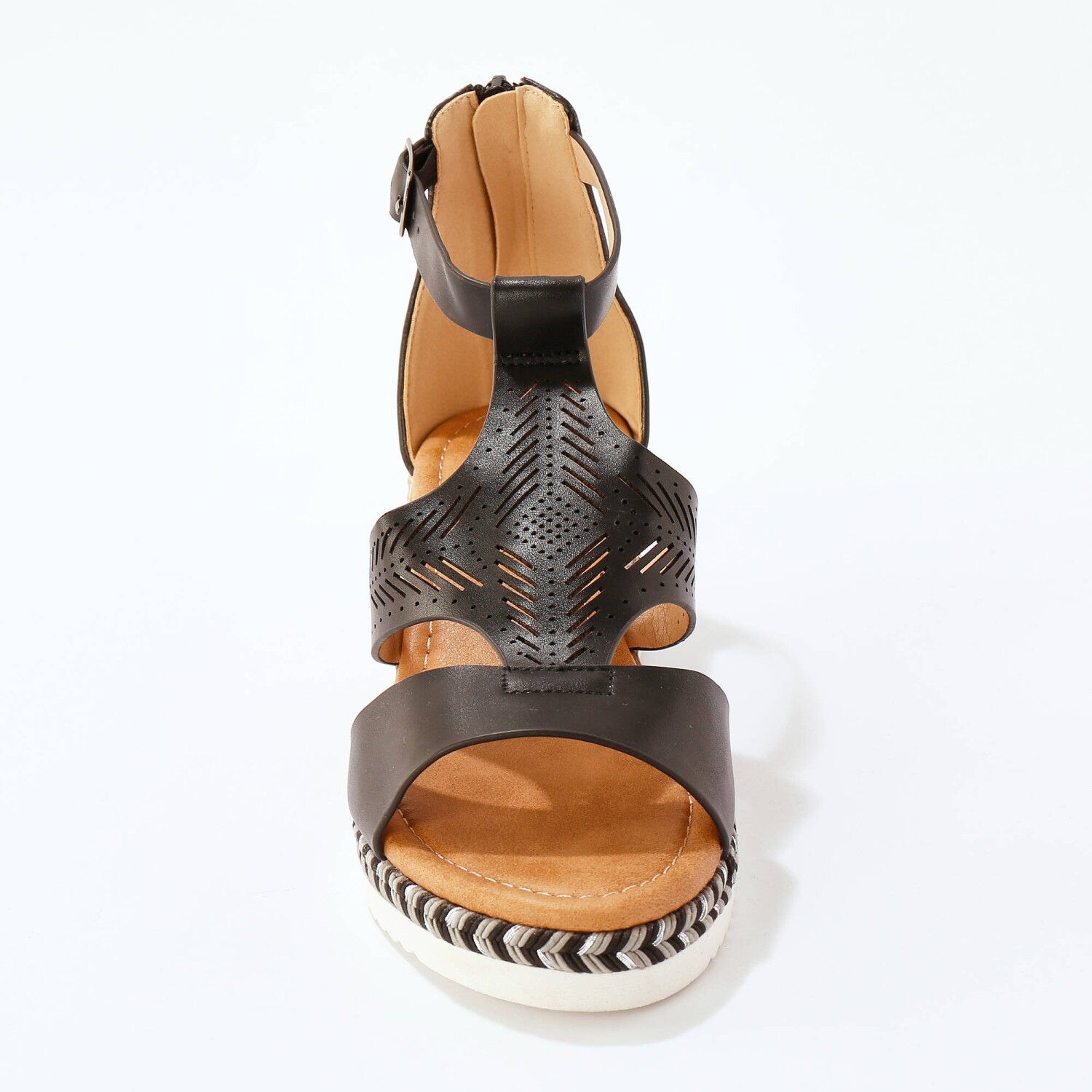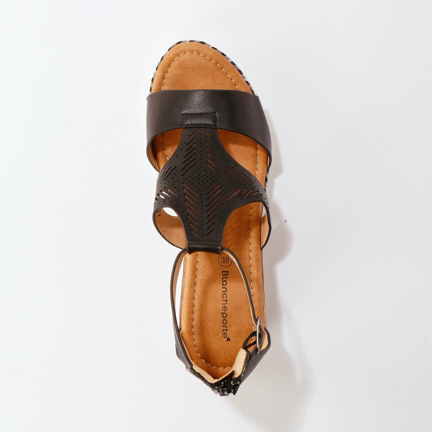 Zamilujte si ažúrové sandále na klinovom podpätku. So zipsovým zapínaním na päte a ažúrovým zvrškom, nemožno ich prehliadnuť. Otvorená oblá špička. Ažúrová sára. Pružný opätok so zipsovým zapínaním umožní ľahké obutie. Klinový podpätok. Protišmyková podrážka. Topánky pravidelne ošetrujte prípravkom na ochranu pred škvrnami a vlhkosťou.
