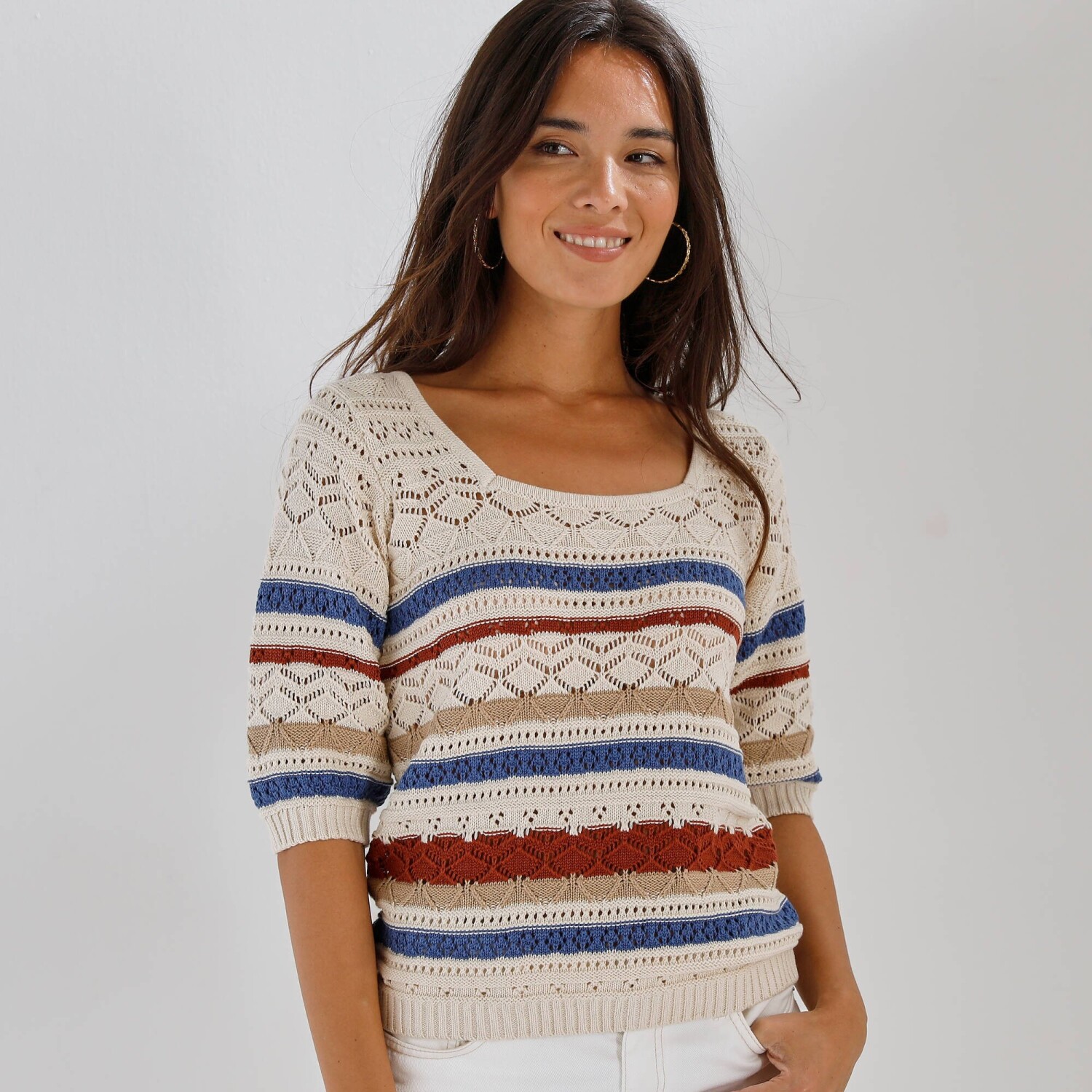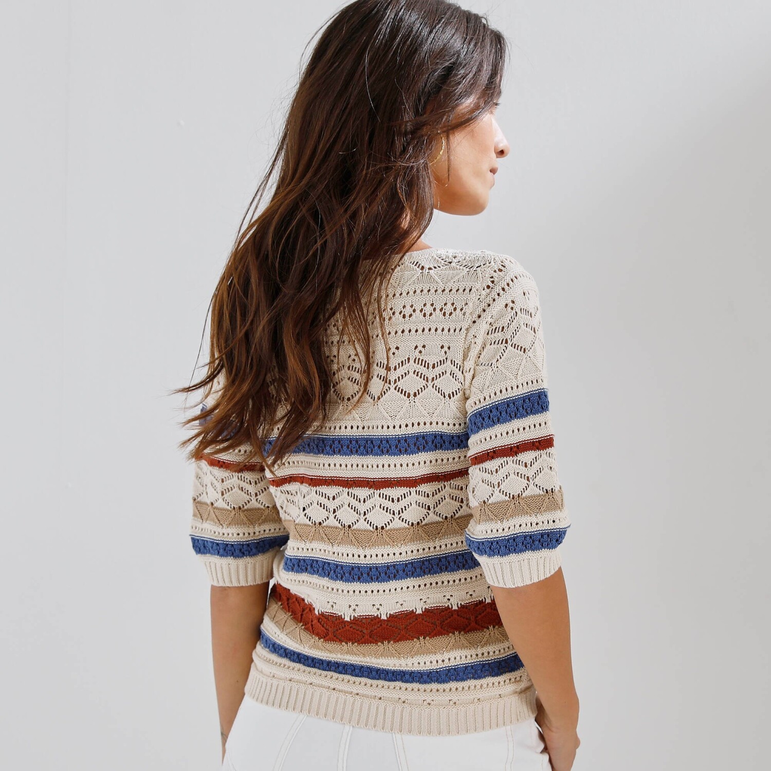 Pruhovaný ažúrový pulóver s hranatým výstrihom si zaručene získa milovníčky boho štýlu. Hranatý výstrih. Rukávy po lakte a rovný dolný lem zúžené vrúbkovaným zakončením. Vpredu a vzadu prúžkovaný motív. Možno prať v práčke.