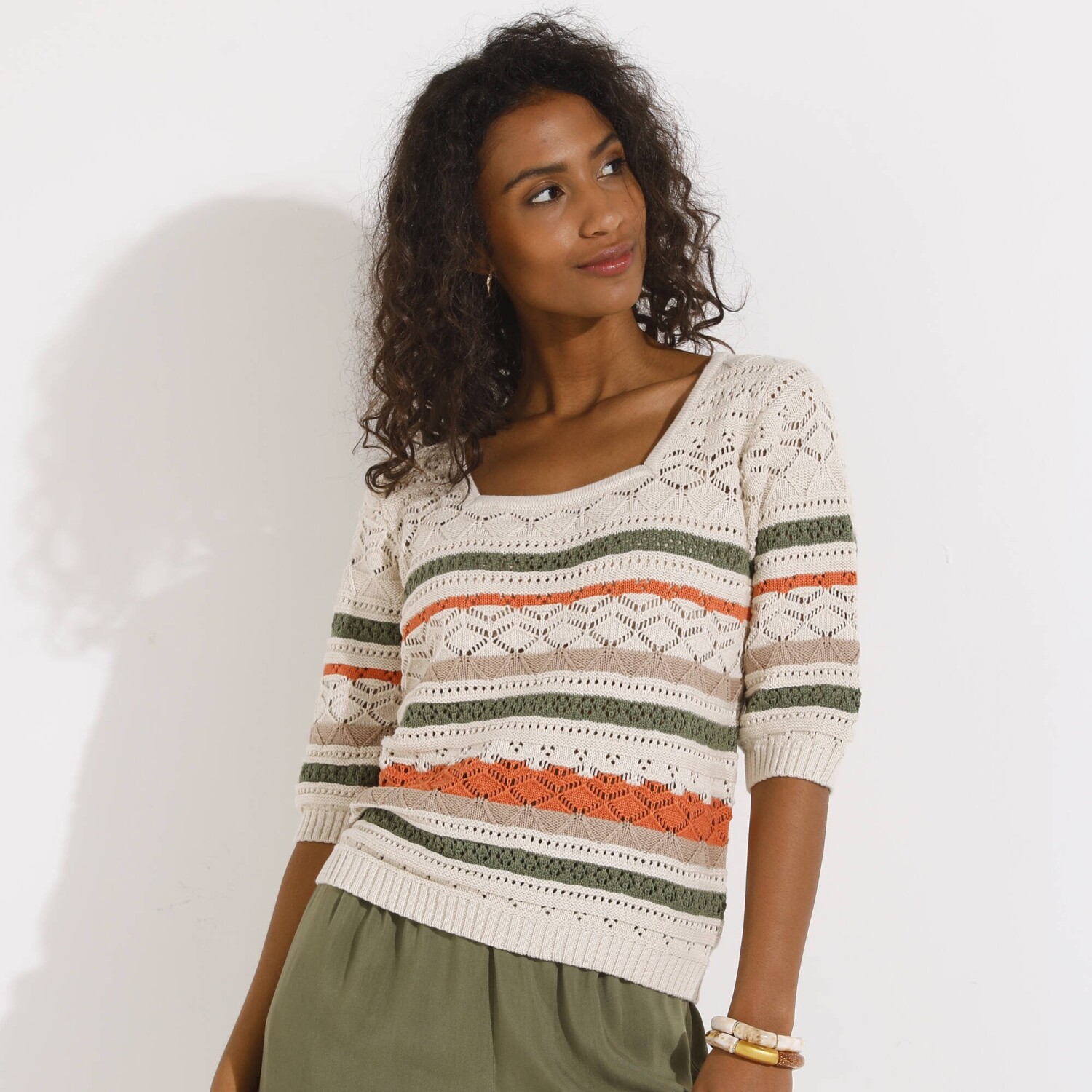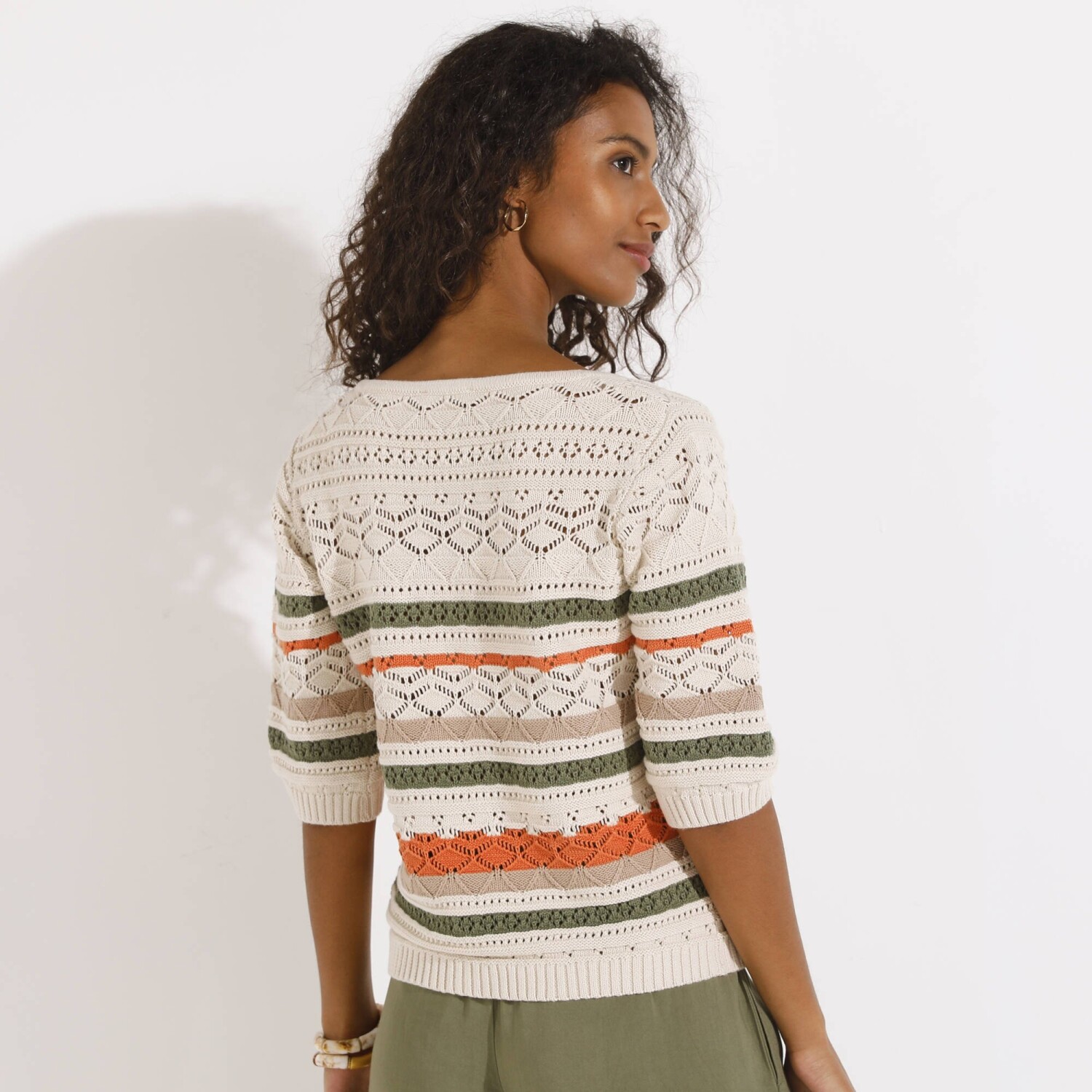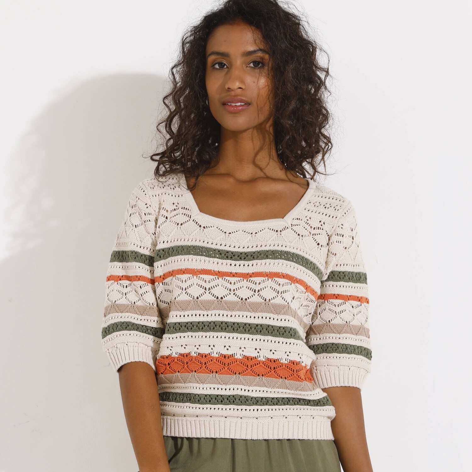 Prihlásenie RegistrovaťPruhovaný ažúrový pulóver s hranatým výstrihom si zaručene získa milovníčky boho štýlu. Hranatý výstrih. Krátke rukávy a rovný spodný lem zúžené vrúbkovaným zakončením. Vpredu a vzadu stredový motív. Možno prať v práčke.