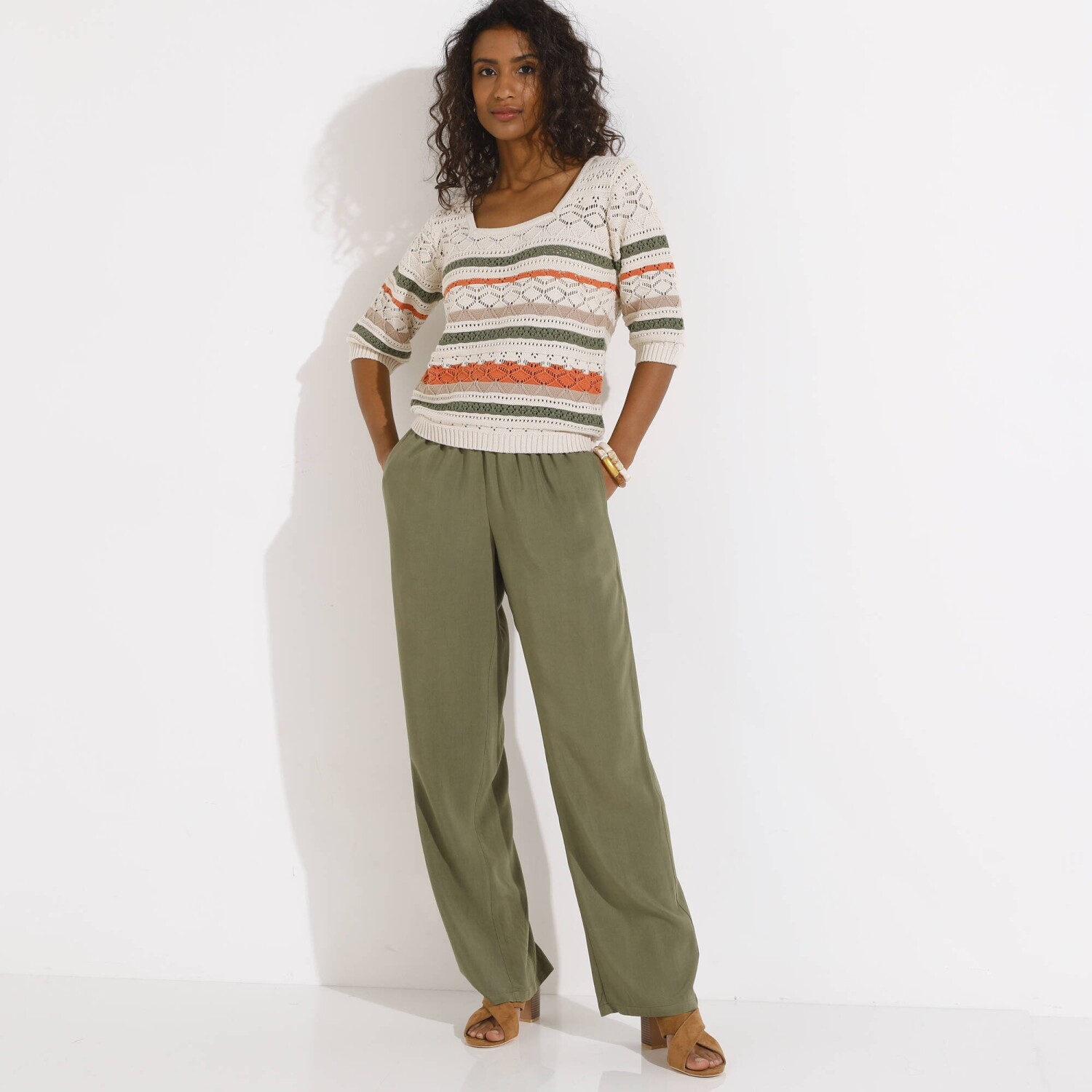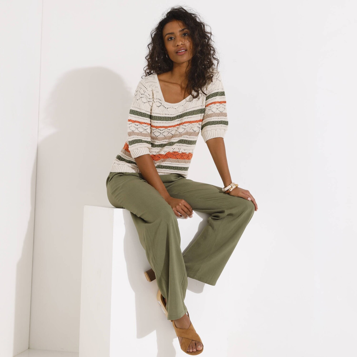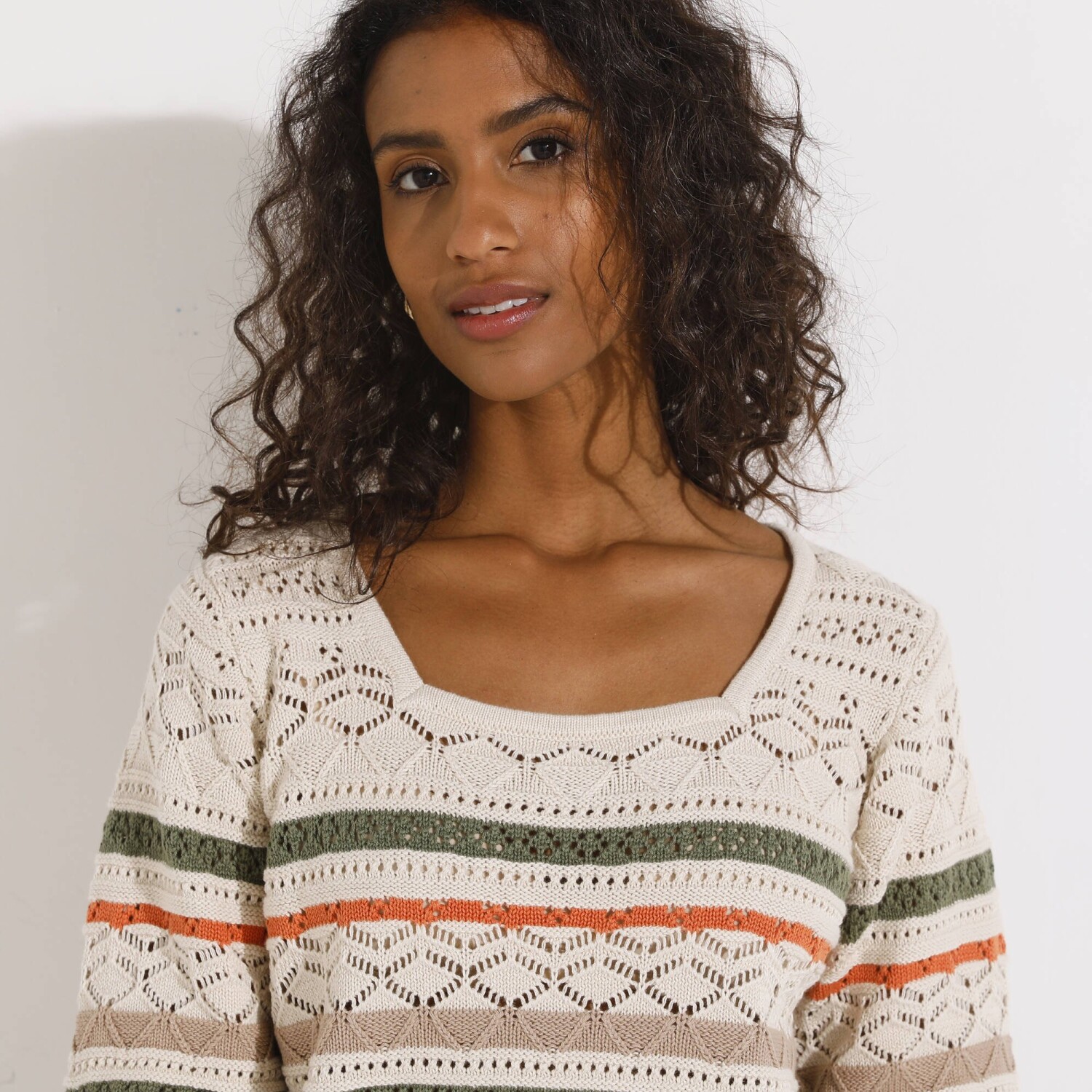 Prihlásenie RegistrovaťPruhovaný ažúrový pulóver s hranatým výstrihom si zaručene získa milovníčky boho štýlu. Hranatý výstrih. Krátke rukávy a rovný spodný lem zúžené vrúbkovaným zakončením. Vpredu a vzadu stredový motív. Možno prať v práčke.