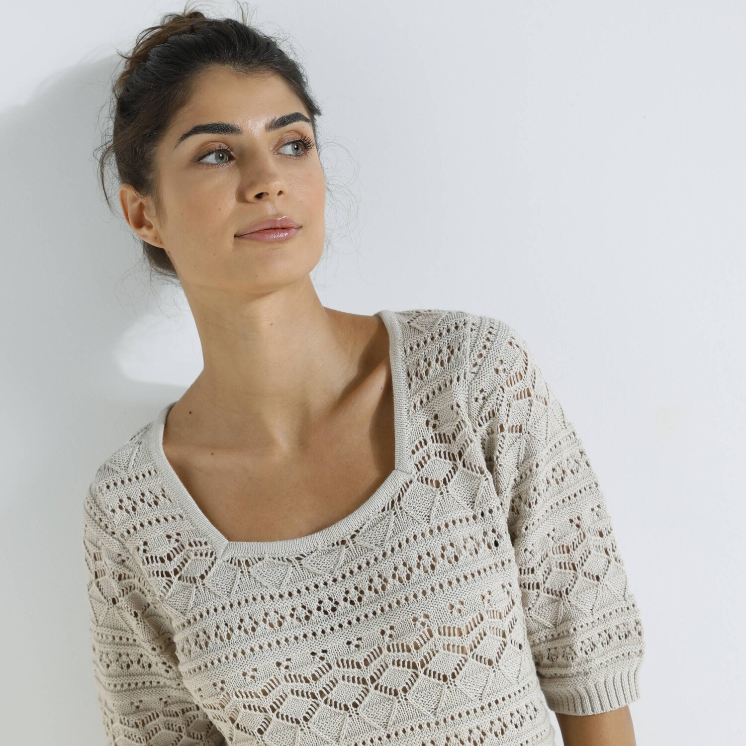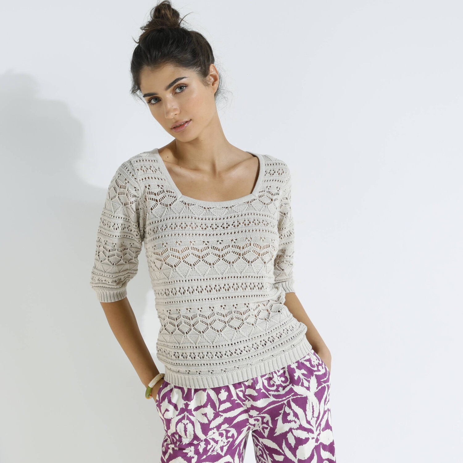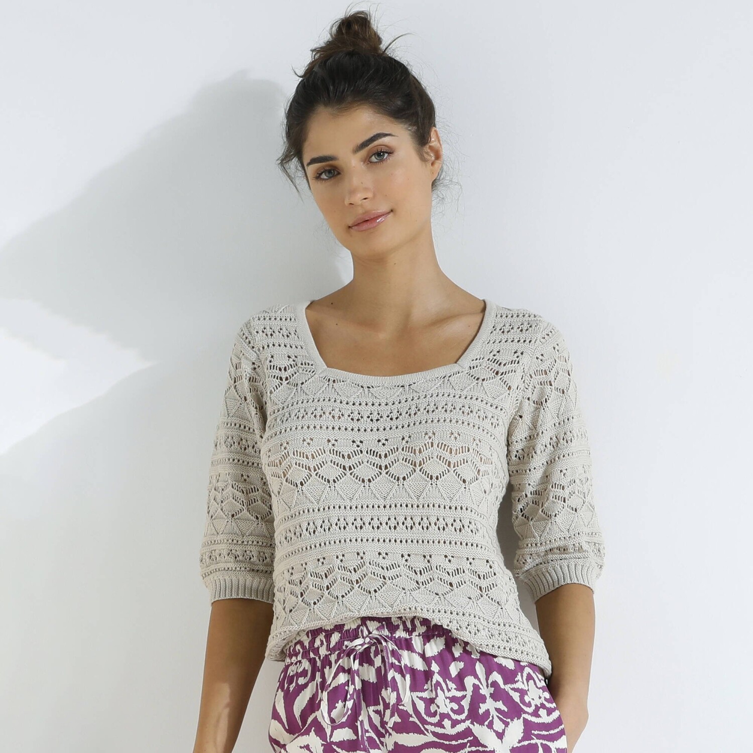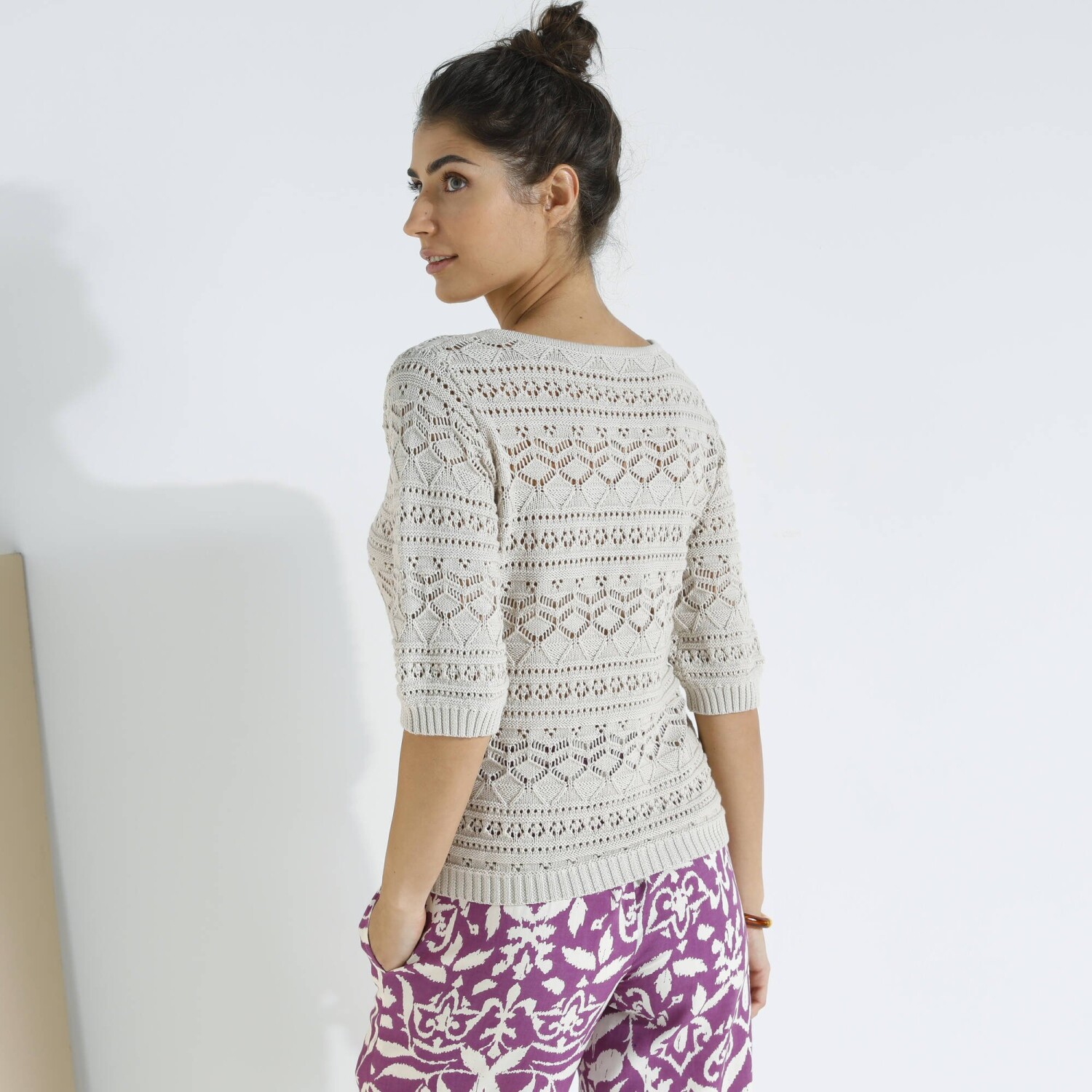 Prihlásenie RegistrovaťHranatý výstrih, zmes bavlny a akrylu, oslňujúci štýl: tento pulóver nemá chybu! Hranatý výstrih. Krátke rukávy a rovný spodný lem zúžené vrúbkovaným zakončením. Vpredu a vzadu stredový motív. Možno prať v práčke.