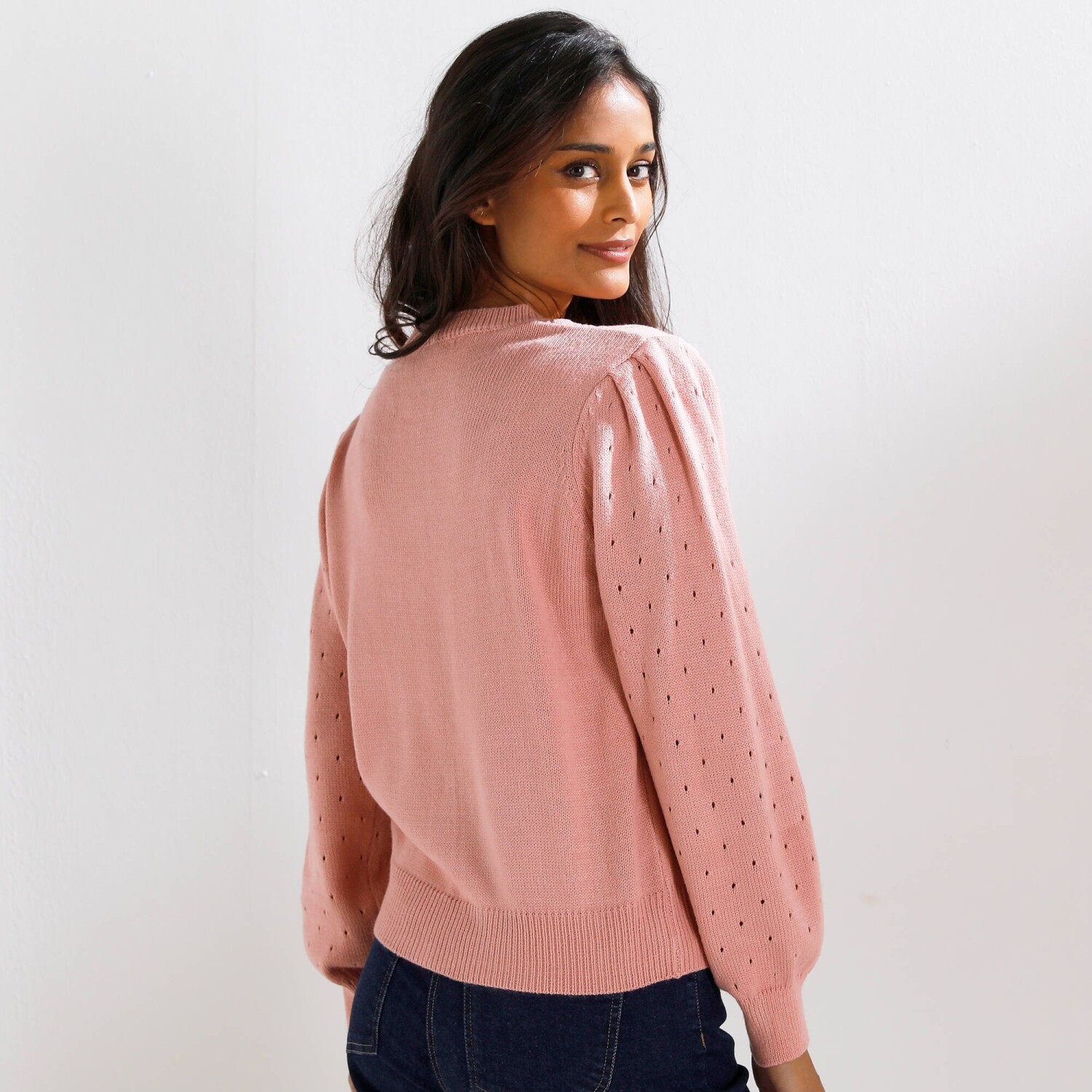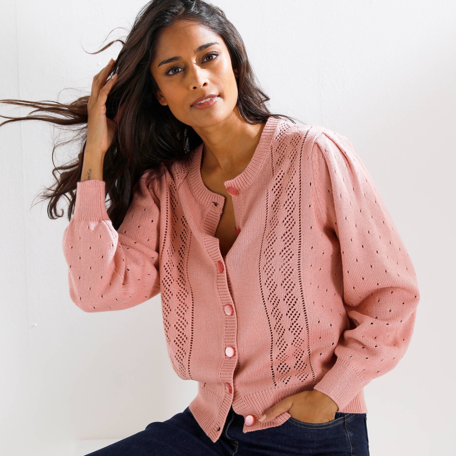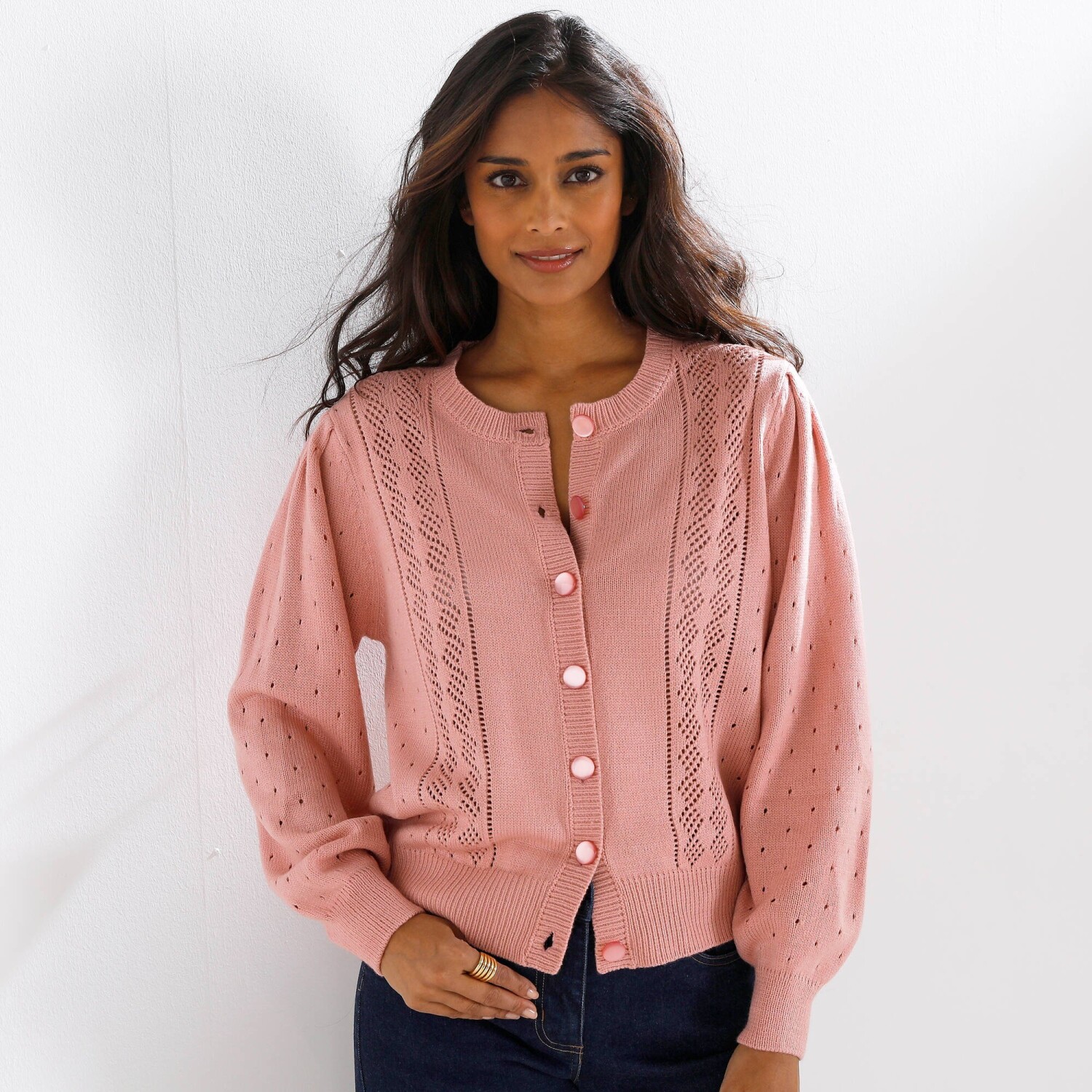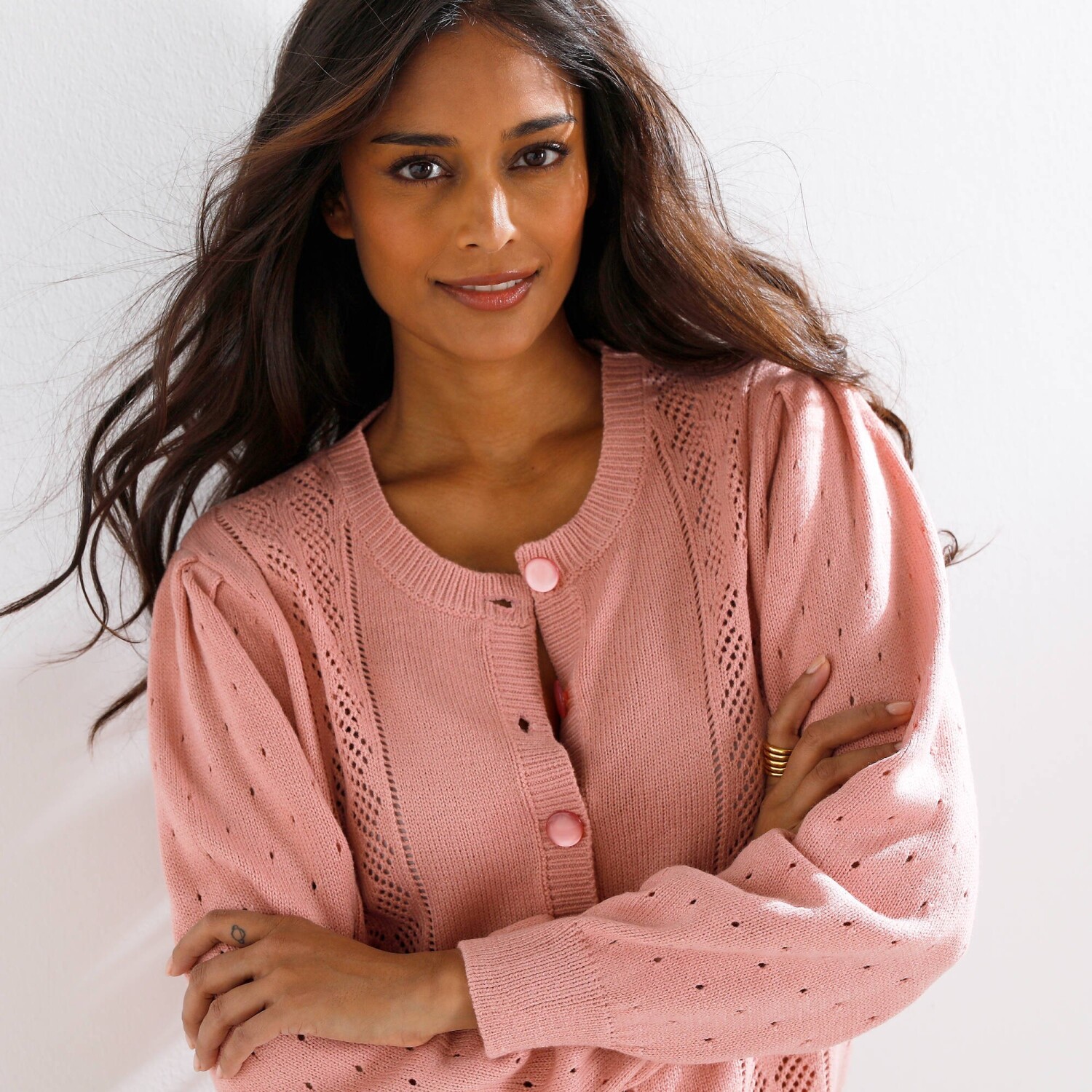 Ažurový sveter na gombíky je jemný ako pohladenie. Z jemného ažurového úpletu s háčkovanou aplikáciou vpredu. Okrúhly výstrih. Vpredu zapínanie na gombíky. Dlhé rukávy s nariasenými ramenami. Konce rukávov a dolný lem zúžené vrúbkovaním. Kašmírový na dotyk: príjemný na každodenné nosenie a s ľahkou údržbou. Možno prať v práčke.