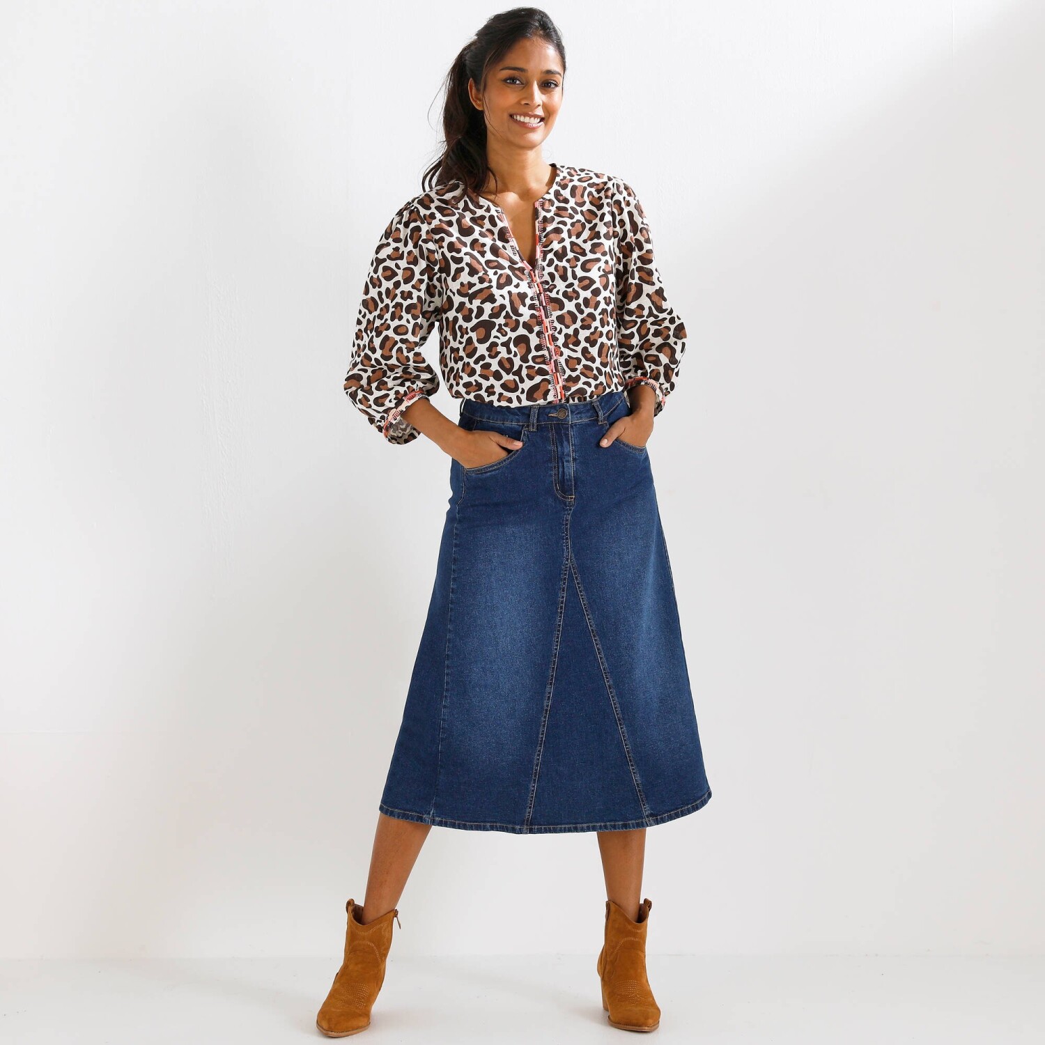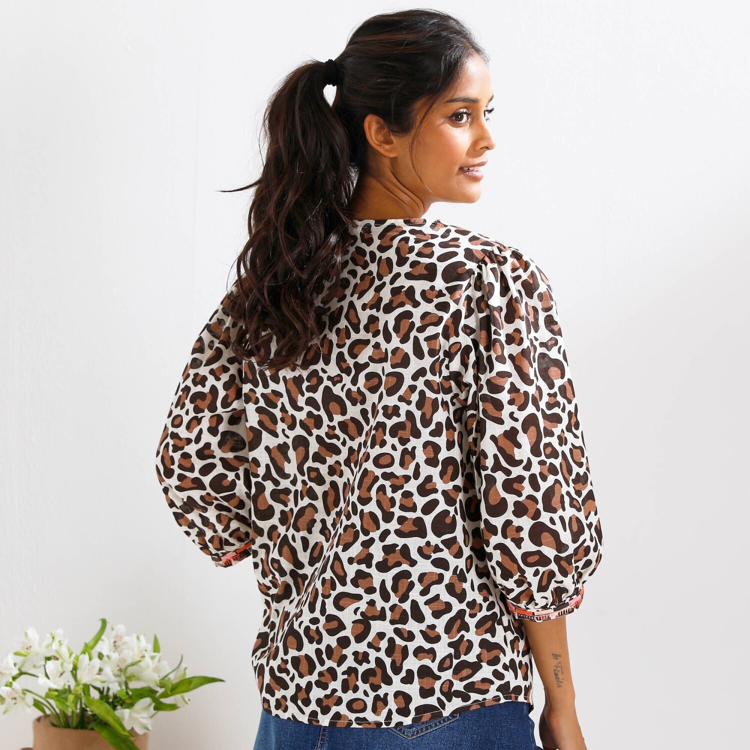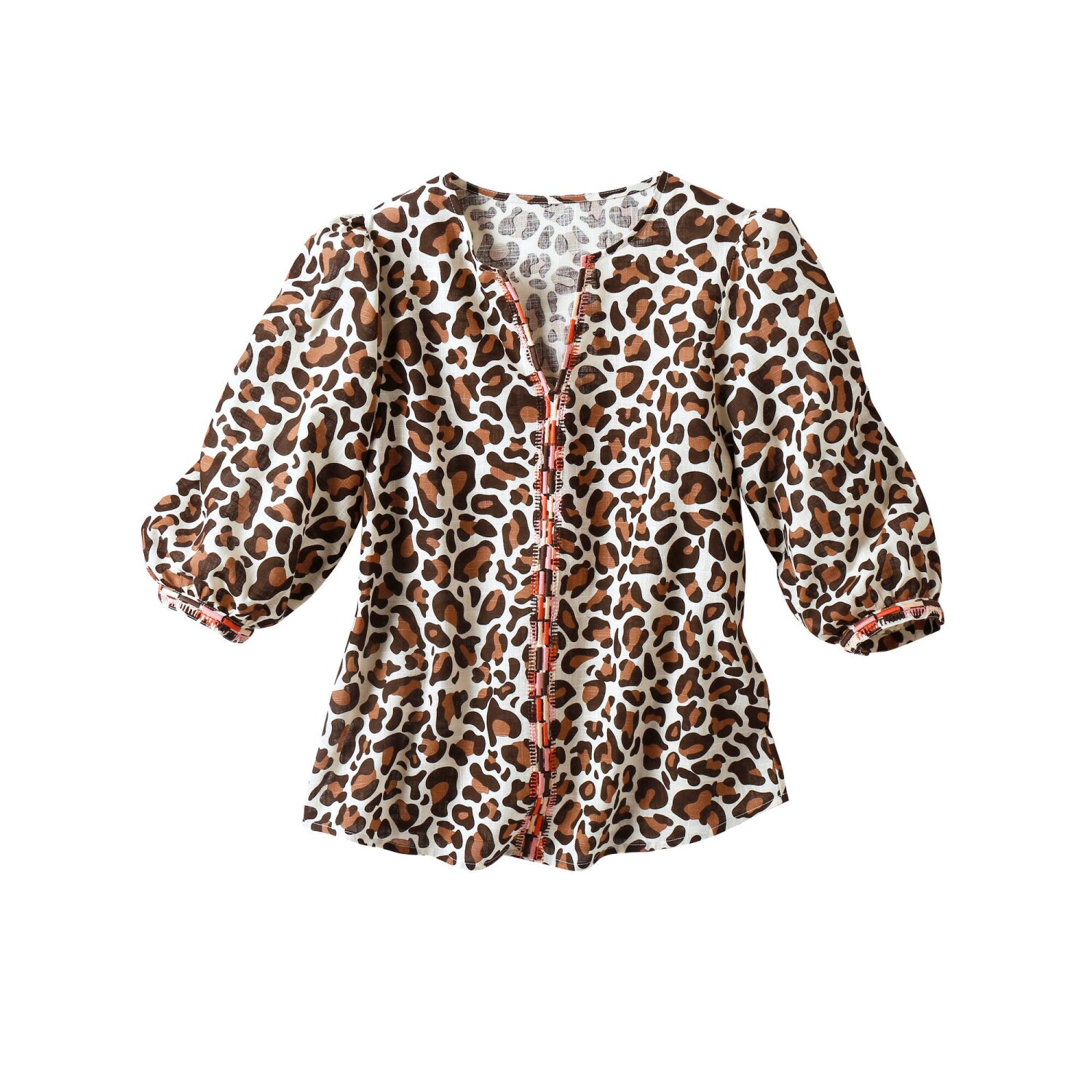 Blúzka s výšivkou a potlačou leoparďej srsti Vás premení na neprehliadnuteľnú ženu! Okrúhly výstrih s prestrihom. Výšivka po celej dĺžke prestrihu a vpredu uprostred. 3/4 rukávy. Manžety s výšivkou. Nariasené plecia.. Mierne oblý dolný lem. Možno prať v práčke.