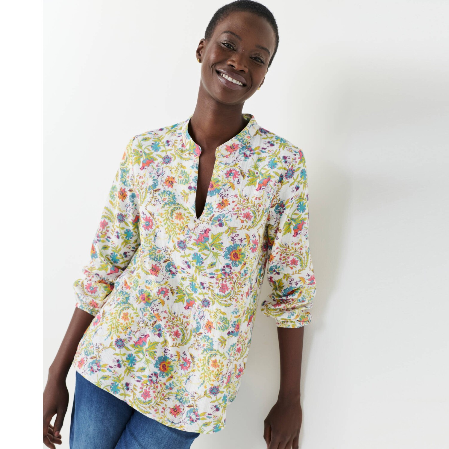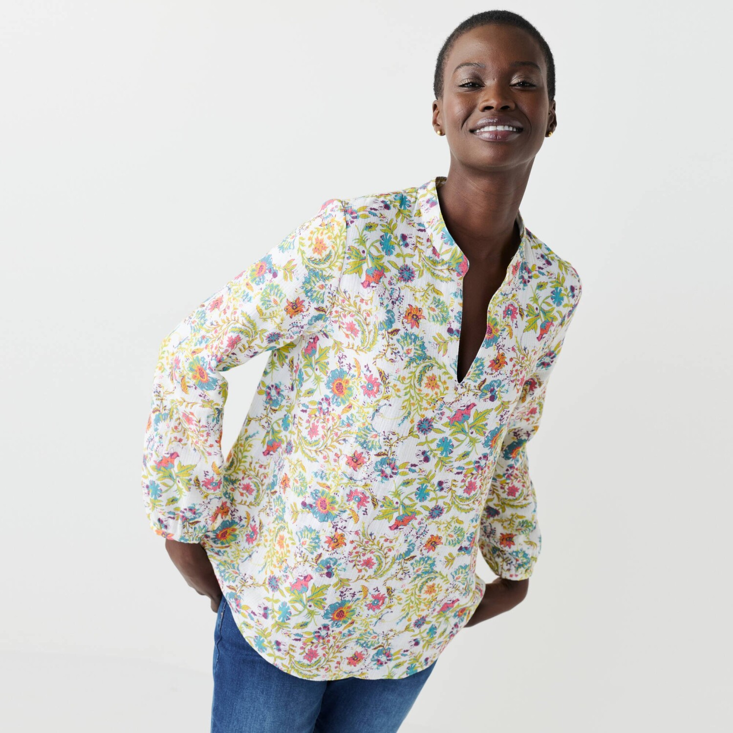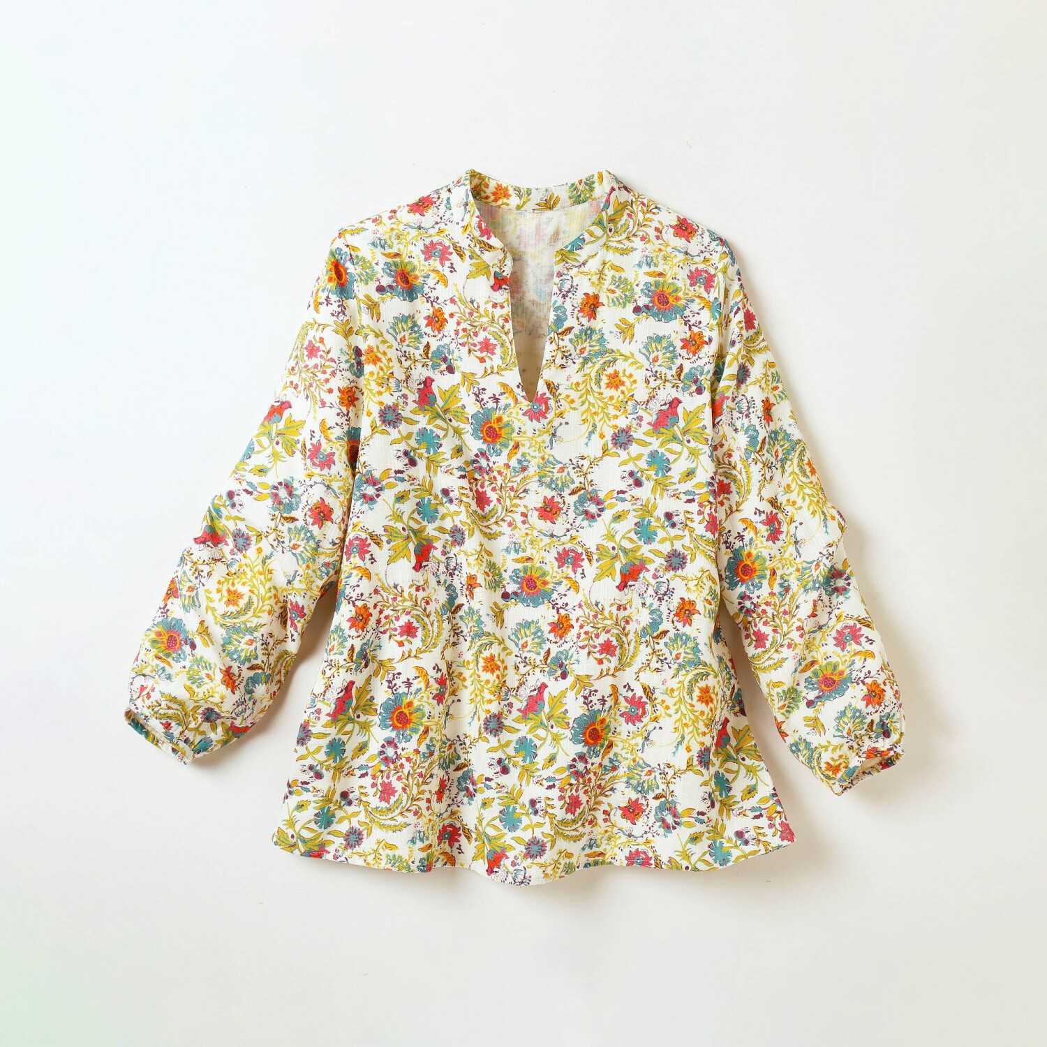 Tunika s potlačou kvetín je skvelá nielen pre elegantné kombinácie. Tuniský výstrih s hlbokým prestrihom do "V". Dlhé nazberané rukávy. Pevné manžety. Rozšírený, Rovný dolný lem. Možno prať v práčke.