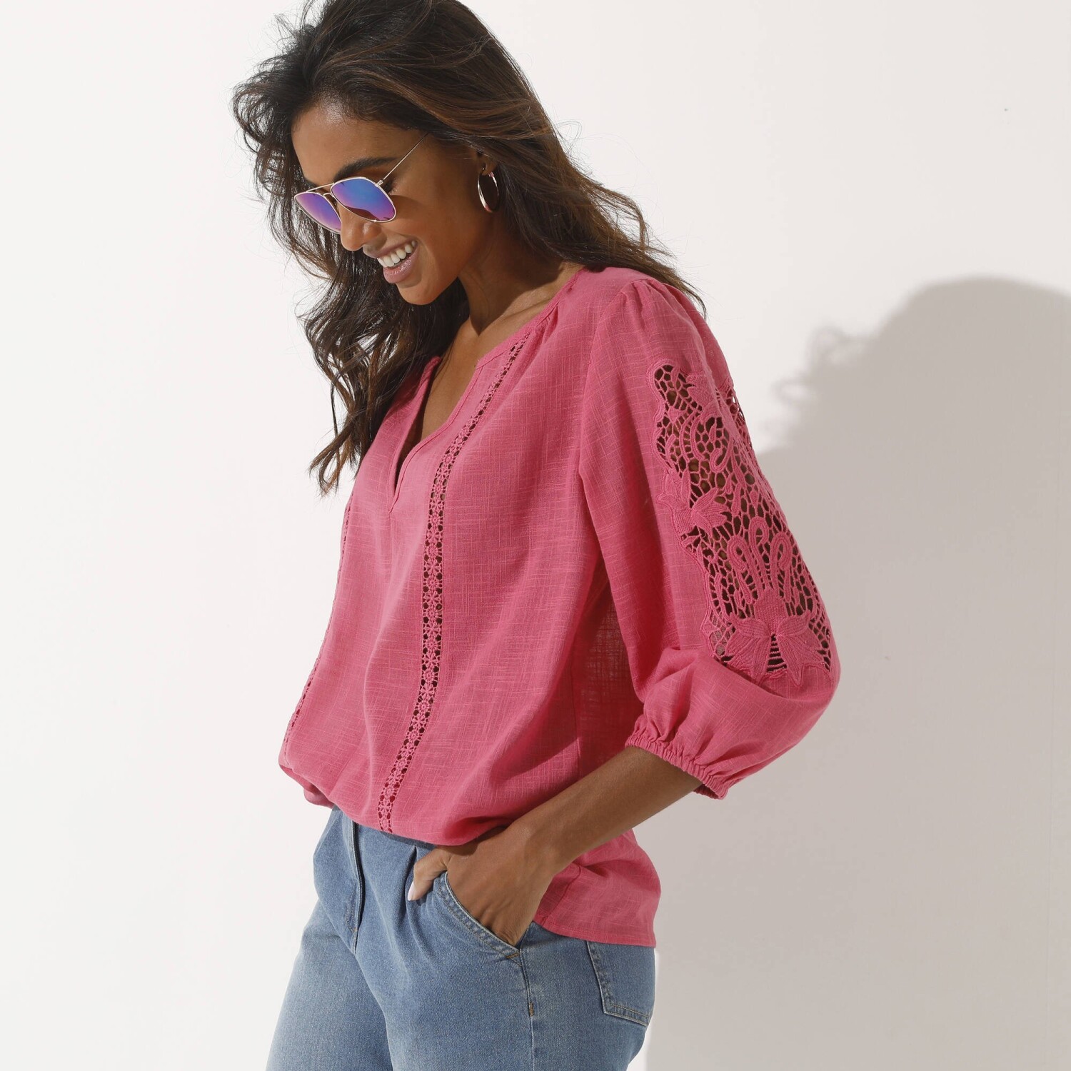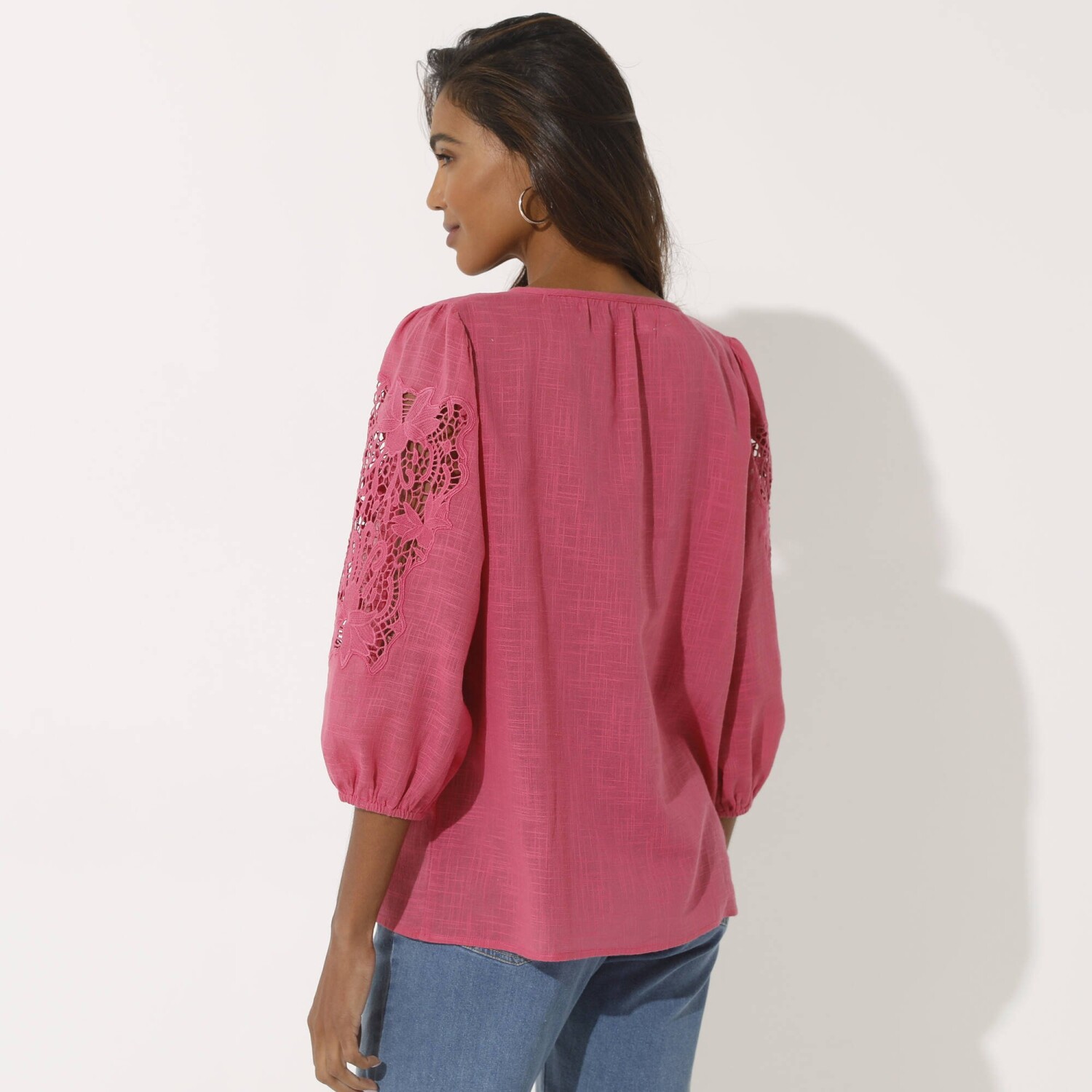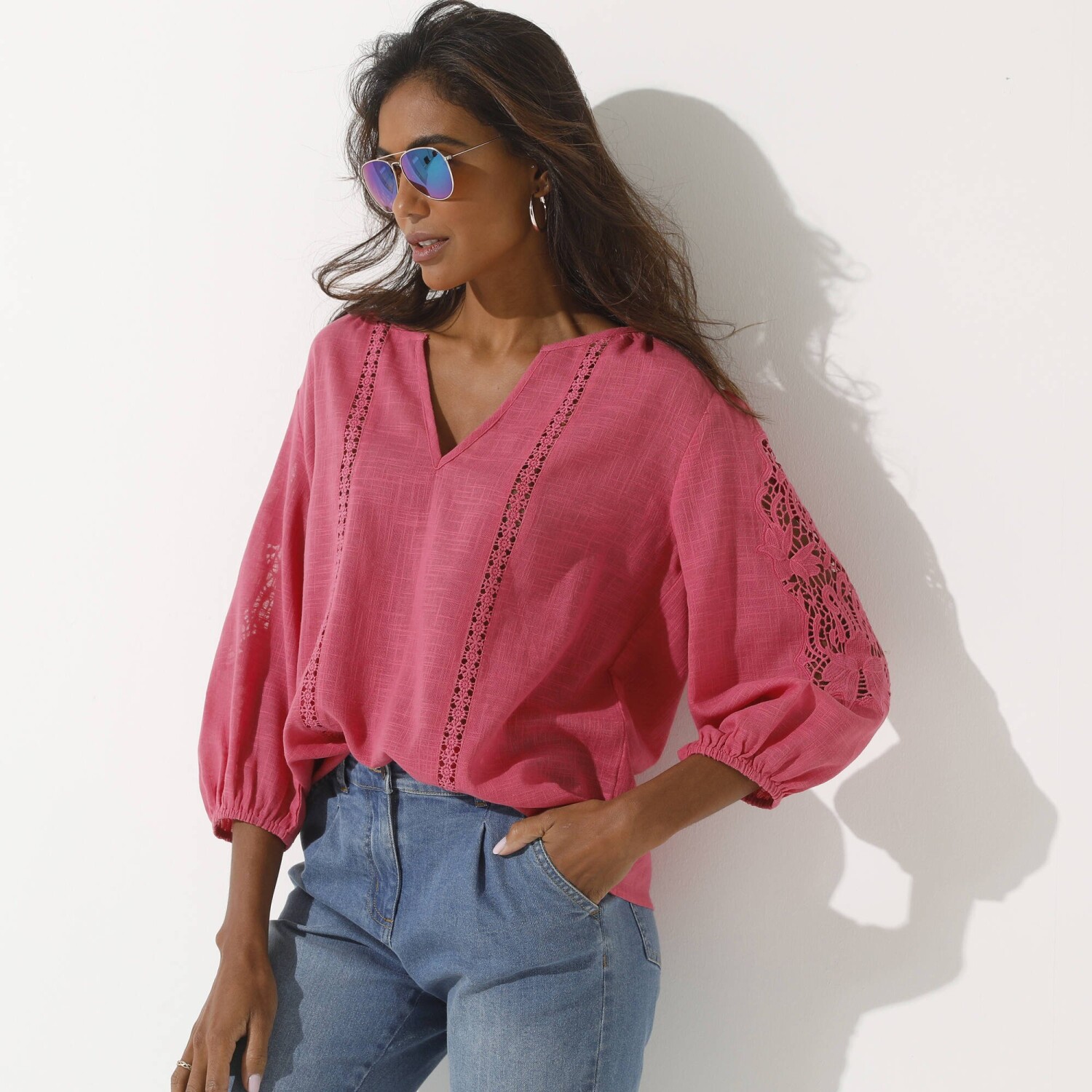Prihlásenie RegistrovaťBavlnená blúzka Vás očarí nadčasovým romantickým štýlom. Okrúhly výstrih s prestrihom. Macramé ažúrový pruh vpredu. Vzadu vo výstrihu nariasená. 3/4 široké rukávy s ažúrovou výšivkou. Pružné konce rukávov. Rovný spodný lem. Možno prať v práčke.
