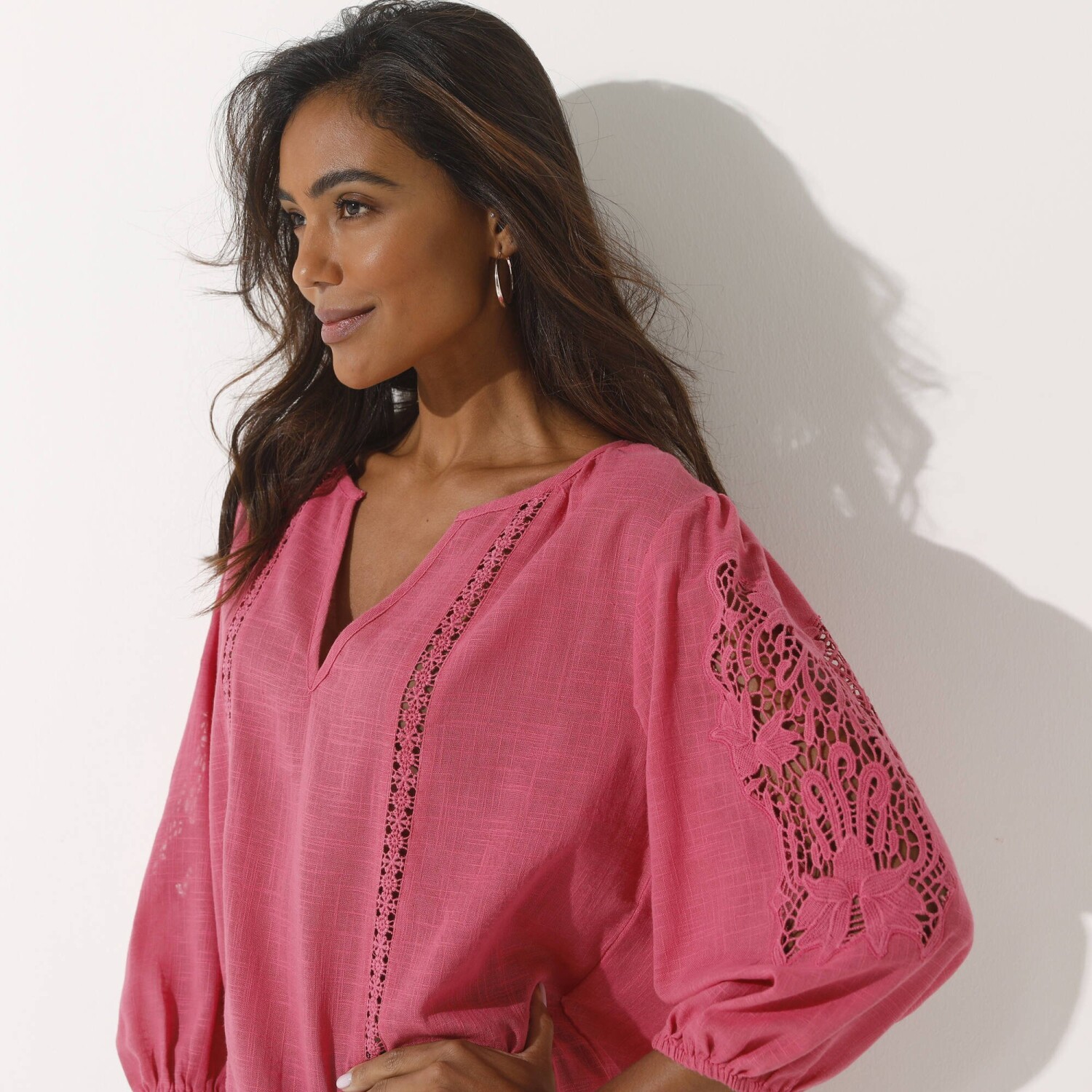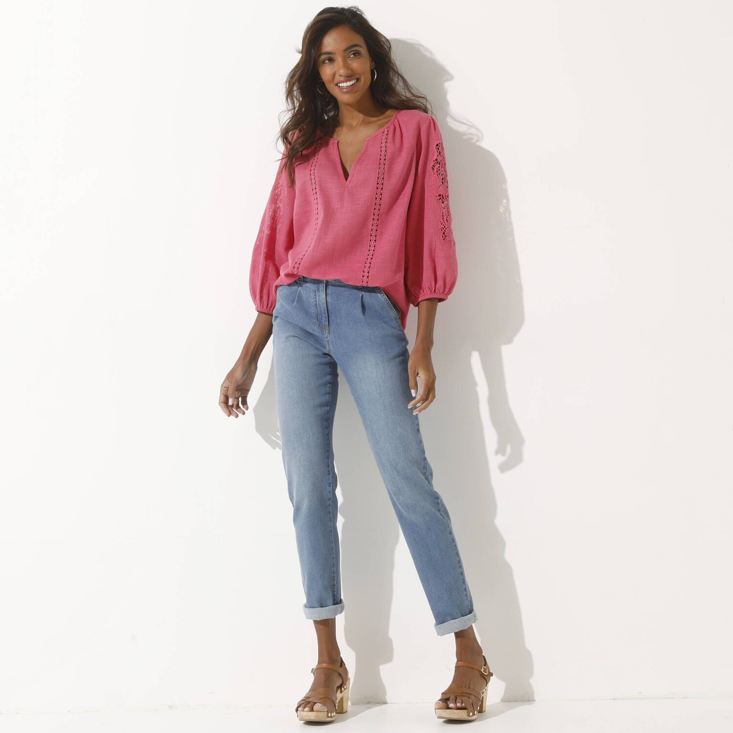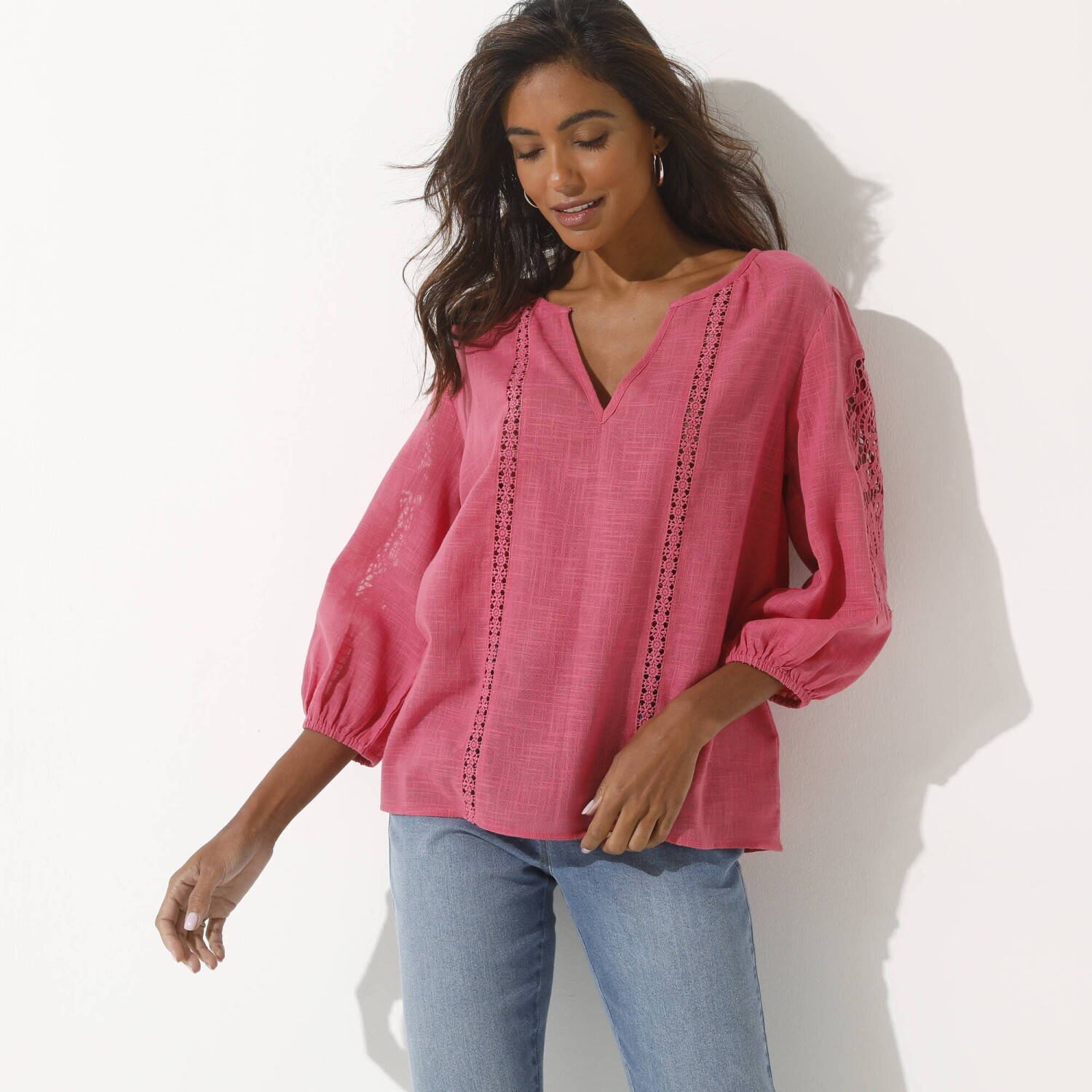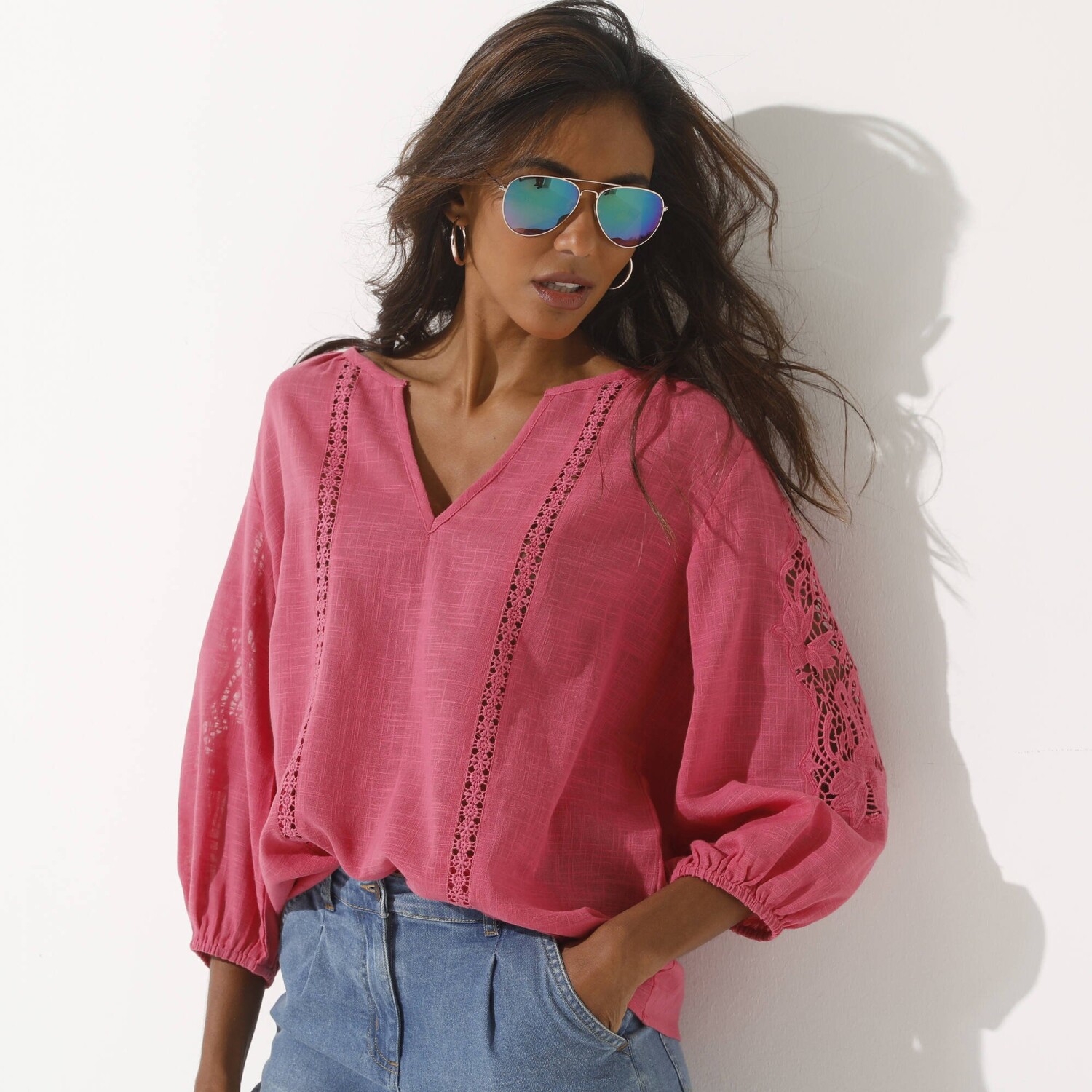 Prihlásenie RegistrovaťBavlnená blúzka Vás očarí nadčasovým romantickým štýlom. Okrúhly výstrih s prestrihom. Macramé ažúrový pruh vpredu. Vzadu vo výstrihu nariasená. 3/4 široké rukávy s ažúrovou výšivkou. Pružné konce rukávov. Rovný spodný lem. Možno prať v práčke.
