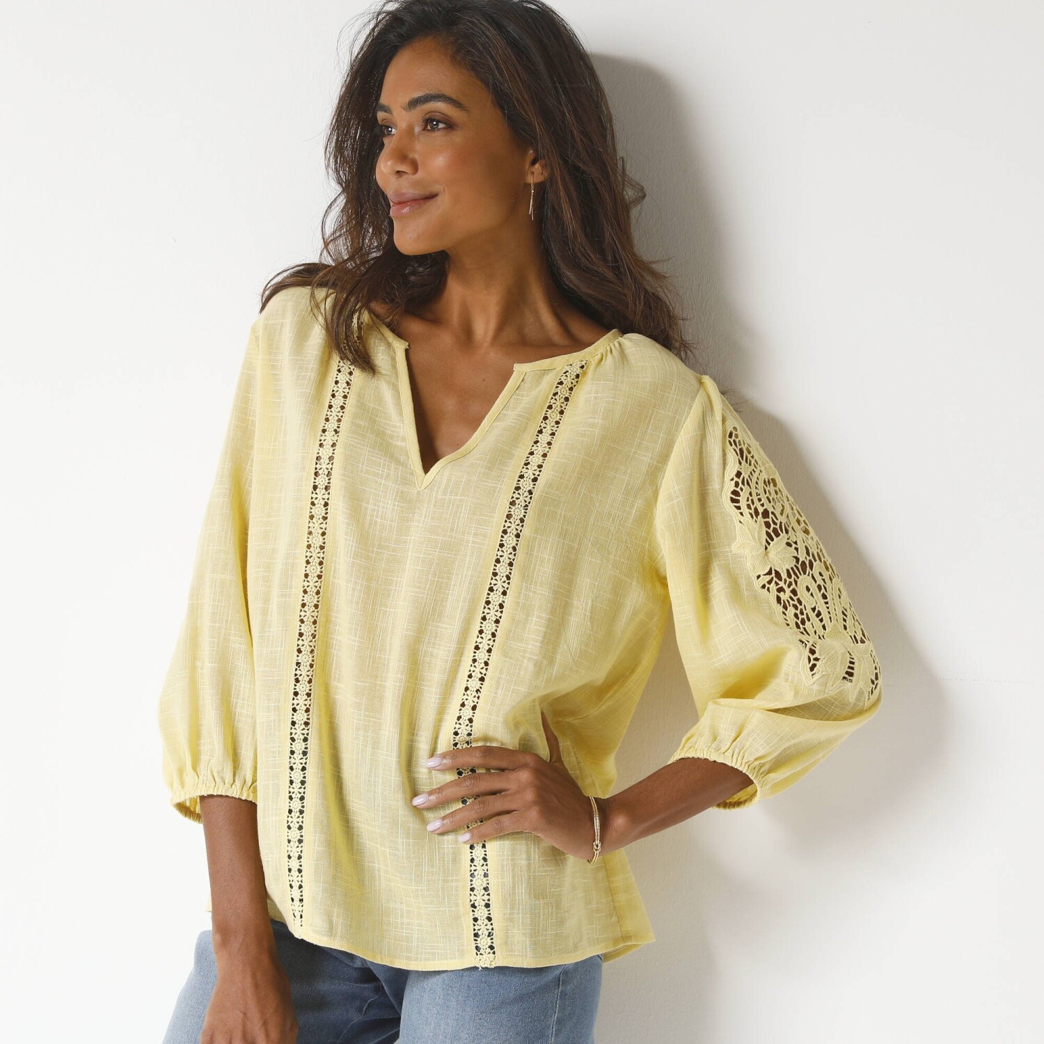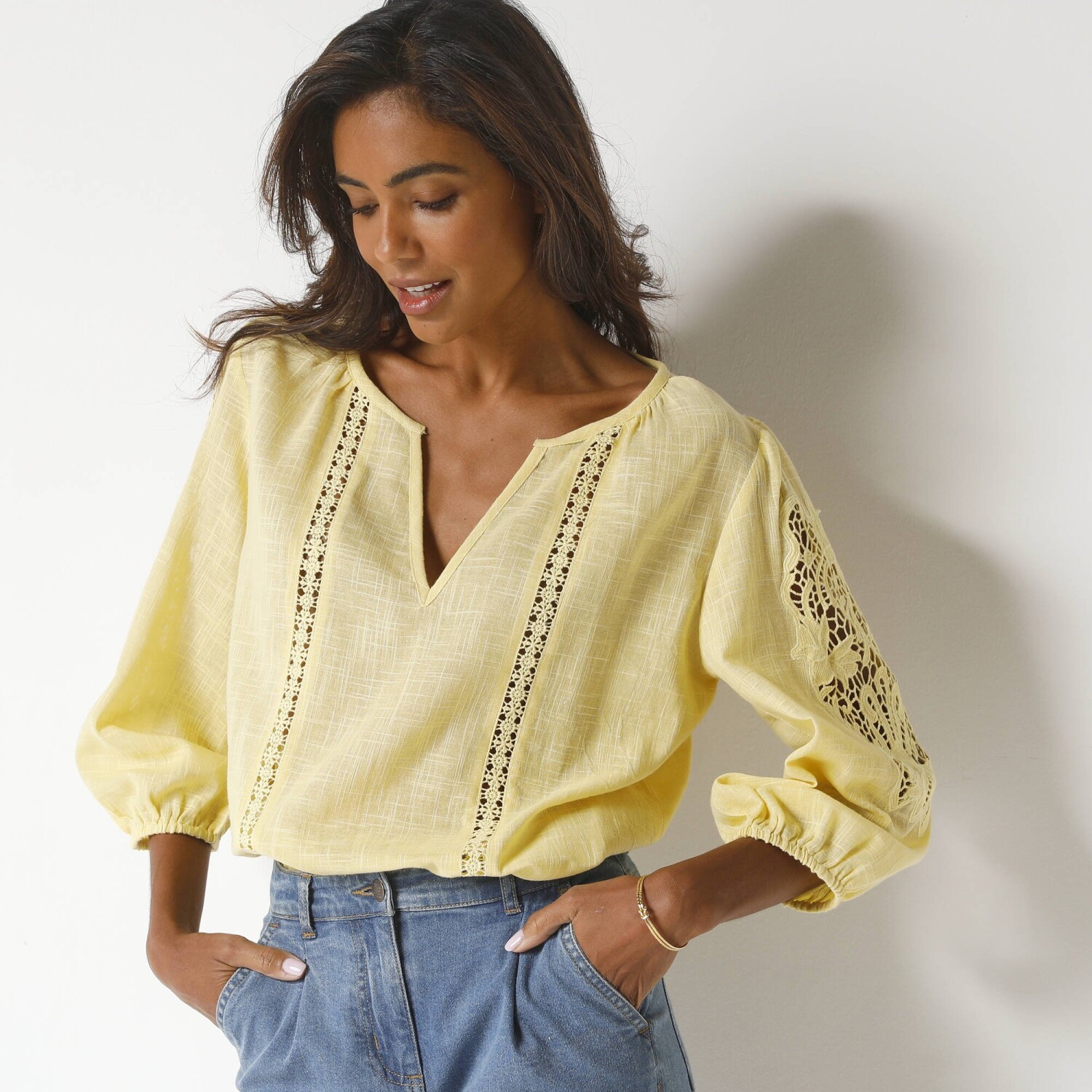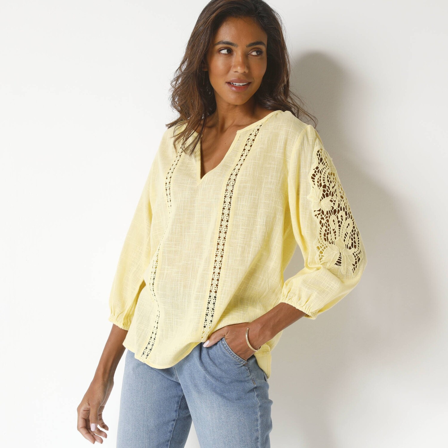 Prihlásenie RegistrovaťBavlnená blúzka Vás očarí nadčasovým romantickým štýlom. Okrúhly výstrih s prestrihom. Macramé ažúrový pruh vpredu. Vzadu vo výstrihu nariasená. 3/4 široké rukávy s ažúrovou výšivkou. Pružné konce rukávov. Rovný spodný lem. Možno prať v práčke.