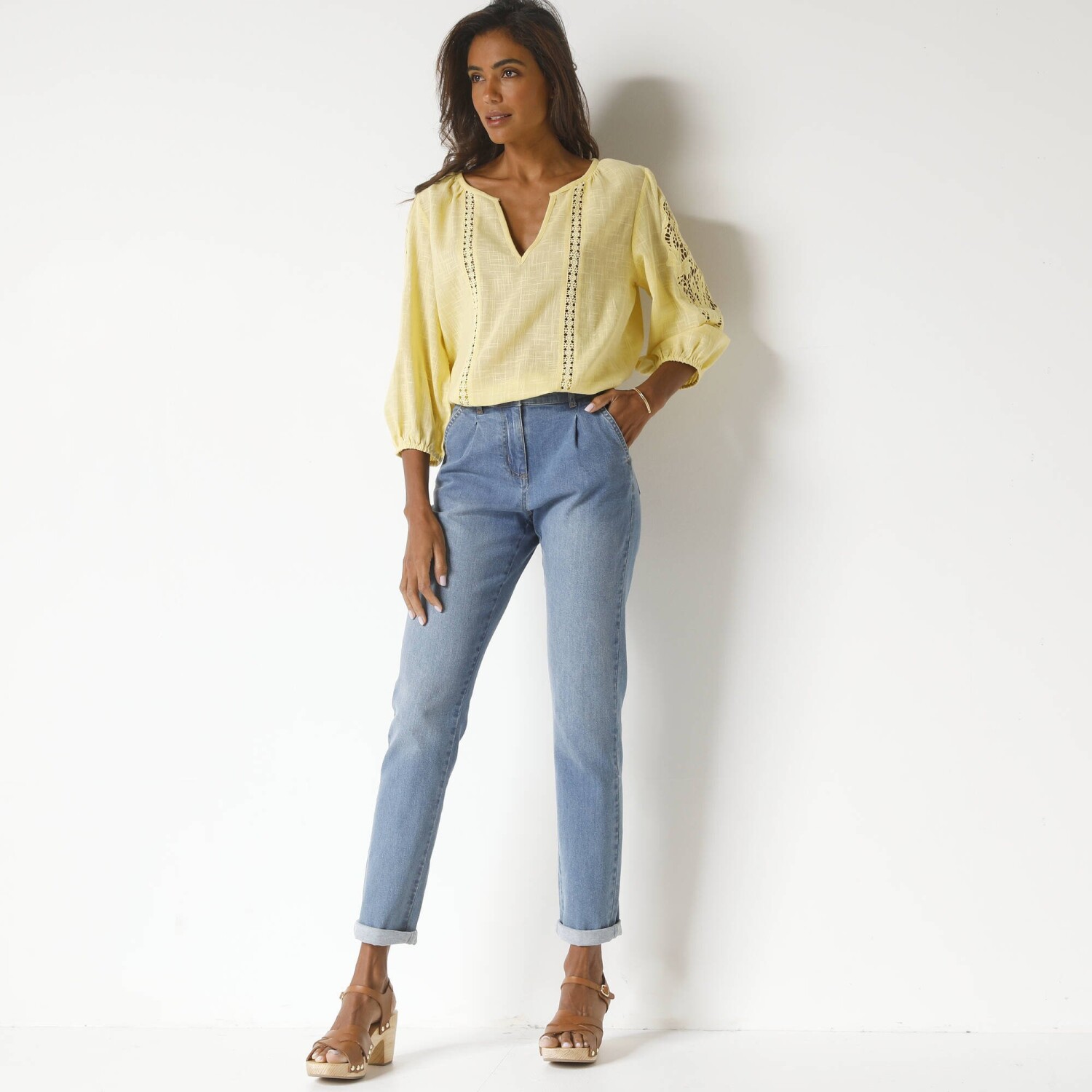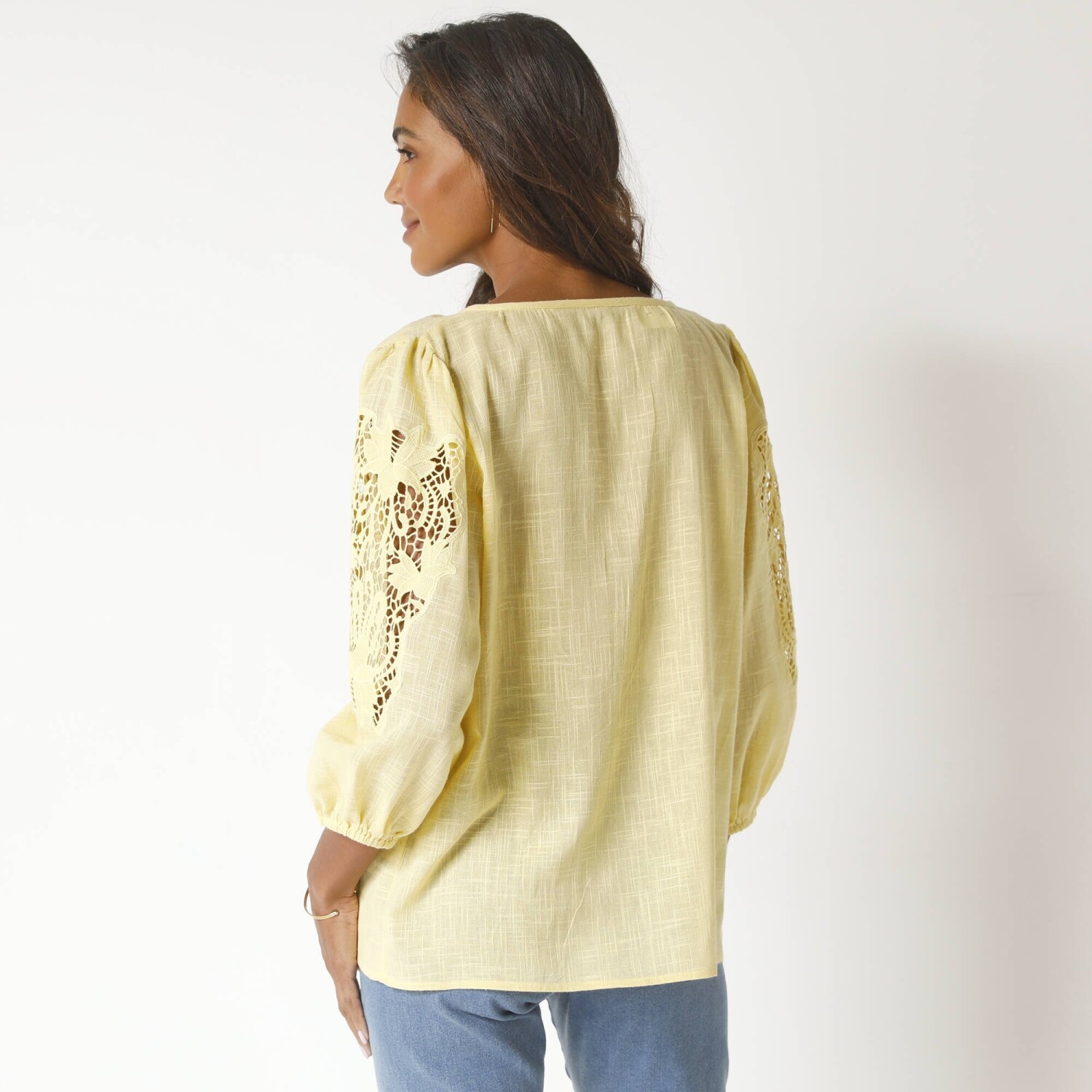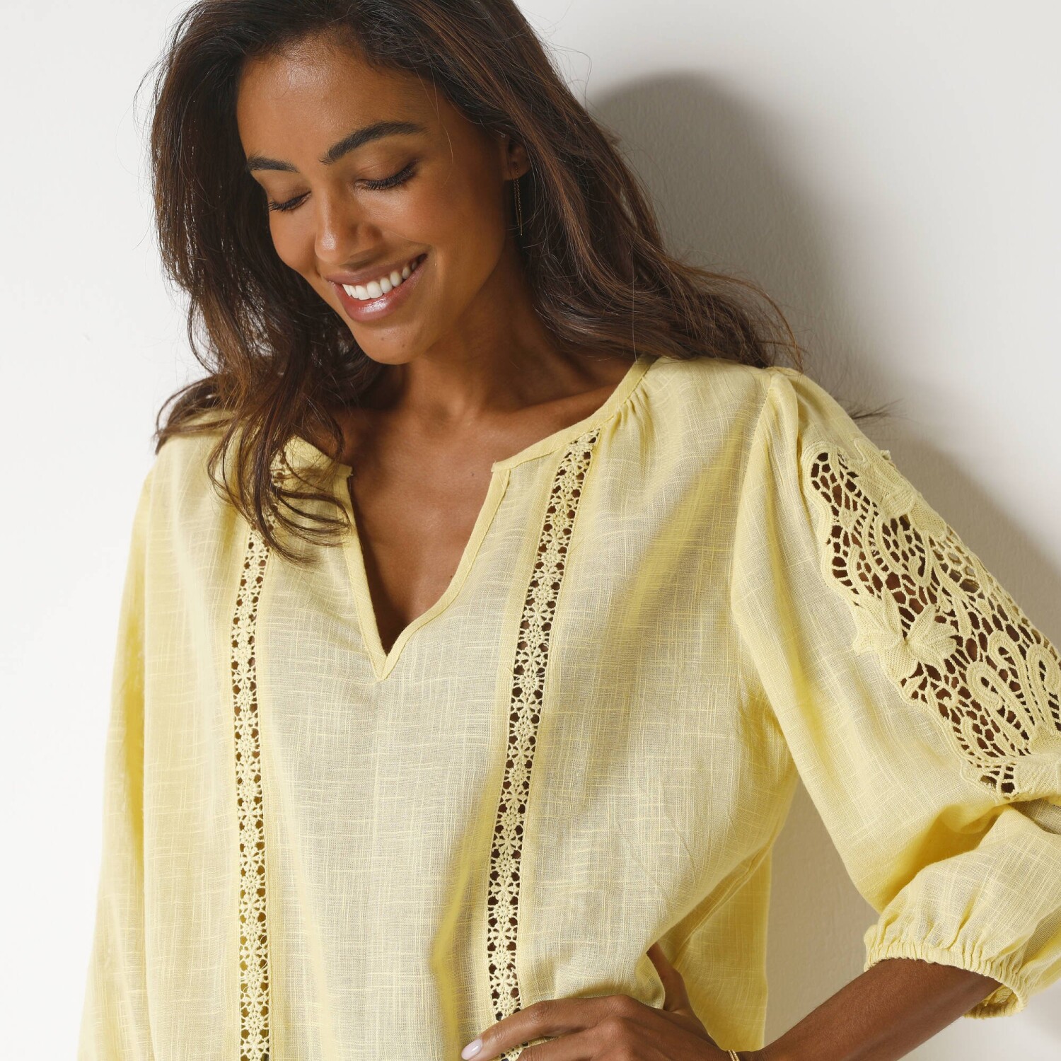 Prihlásenie RegistrovaťBavlnená blúzka Vás očarí nadčasovým romantickým štýlom. Okrúhly výstrih s prestrihom. Macramé ažúrový pruh vpredu. Vzadu vo výstrihu nariasená. 3/4 široké rukávy s ažúrovou výšivkou. Pružné konce rukávov. Rovný spodný lem. Možno prať v práčke.