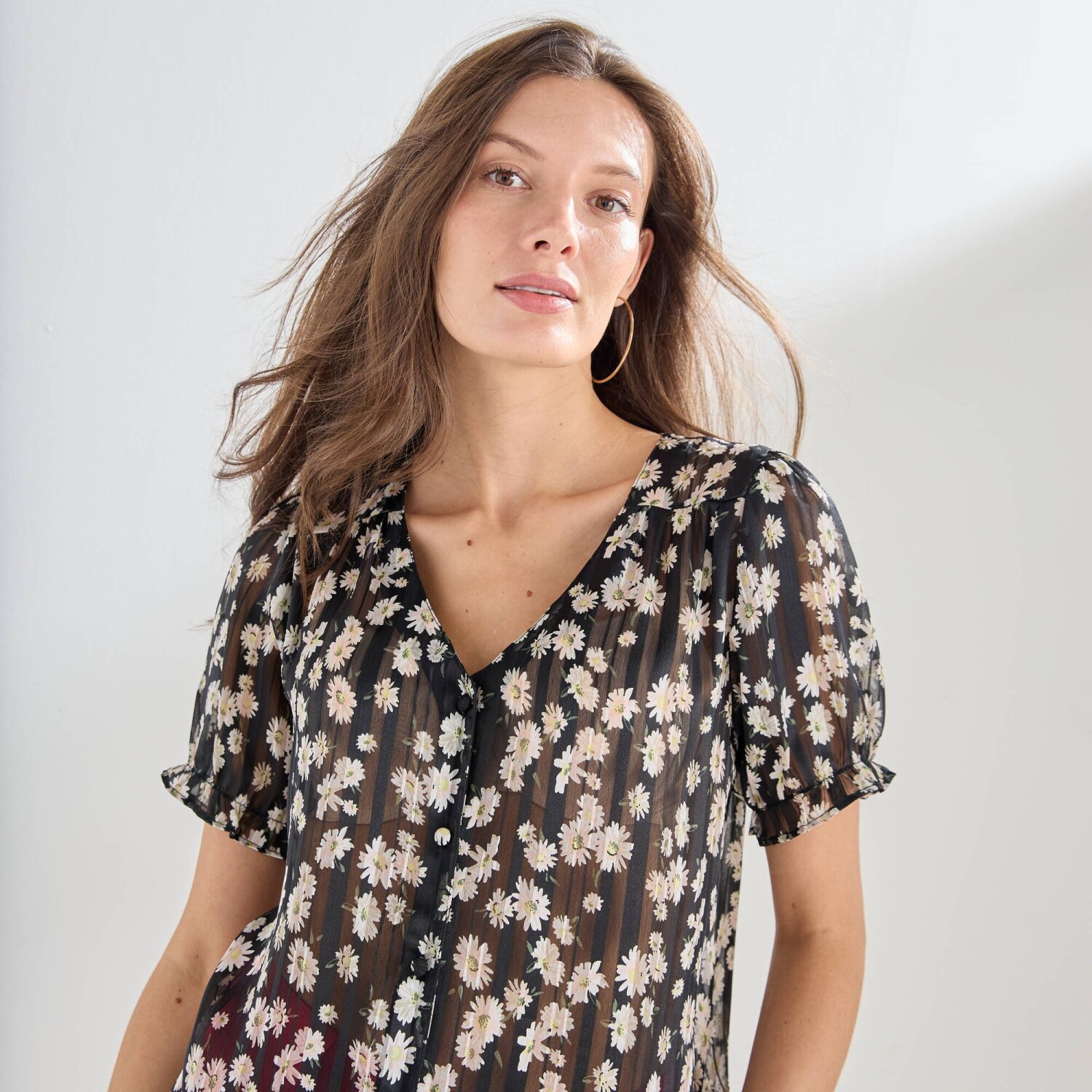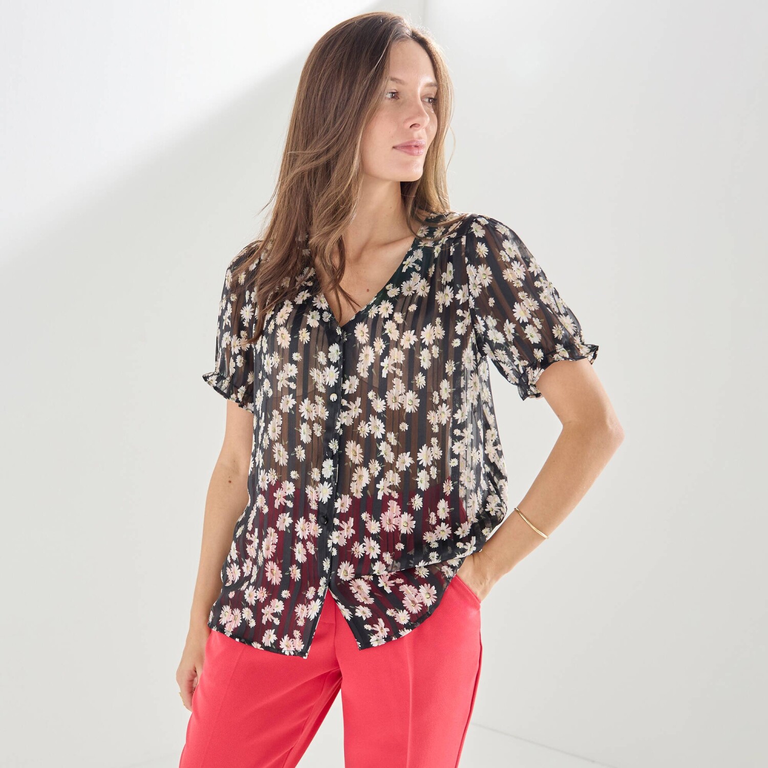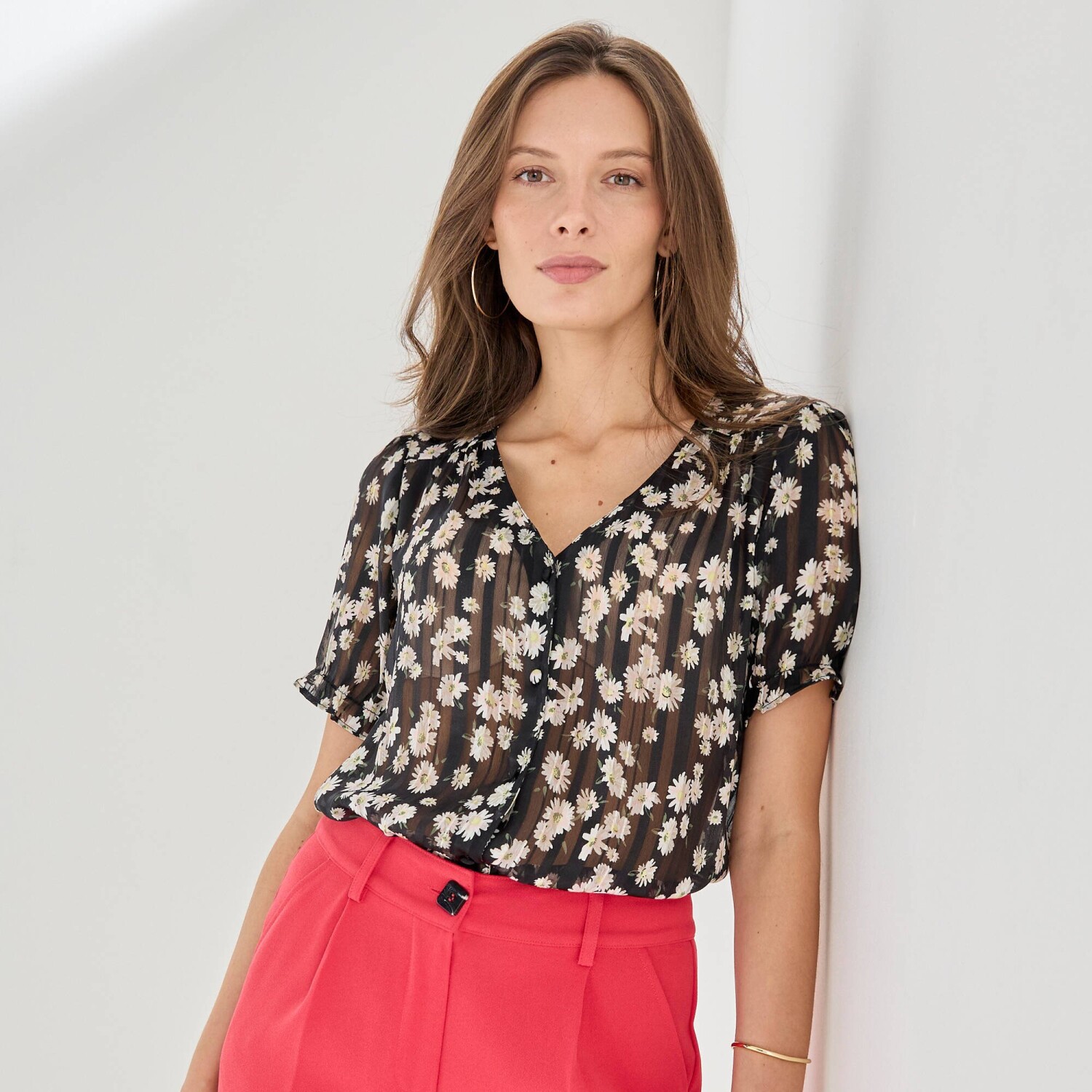 Košeľová blúzka s kvetinovým vzorom stavia na svoj city look! Okrúhly výstrih. Vpredu gombíková léga. Vpredu ramená s členitým strihom nariasením. Nariasené plecia. Krátke nazberané rukávy s pružným zakončením. Rovný dolný lem. Možno prať v práčke.