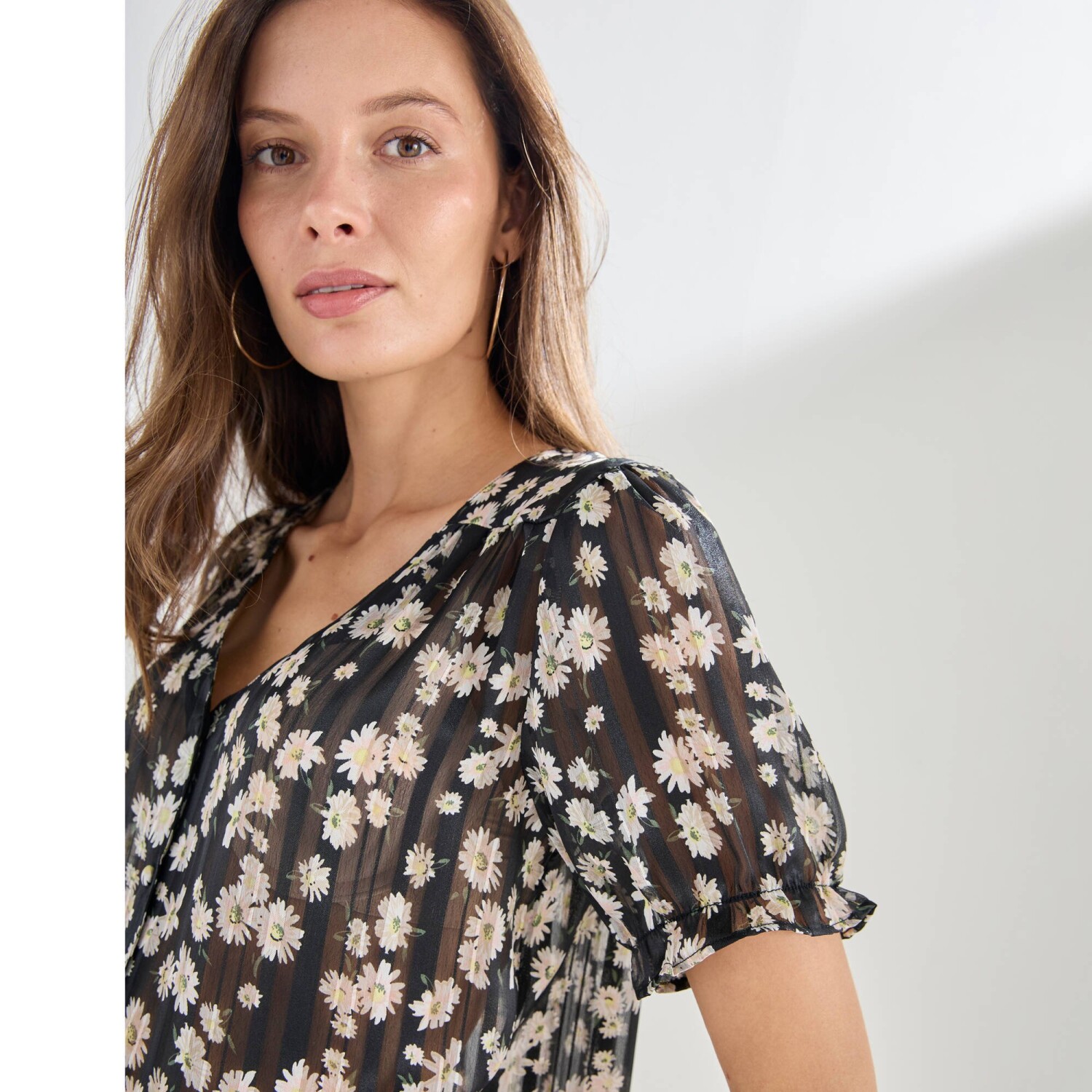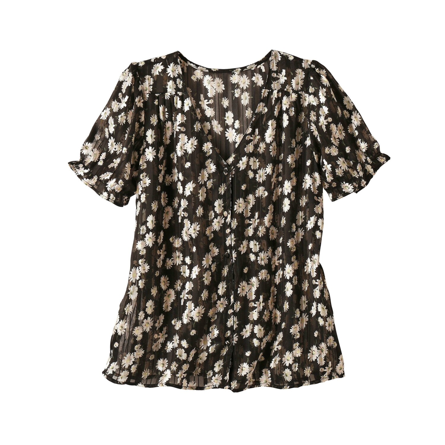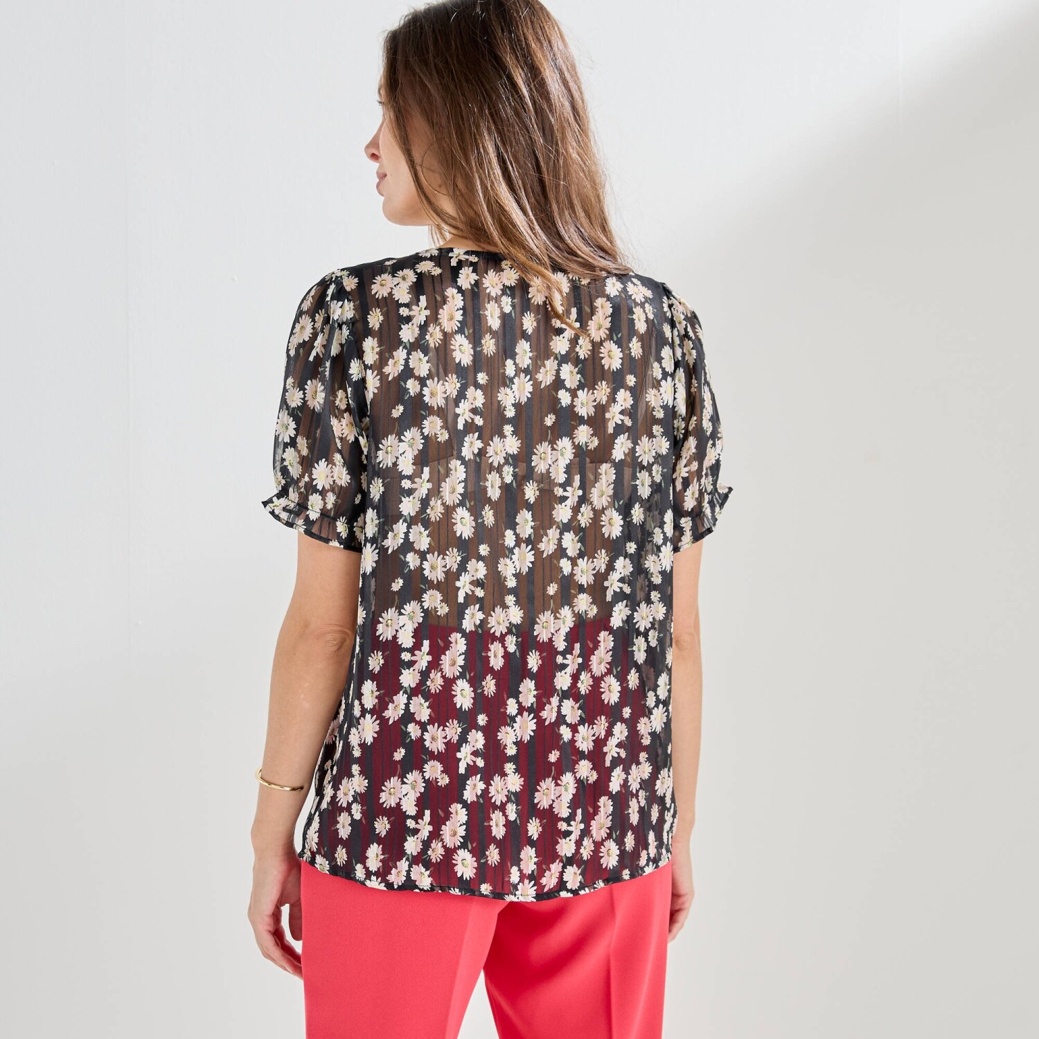 Košeľová blúzka s kvetinovým vzorom stavia na svoj city look! Okrúhly výstrih. Vpredu gombíková léga. Vpredu ramená s členitým strihom nariasením. Nariasené plecia. Krátke nazberané rukávy s pružným zakončením. Rovný dolný lem. Možno prať v práčke.