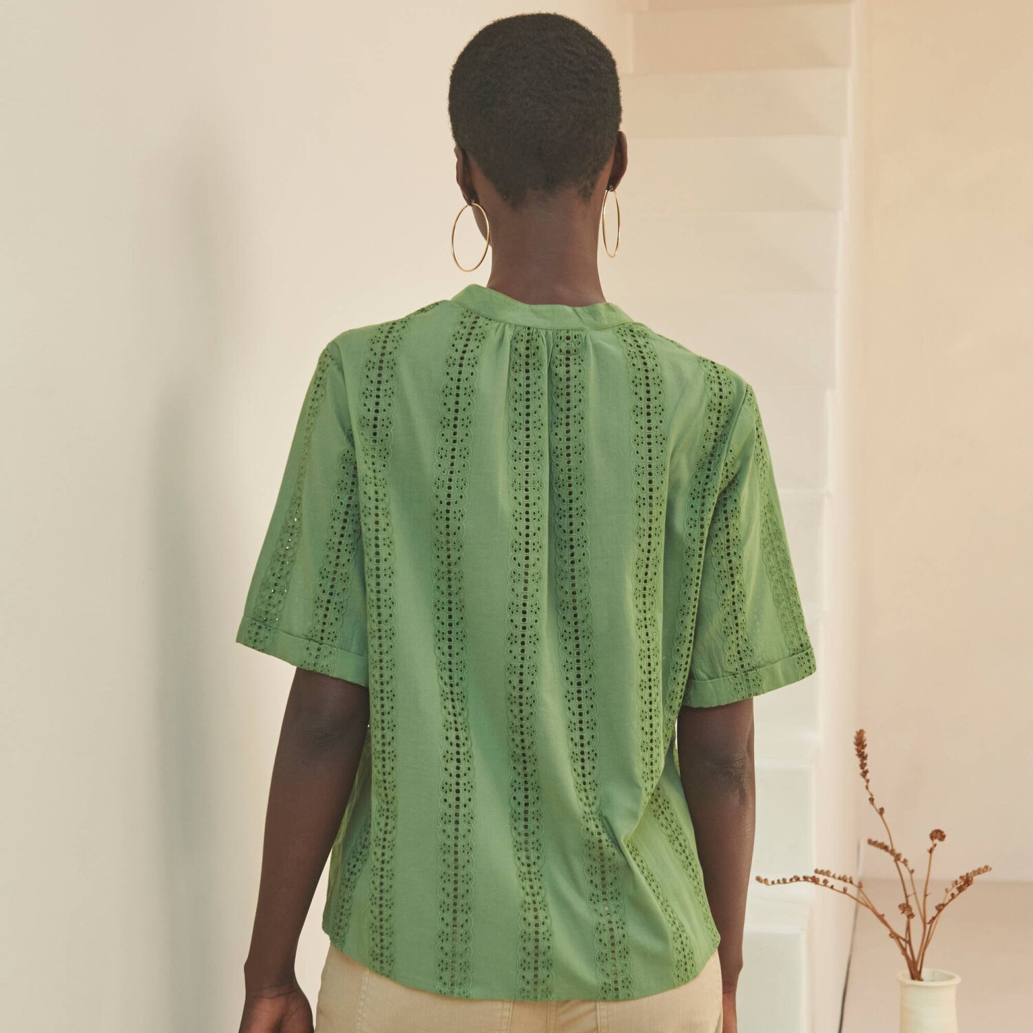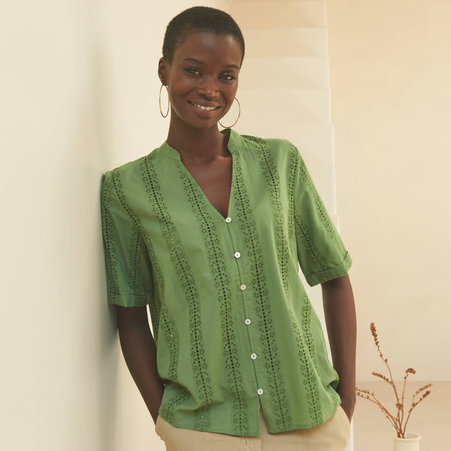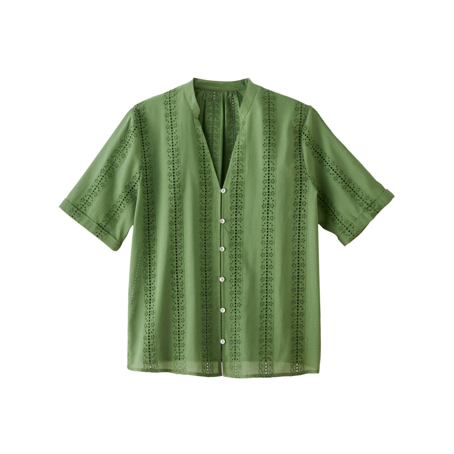 Očarujúca blúzka s madeirovou výšivku je ušitá zo vzdušného materiálu. Tuniský výstrih s prestrihom do "V". Vpredu gombíková léga a pružné očká. Krátke rukávy s ohrnutím. Vzadu pod výstrihom nariasená. Rovný dolný lem. Možno prať v práčke.