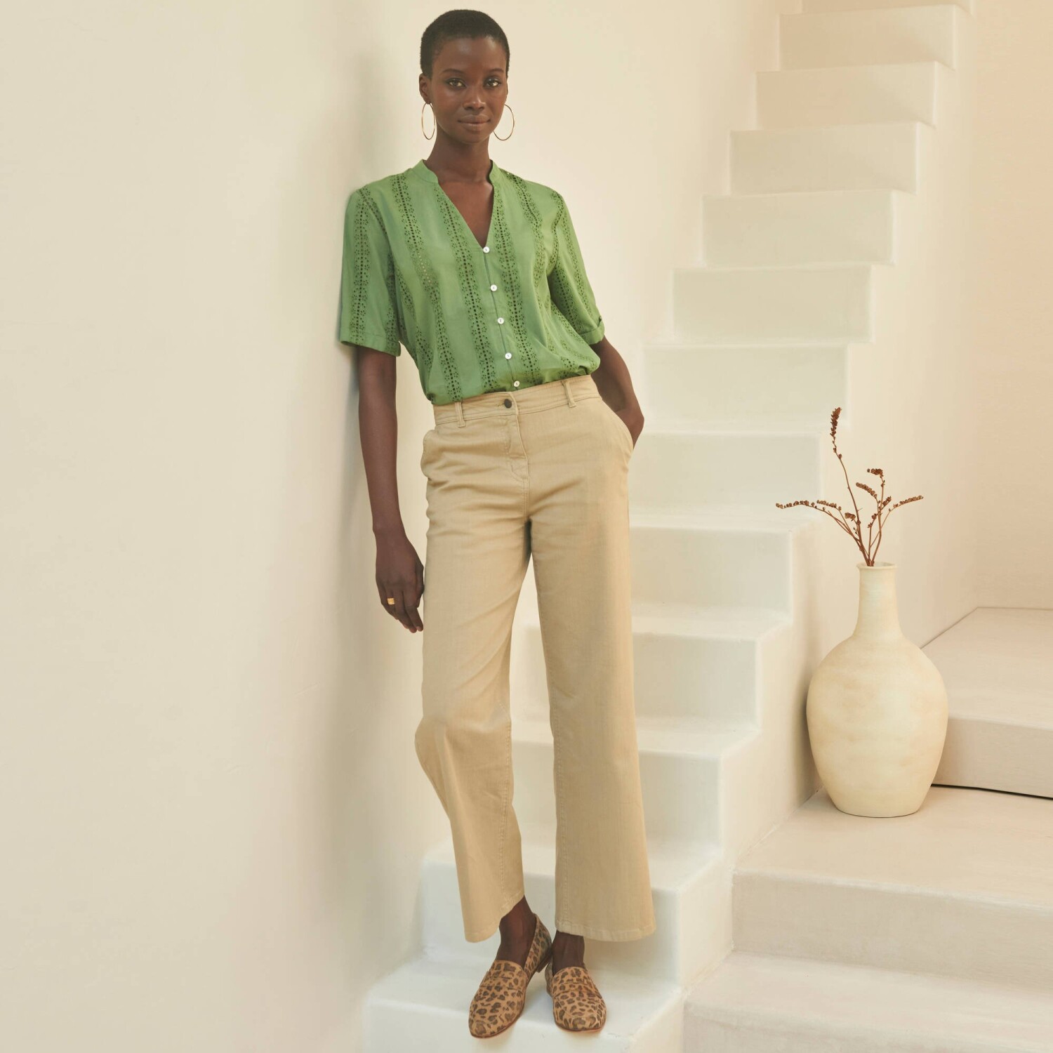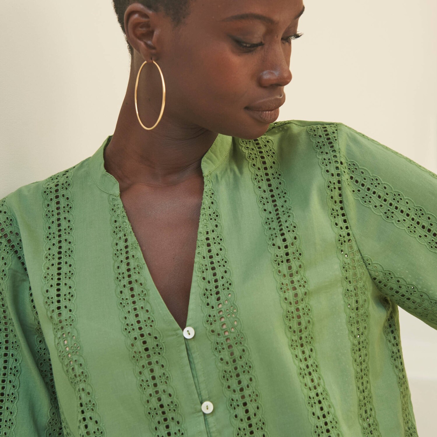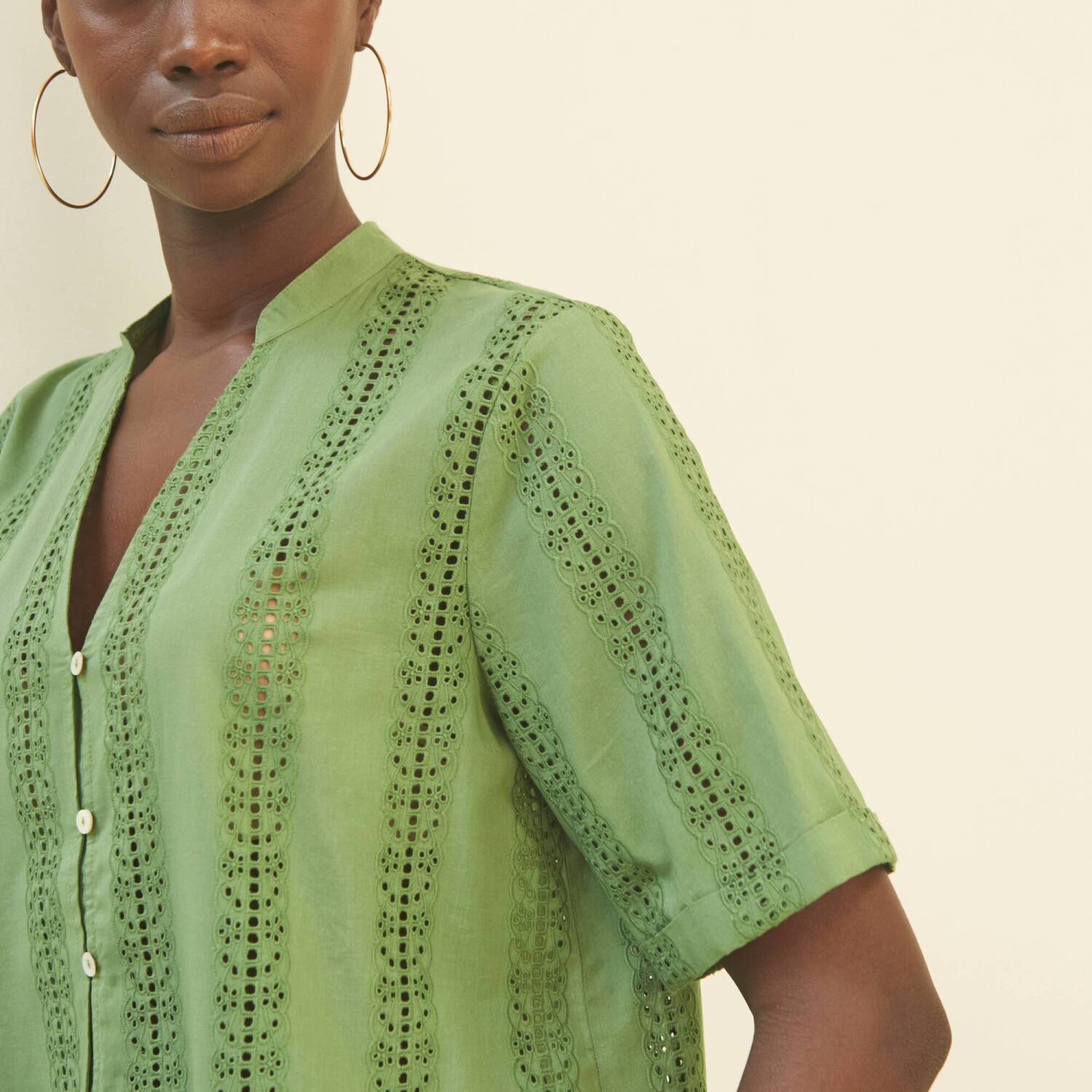 Očarujúca blúzka s madeirovou výšivku je ušitá zo vzdušného materiálu. Tuniský výstrih s prestrihom do "V". Vpredu gombíková léga a pružné očká. Krátke rukávy s ohrnutím. Vzadu pod výstrihom nariasená. Rovný dolný lem. Možno prať v práčke.