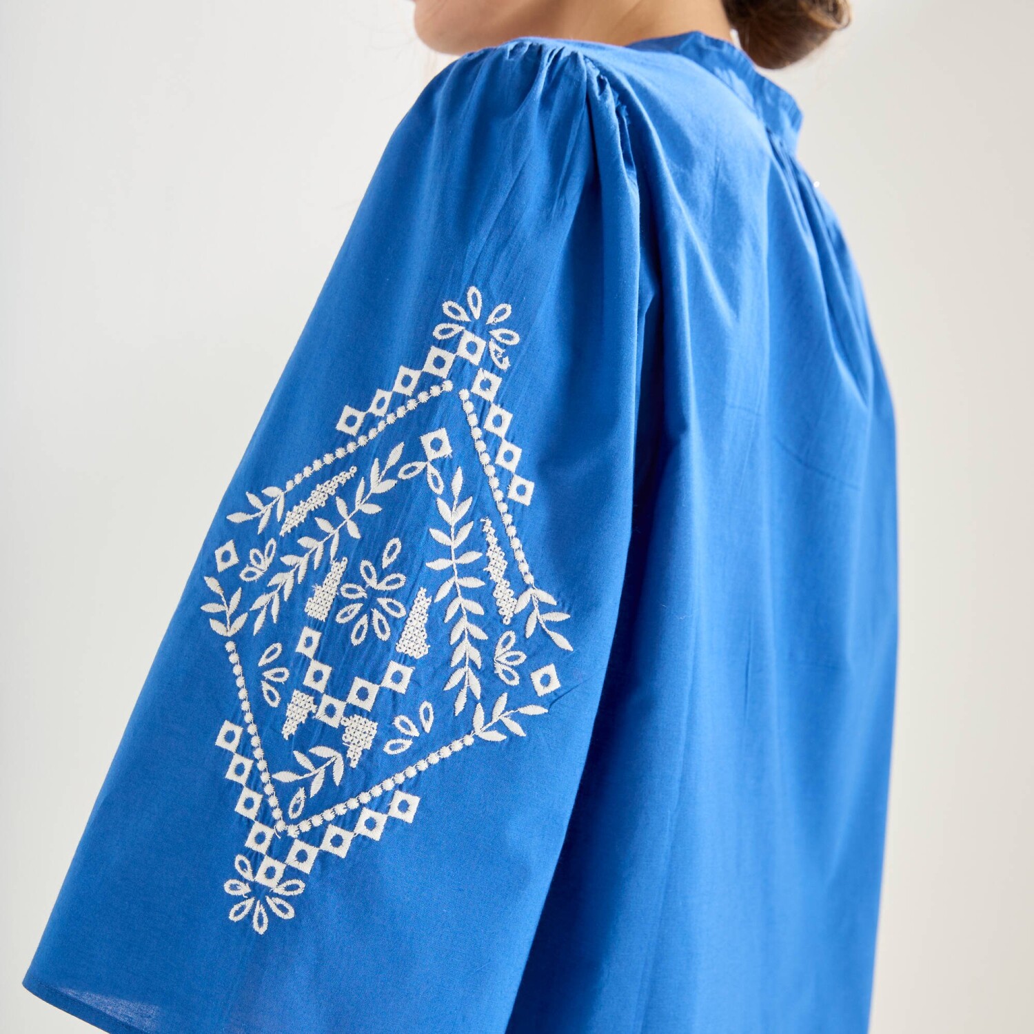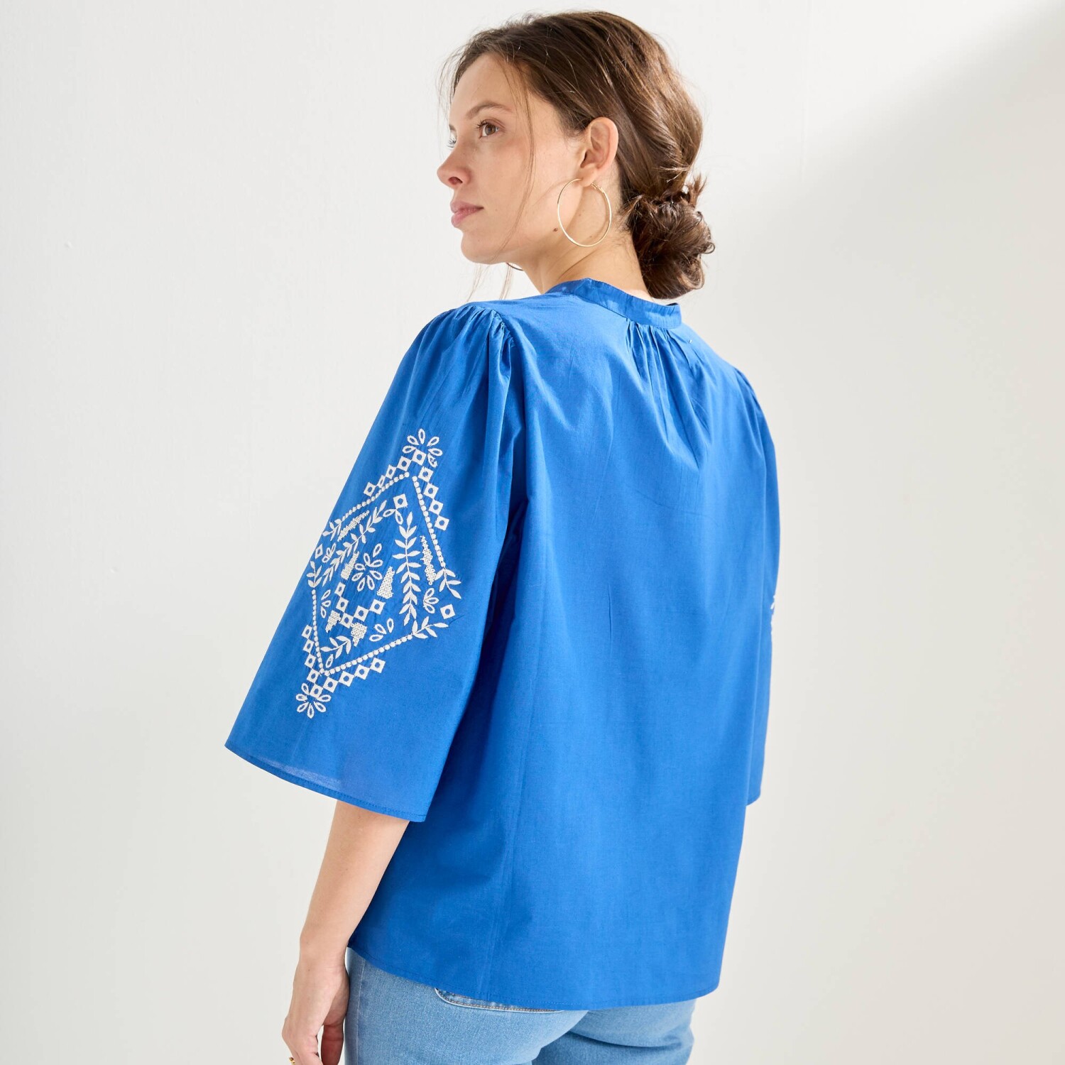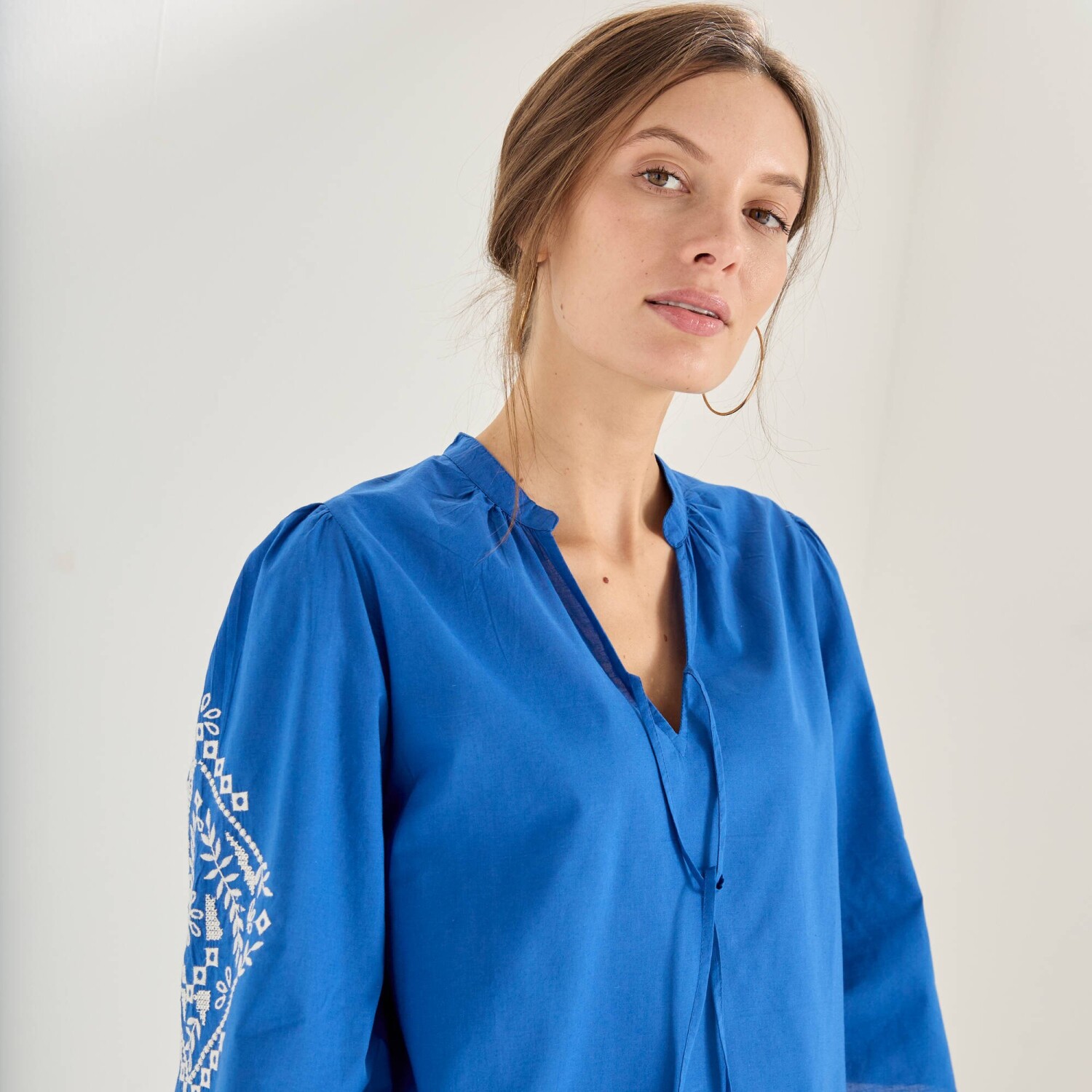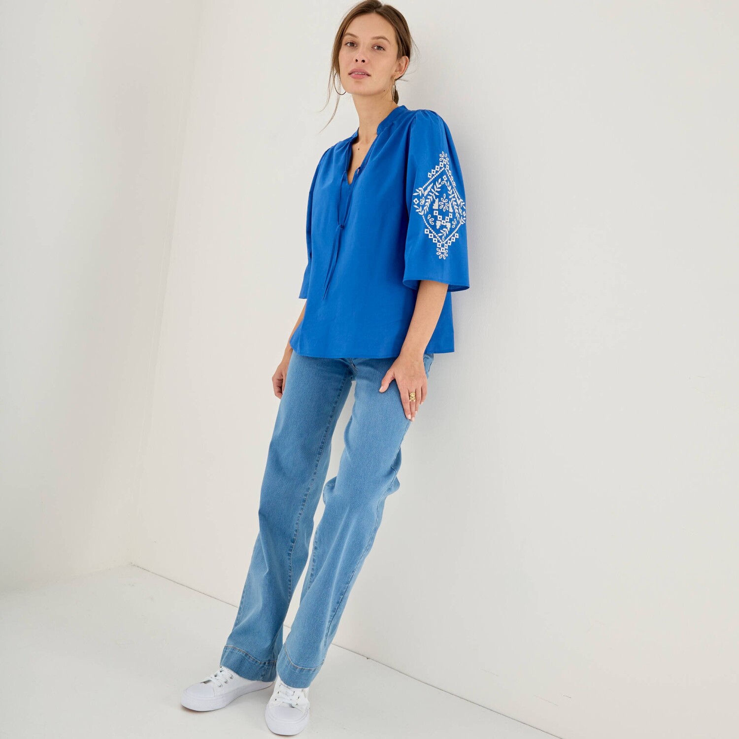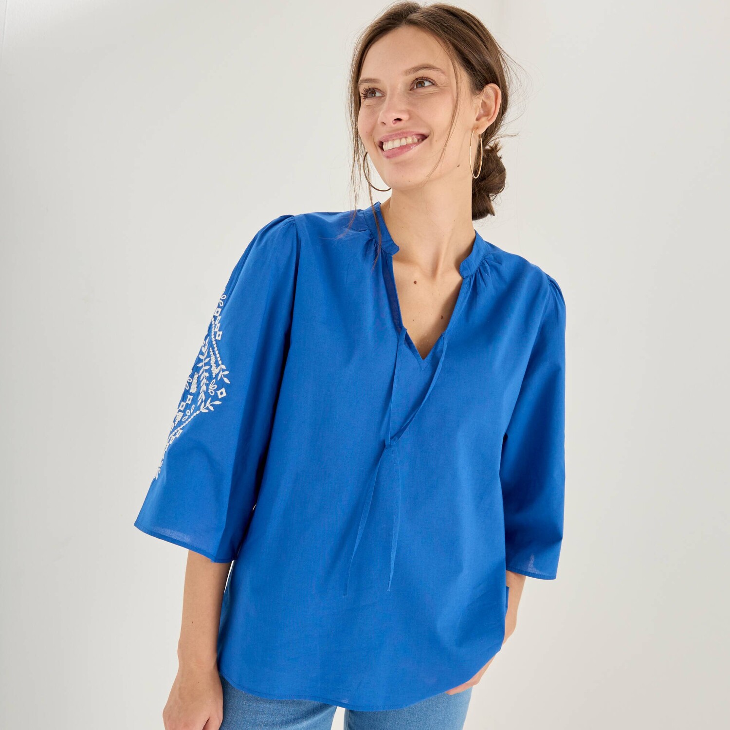 Blúzka s výšivkou a ozdobným výstrihom so strapcami