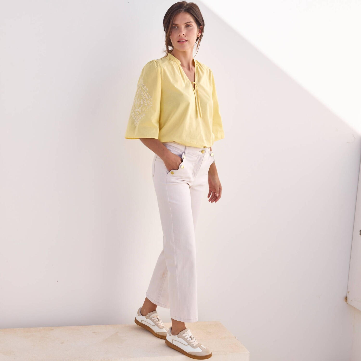 Už viac nehľadajte! Máme pre Vás ten pravý letný kúsok - širokú blúzku s vyšívanými 3/4 rukávmi. Tuniský výstrih s nariasením vpredu a vzadu. Prestrih do "V" so šnúrkou na zaviazanie. 3/4 široké rukávy s kontrastnou výšivkou. Nariasené plecia. Mierne oblý dolný lem. Možno prať v práčke.