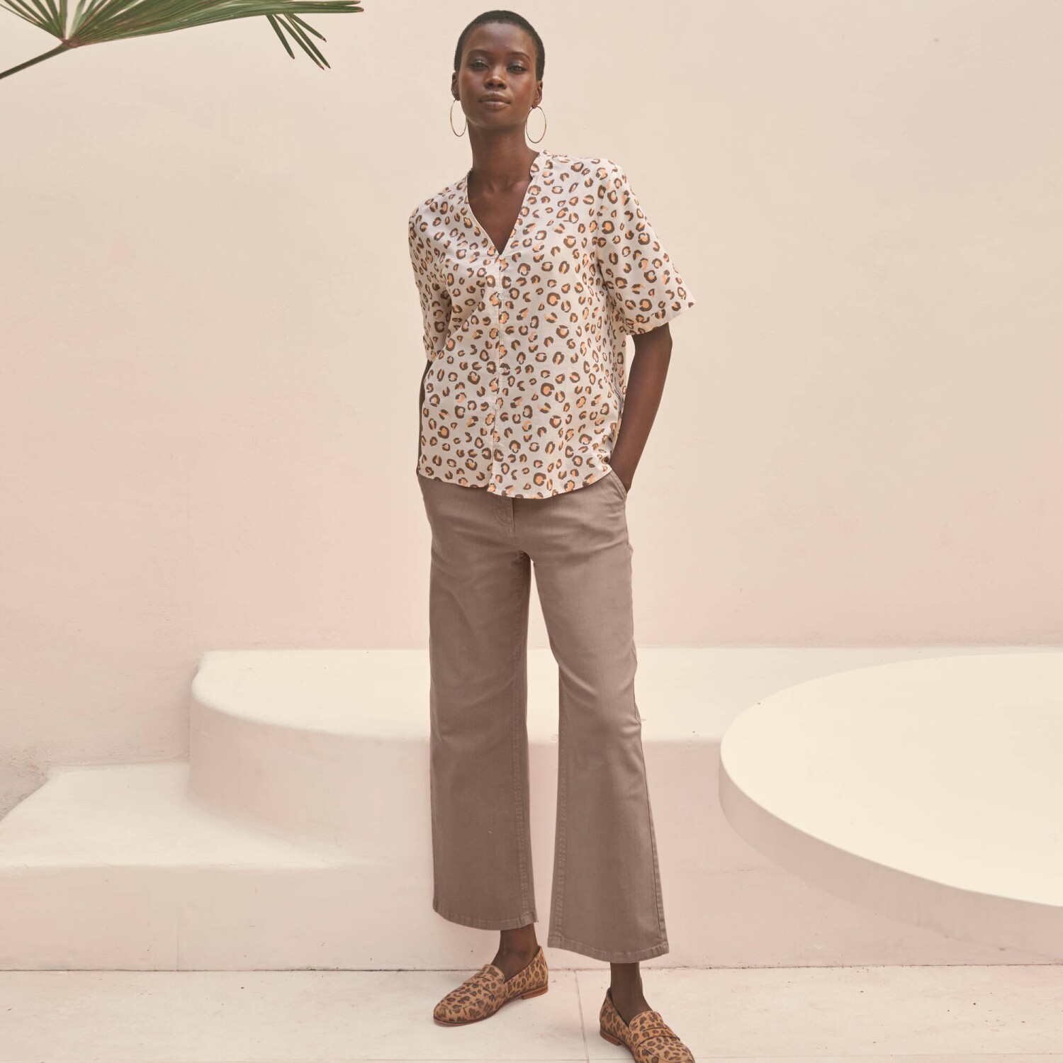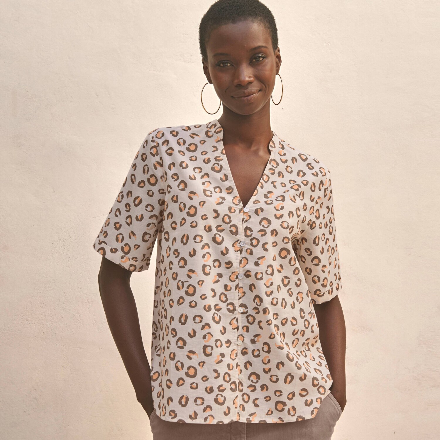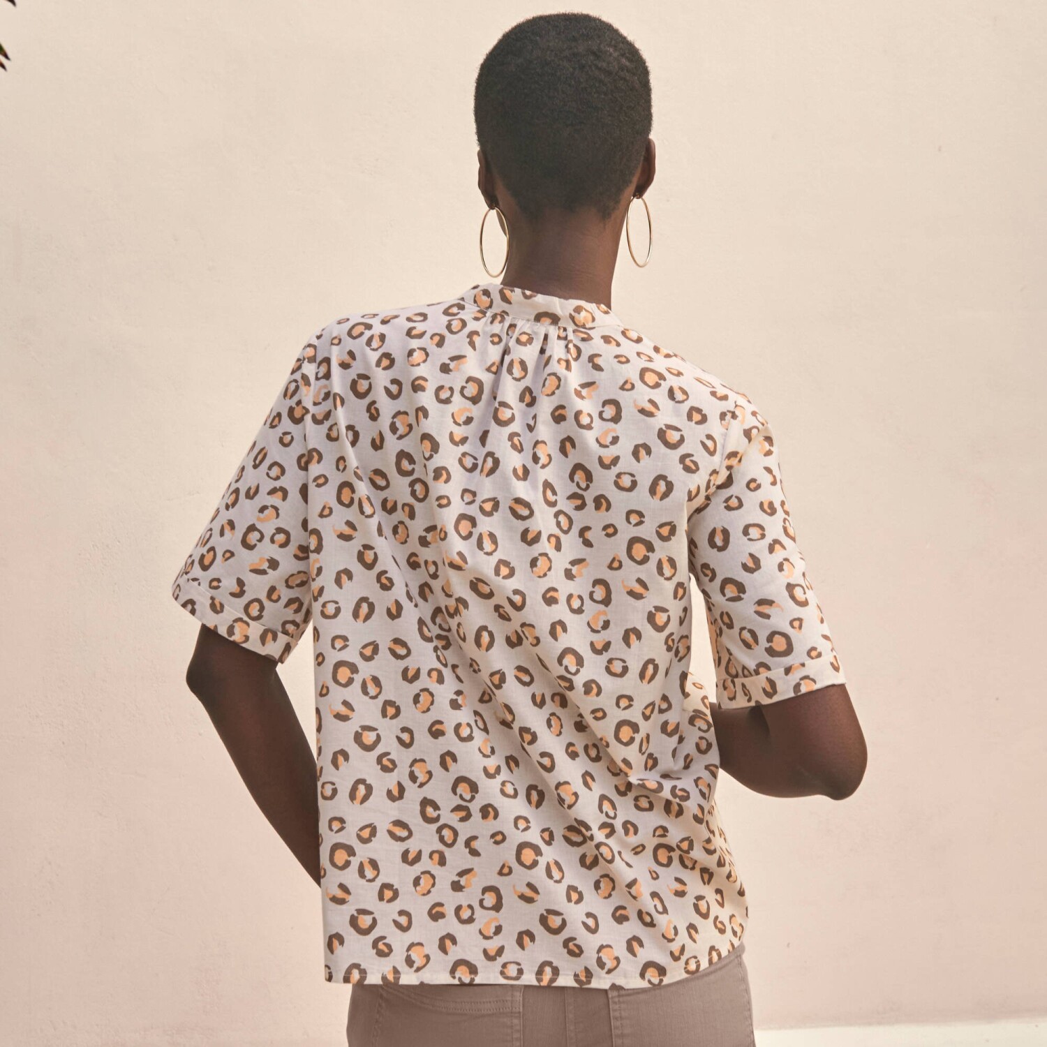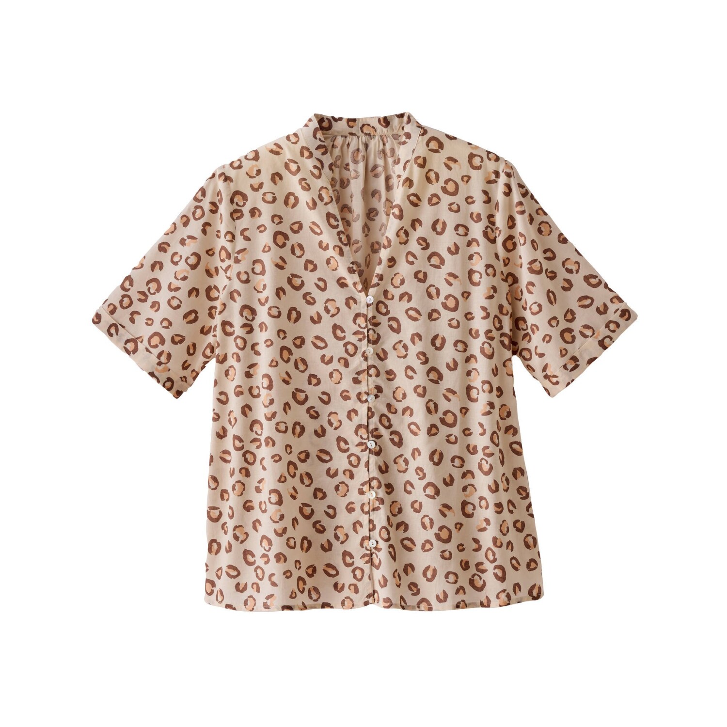 Pre svoj nespútaný vzhľad zvoľte košeľovú blúzku s leopardím vzorom! Tuniský výstrih s prestrihom do "V". Vpredu gombíková léga a pružné očká. Krátke rukávy s ohrnutím. Vzadu pod výstrihom nariasená. Rovný dolný lem. Možno prať v práčke.