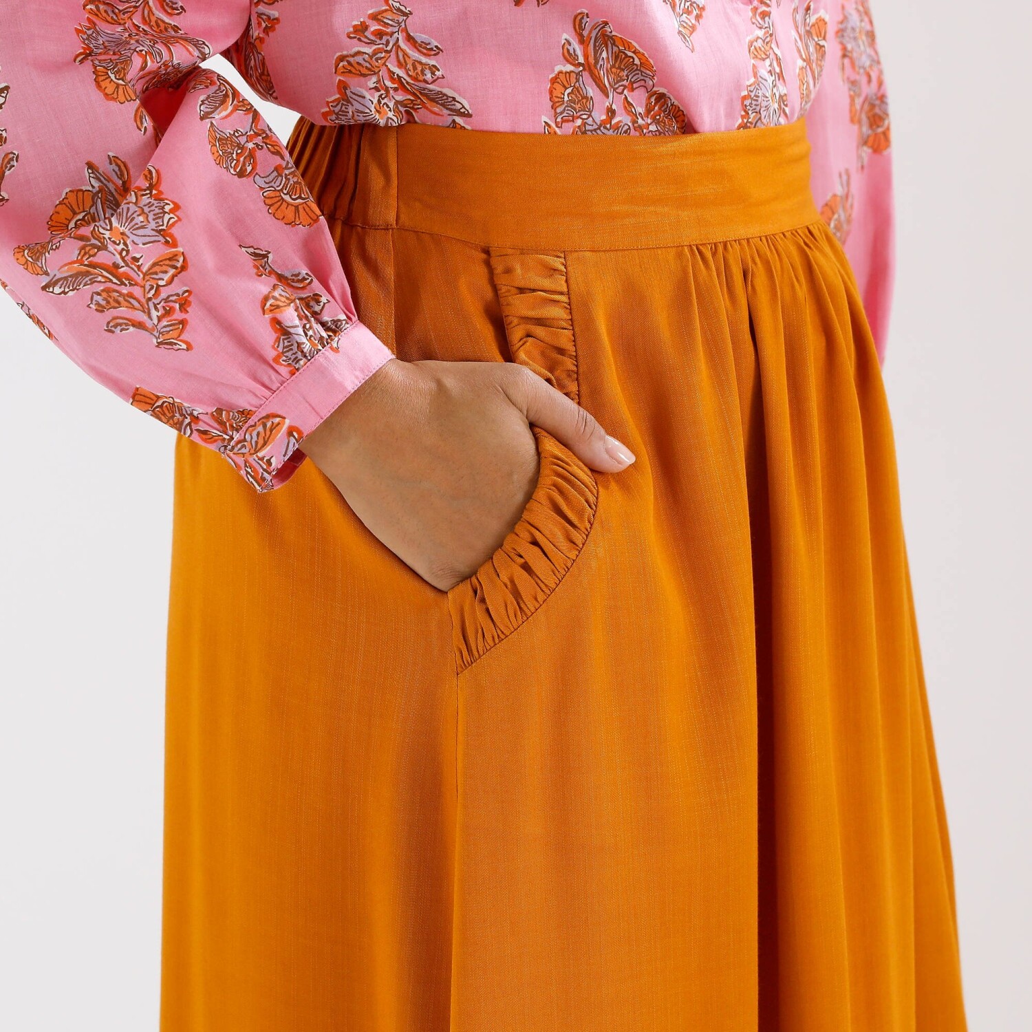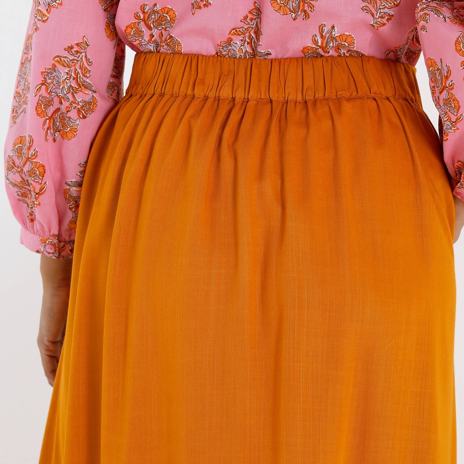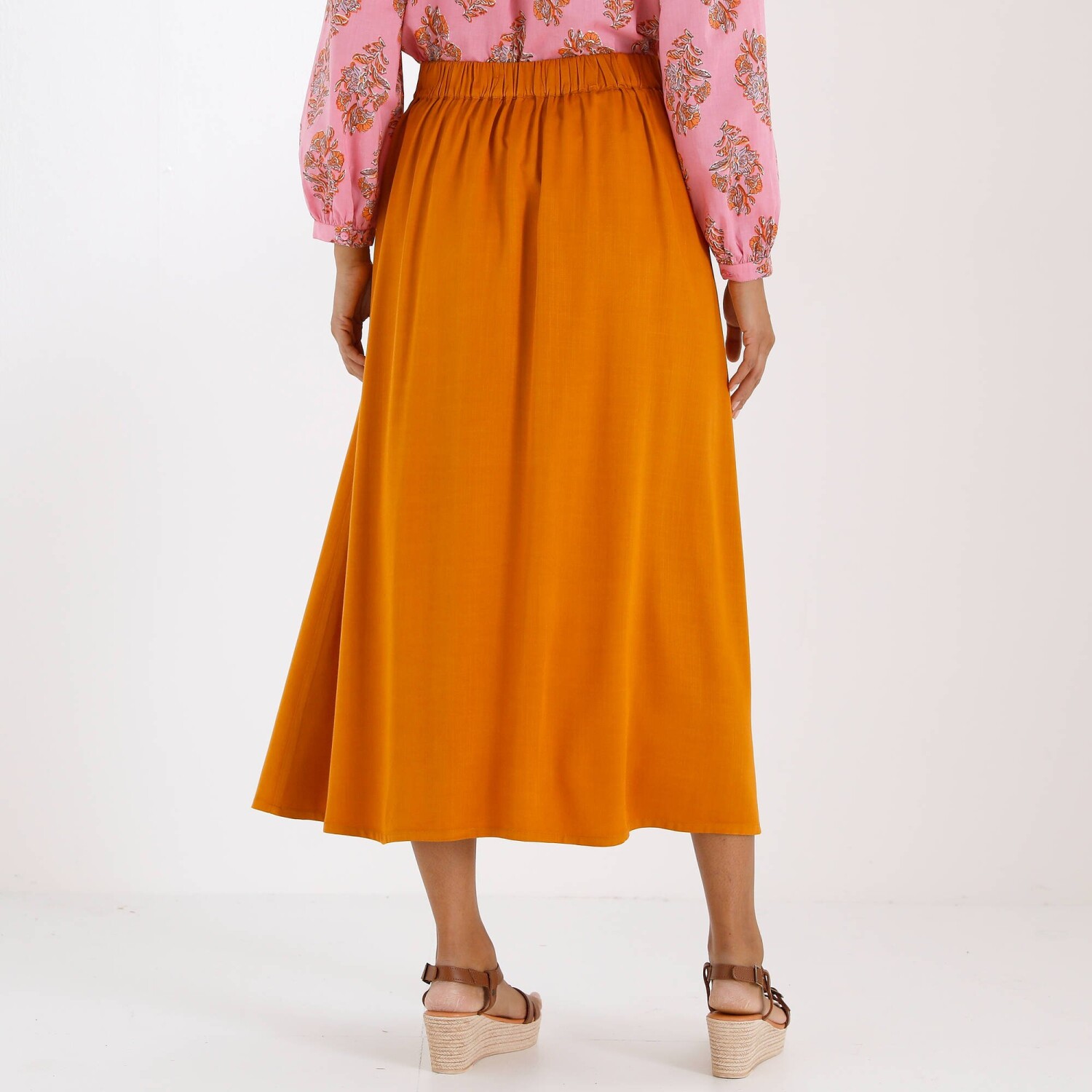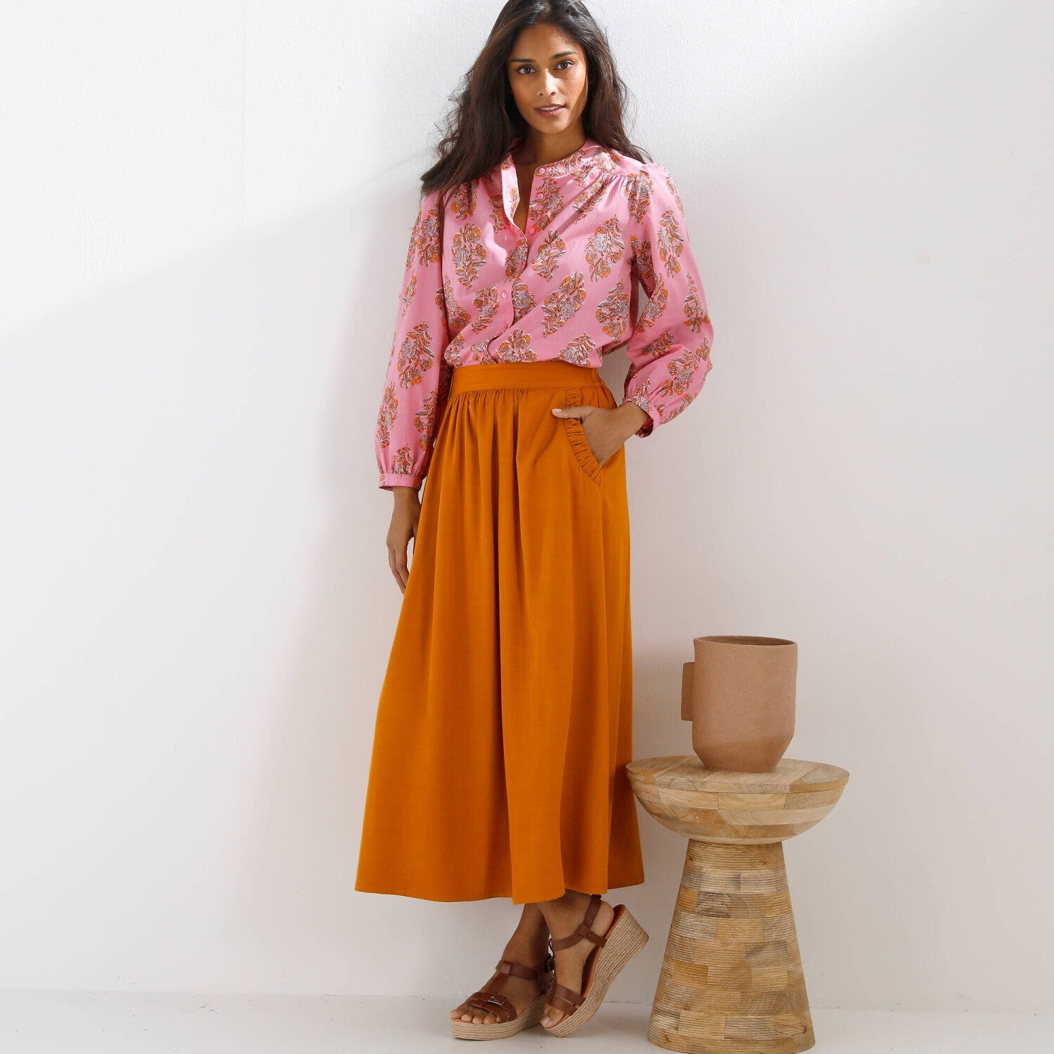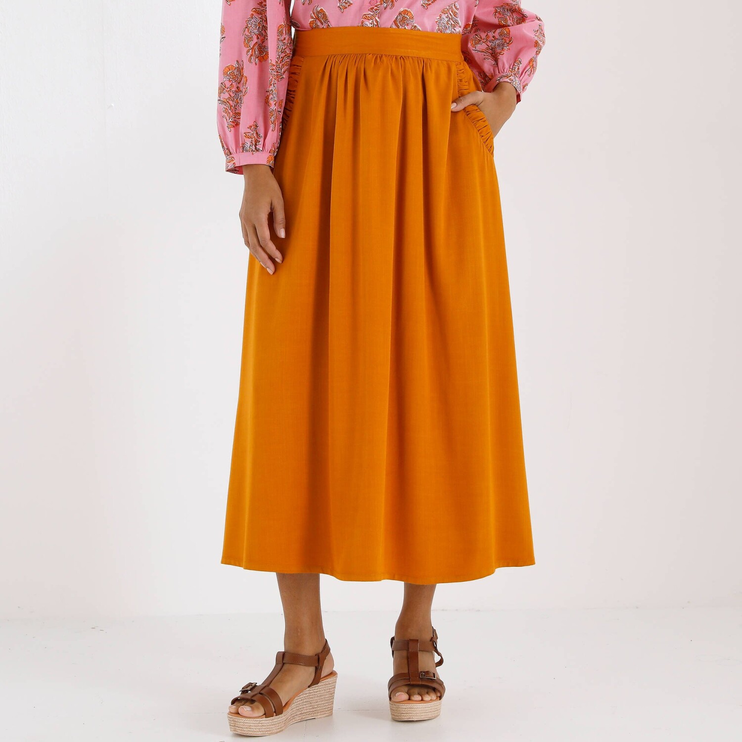Vdýchnite ženskosť Vášmu šatníku vďaka dlhej jednofarebnej sukni, ktorá sa ľahko kombinuje. Jemný, vzdušný úplet. Voľný strih. Vpredu plochý pás, vzadu pružný. Vpredu uprostred nariasená. 2 bočné vrecká s nariaseným pruhom. Možno prať v práčke.
