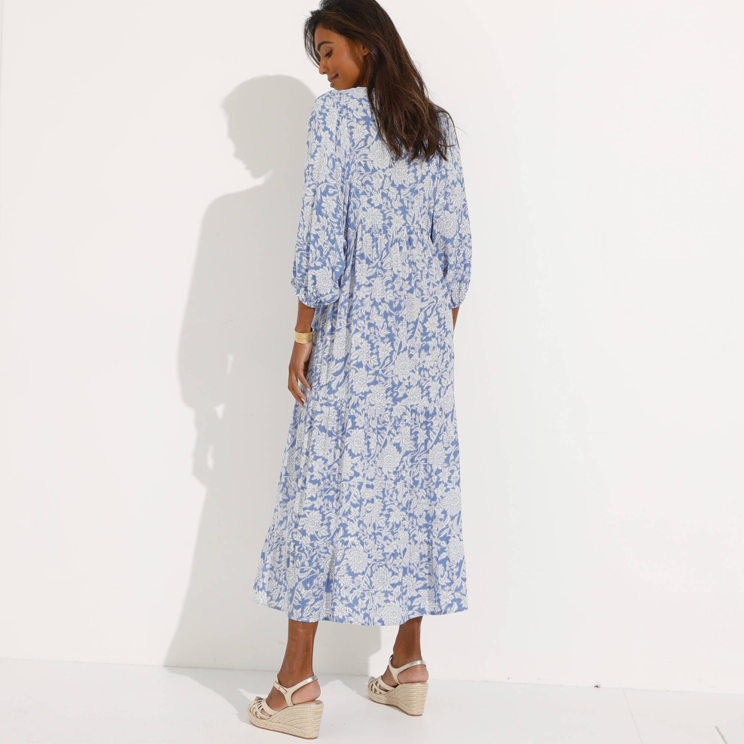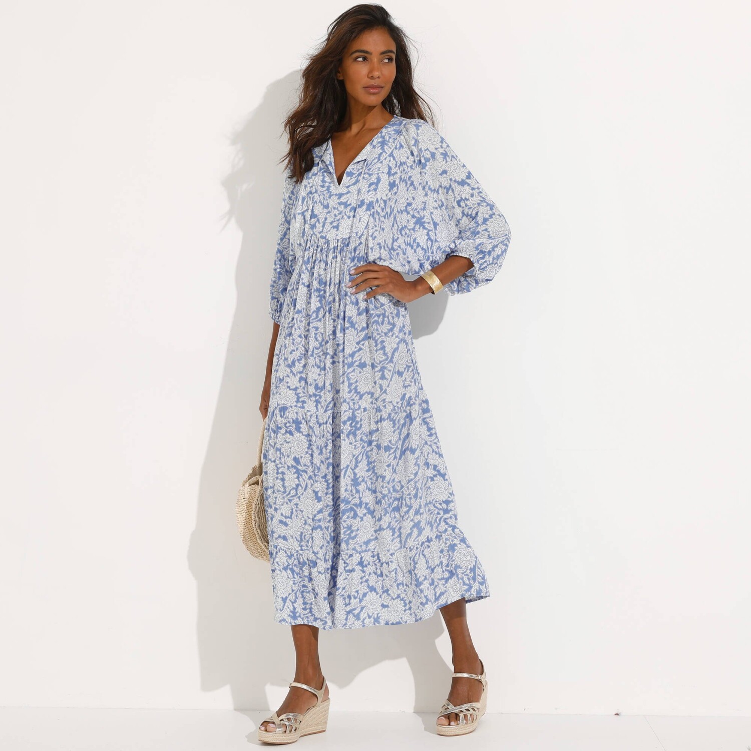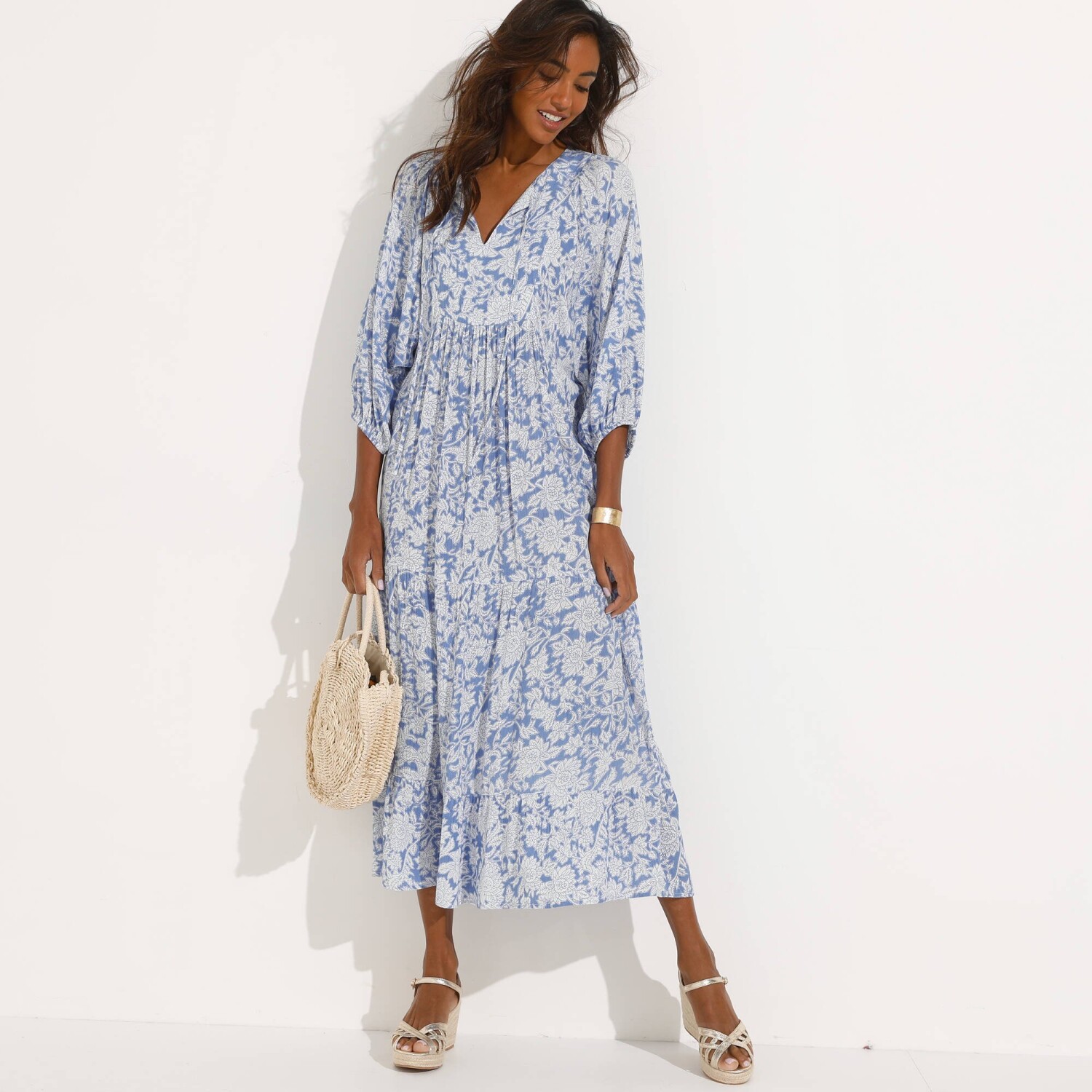 Z ľahkého krepónu a s potlačou kvetín, dlhé šaty predstavujú ideálny model na letnú sezónu. Okrúhly výstrih s prestrihom a šnúrkami na zaviazanie. Vpredu náprsenka, vzadu nariasenie. Široké rukávy po lakte. Pružné konce rukávov. Spodný lem s 2 nariasenými volánmi. Možno prať v práčke.