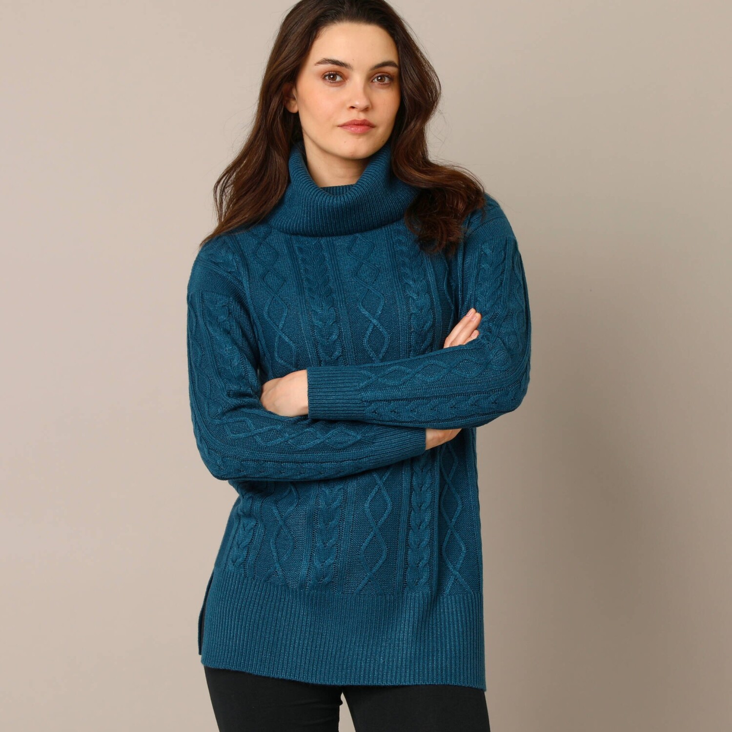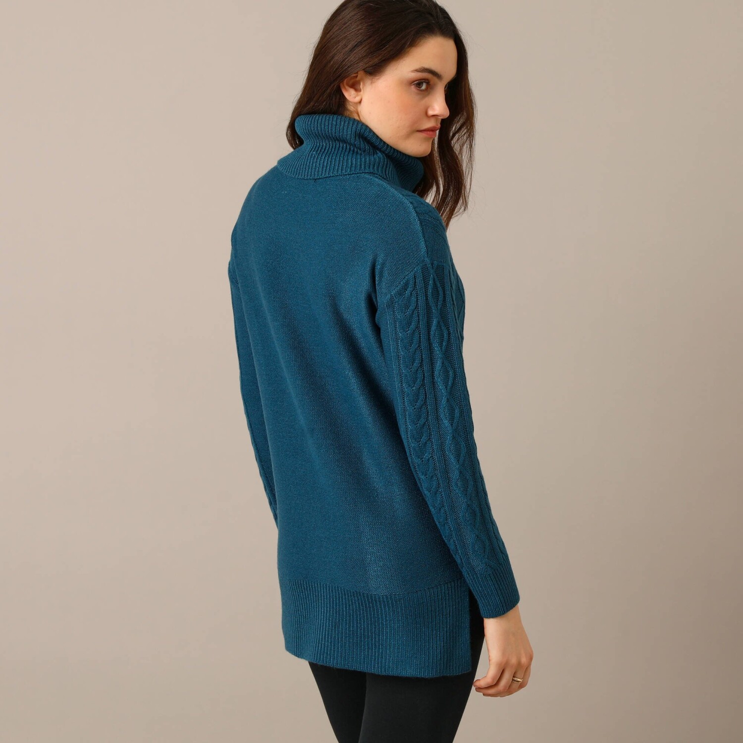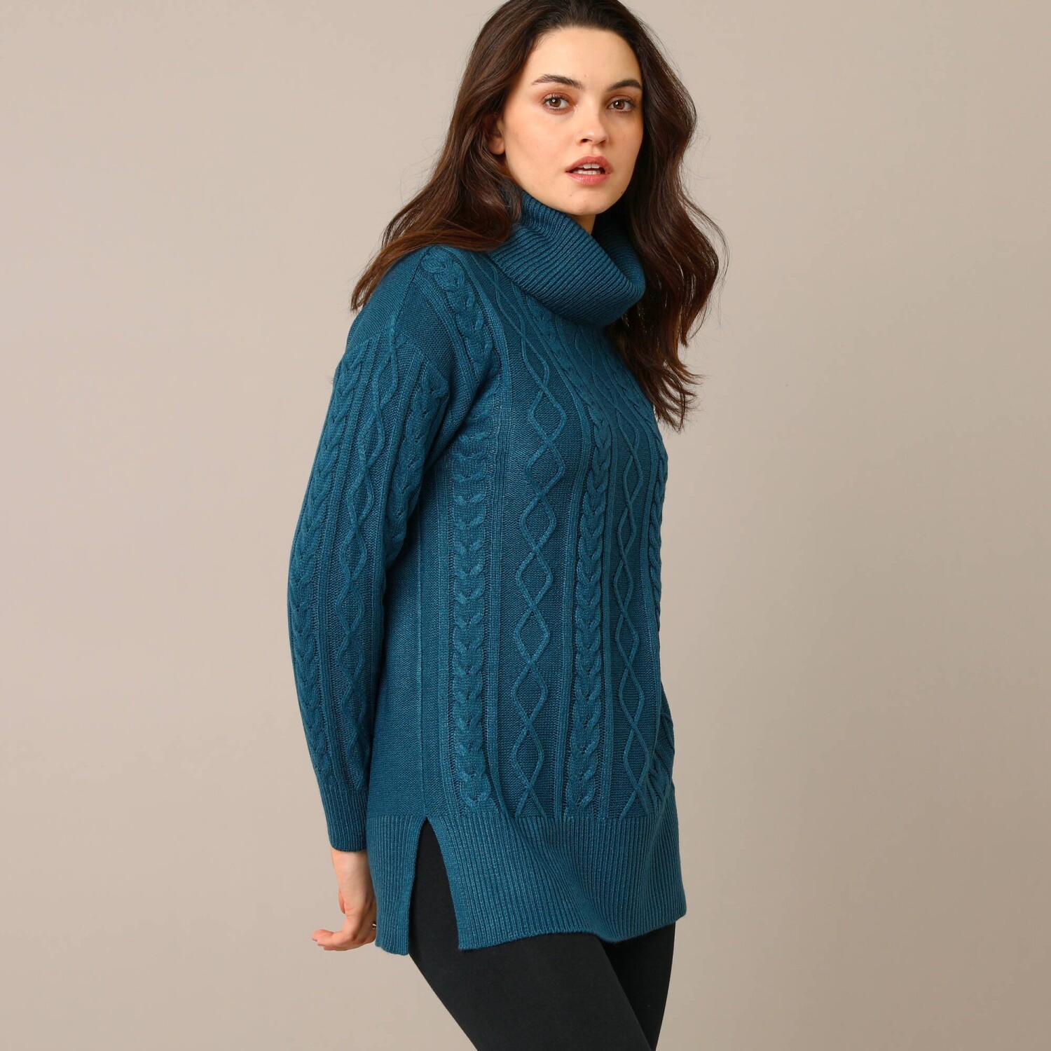 Dlhý rolák s vrkočovým vzorom sa hodí k slim džínsom či legínam. Rolákový golier. Originálny a vrkočový vzor vpredu a na hornej časti rukávov, rubový džersej na zadnom diele. Dlhé rovné rukávy s voľnými ramenami. Rovný spodný lem s bočnými rozparkami. Možno prať v práčke.