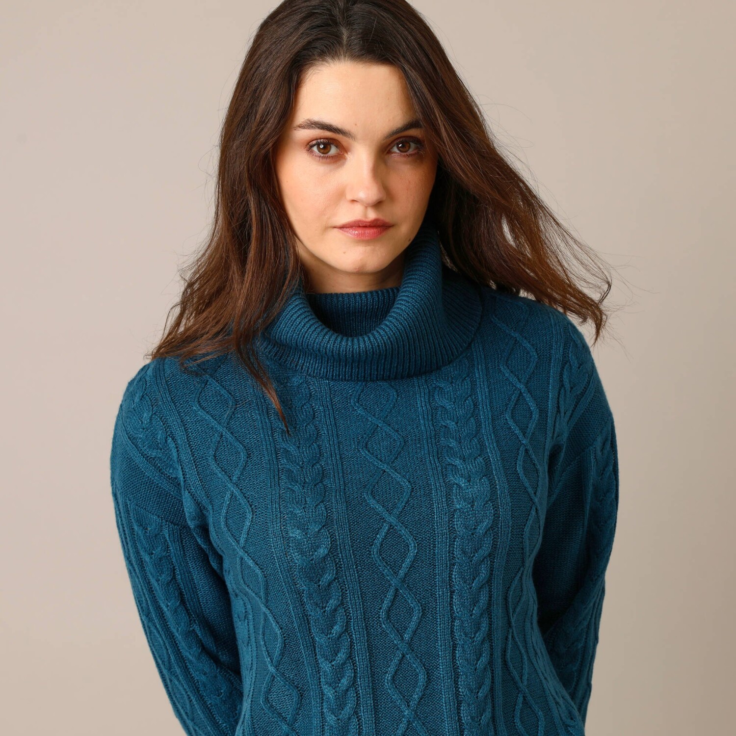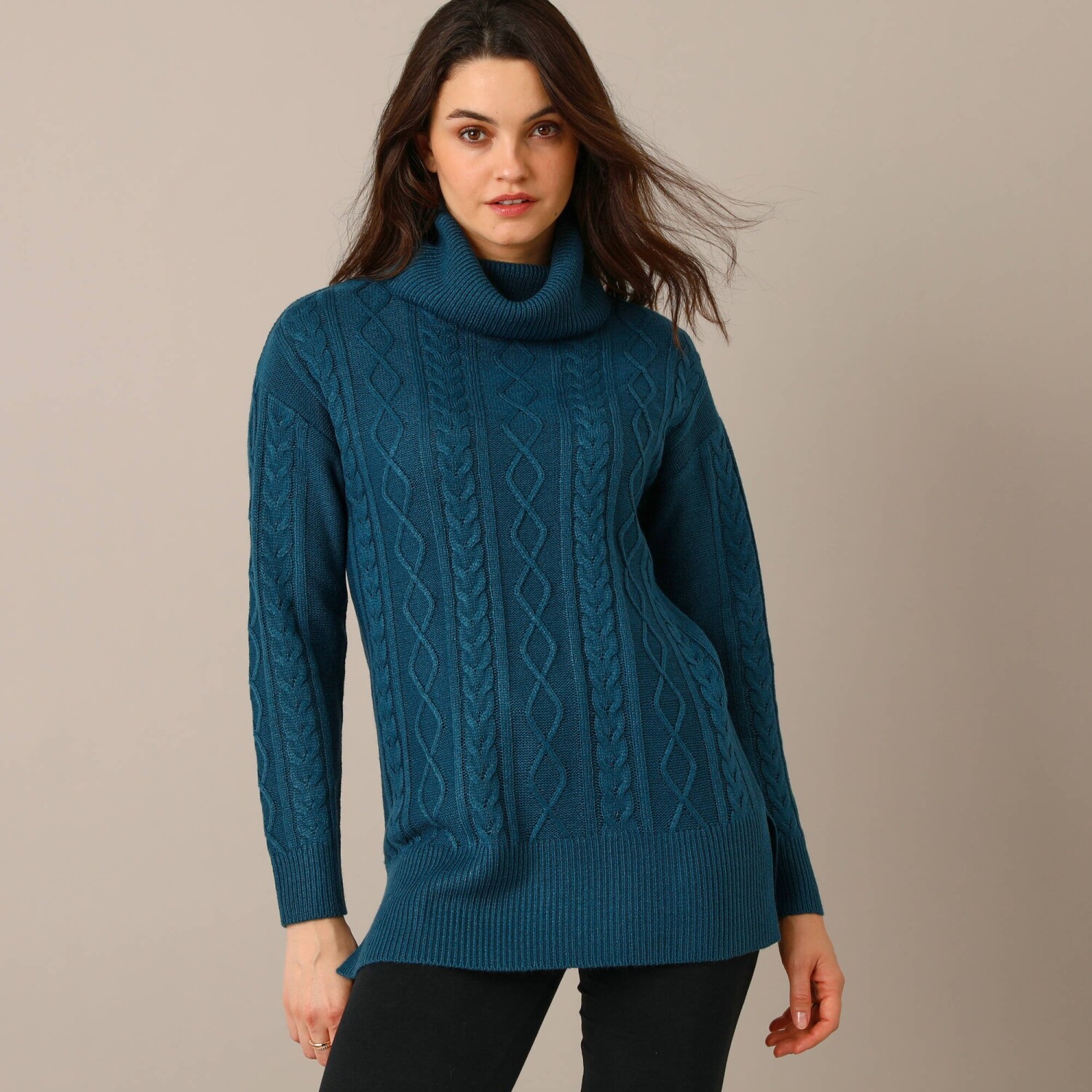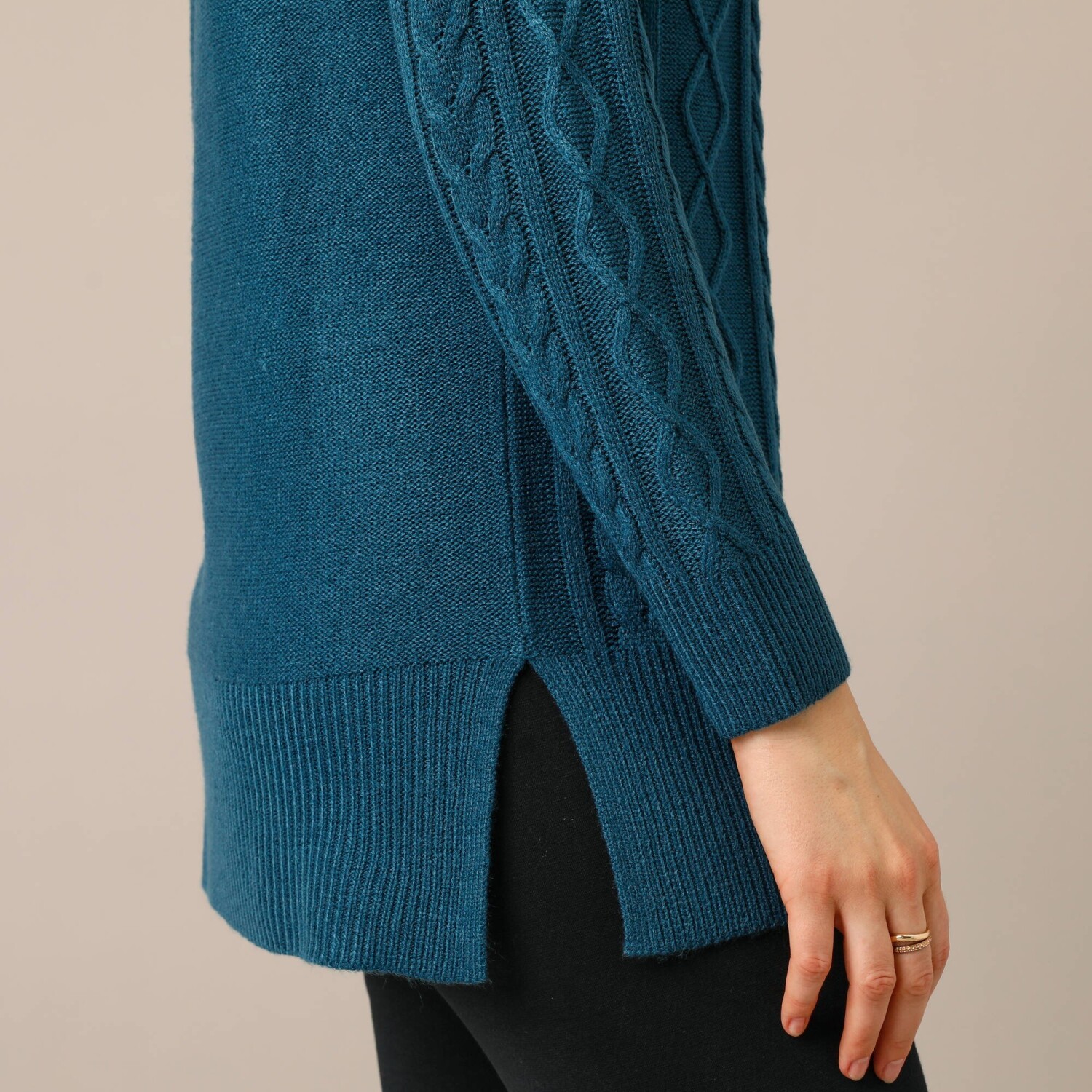 Dlhý rolák s vrkočovým vzorom sa hodí k slim džínsom či legínam. Rolákový golier. Originálny a vrkočový vzor vpredu a na hornej časti rukávov, rubový džersej na zadnom diele. Dlhé rovné rukávy s voľnými ramenami. Rovný spodný lem s bočnými rozparkami. Možno prať v práčke.