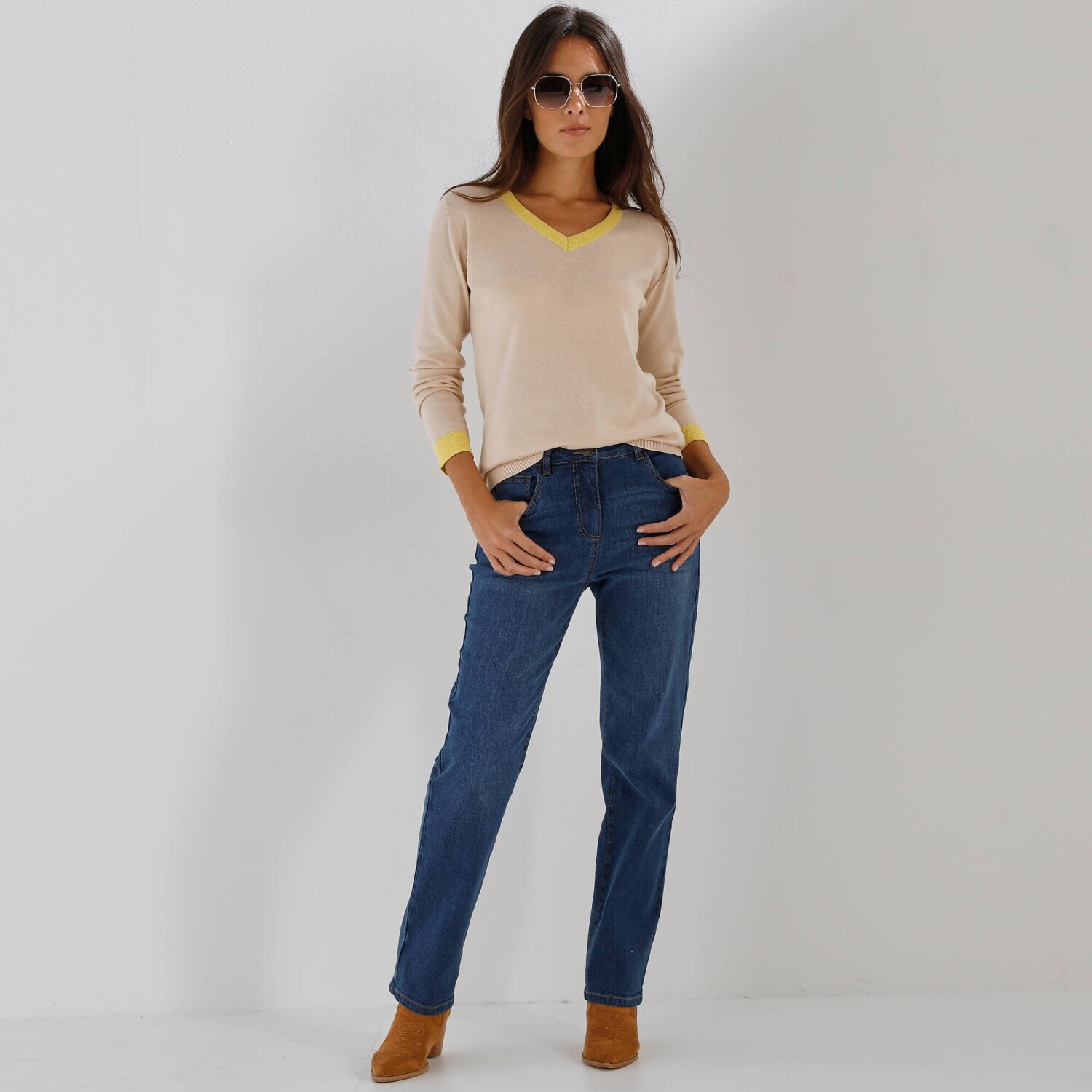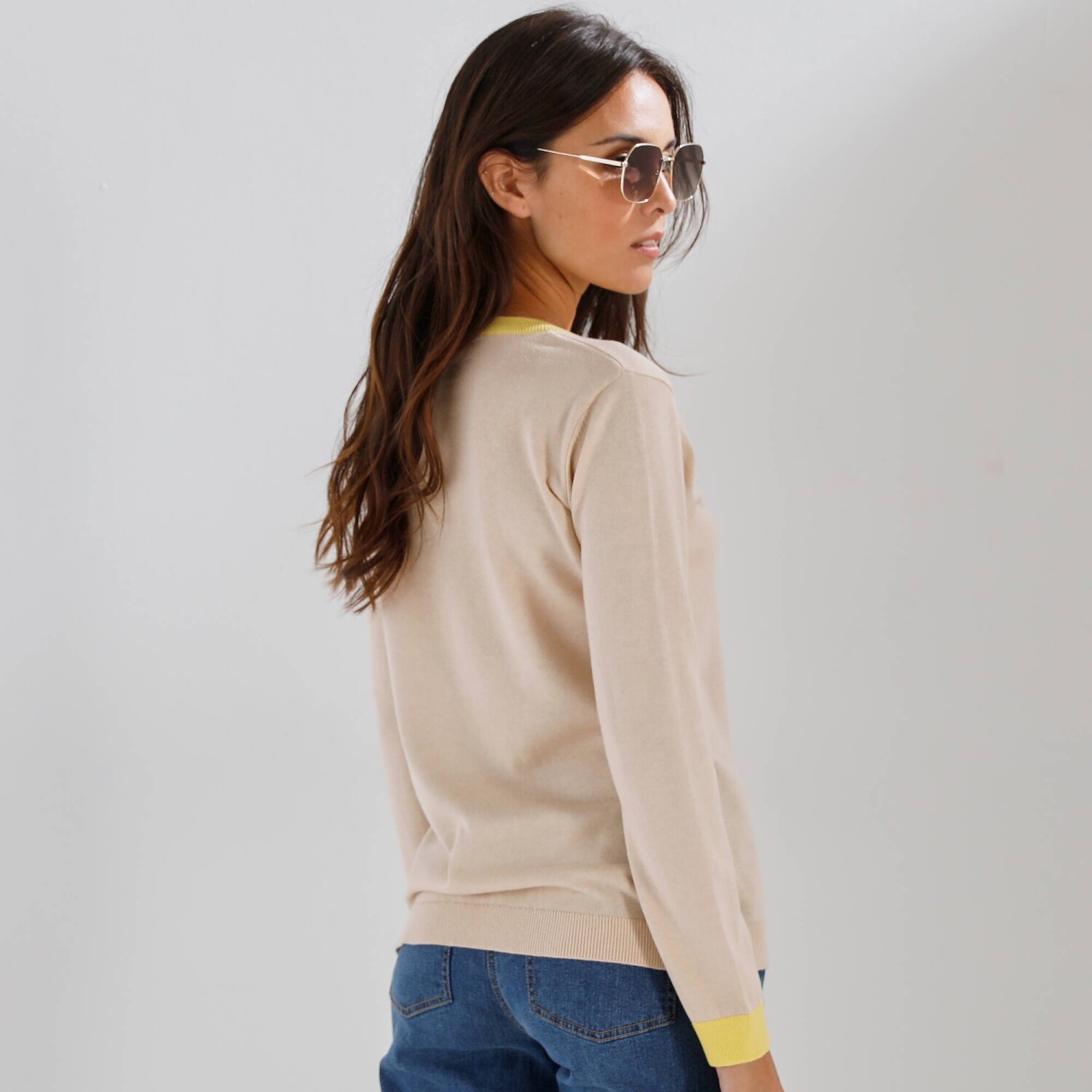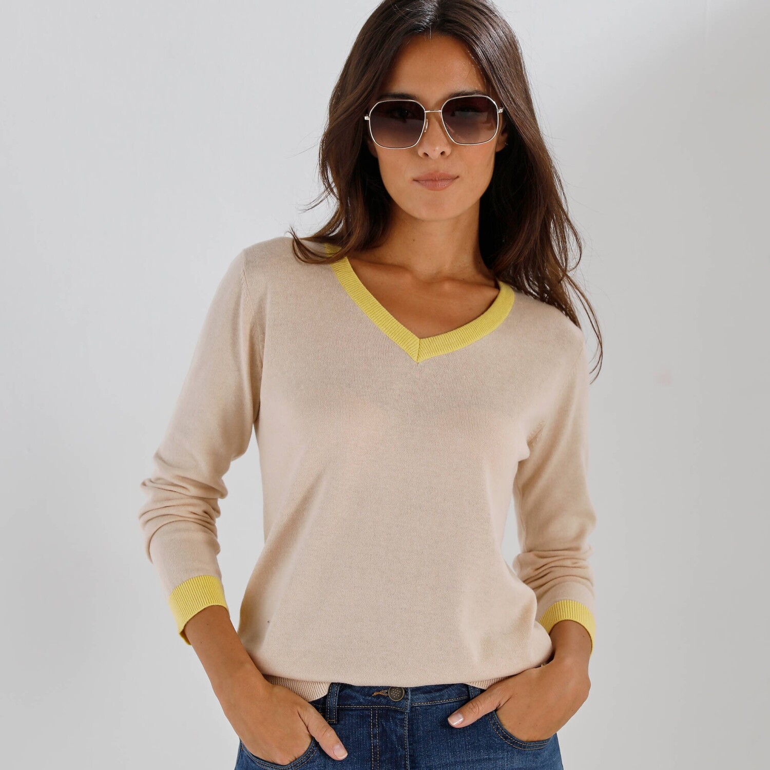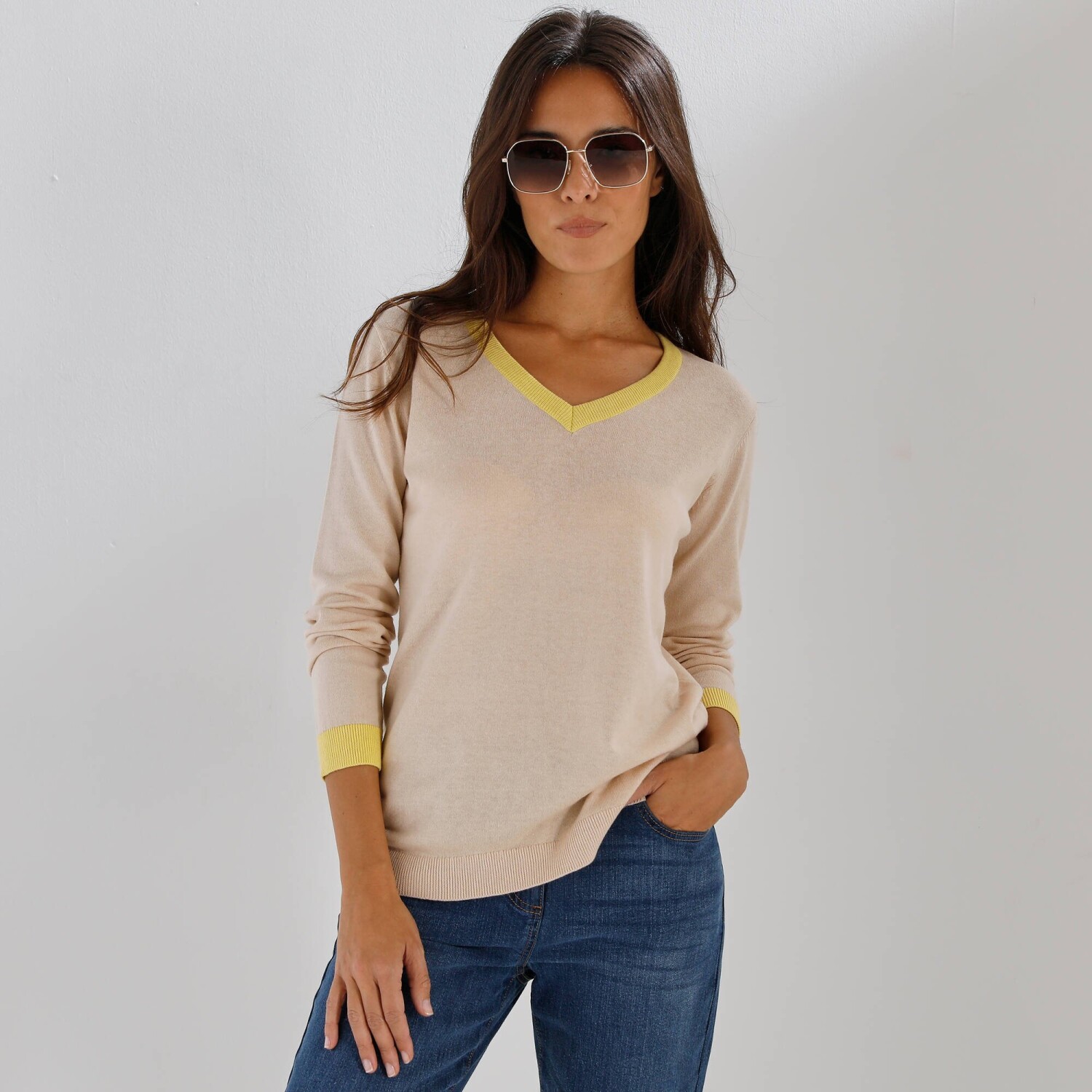 Krásny pulóver spája jemnosť a eleganciu! Vďaka jemnej pletenine a kontrastným detailom pôsobí elegantne a zároveň ležérne. Hodí sa k džínsom, sukni aj nohaviciam, stane sa Vaším spoločníkom po celú sezónu. Kontrastné zakončenie. Mierny výstrih do "V". Dlhé rukávy. Rovný, rozšírený dolný lem. Možno prať v práčke.