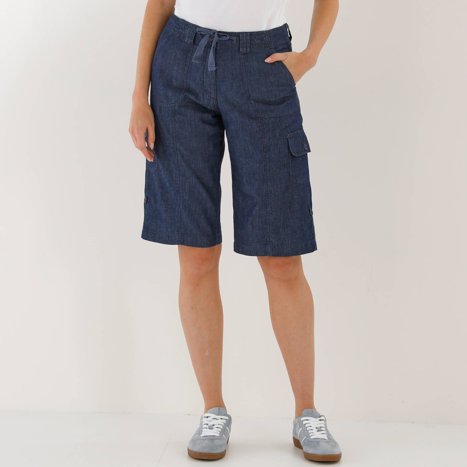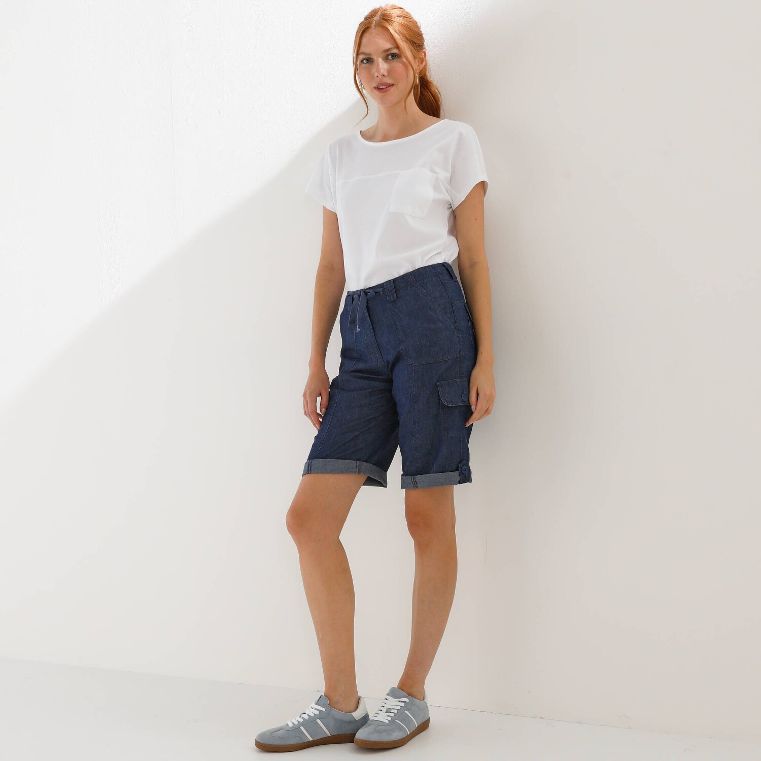 Nevyhnutné v letnom šatníku, džínsové bermudy battle s vreckami jednoducho ohrniete vďaka pútku na gombík. Rovný strih, bežná výška pása. V páse pútka a šnúrka na stiahnutie. Zapínanie na zips a gombík. 2 našité vrecká vpredu. 2 bočné vrecká s klopou na gombík. 2 našité vrecká s klopou na gombík vzadu. Zvýšený sed. S gombíkovým pútkom na ohrnutie. Certifikát Made In Green značky OEKO-TEX®. Okrem overenia niekoľkých stoviek chemických látok, čím prispieva k vysokej bezpečnosti, toto označenie zaručuje ohľaduplné výrobné princípy a kontrolované spoločenské postupy. Možno prať v práčke.