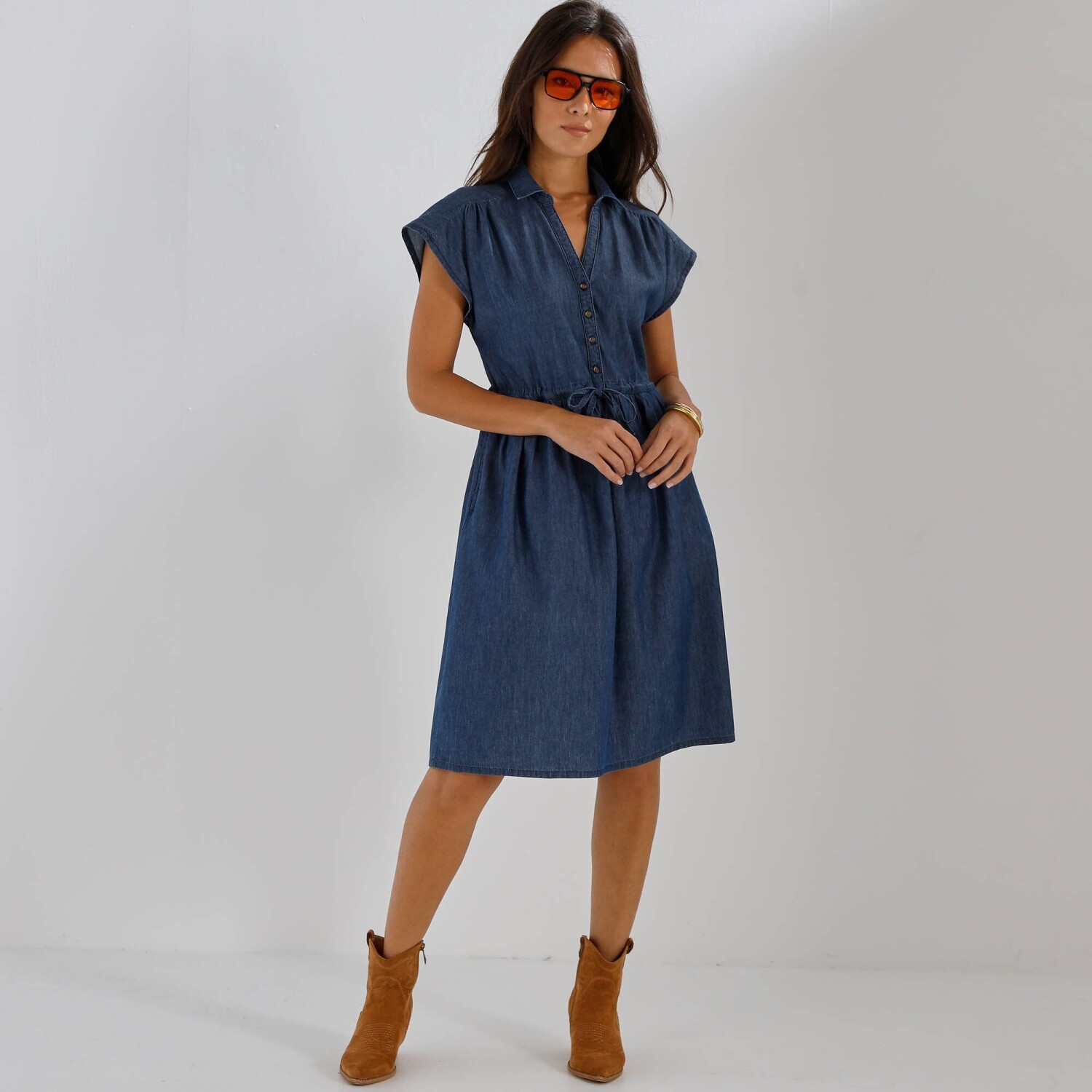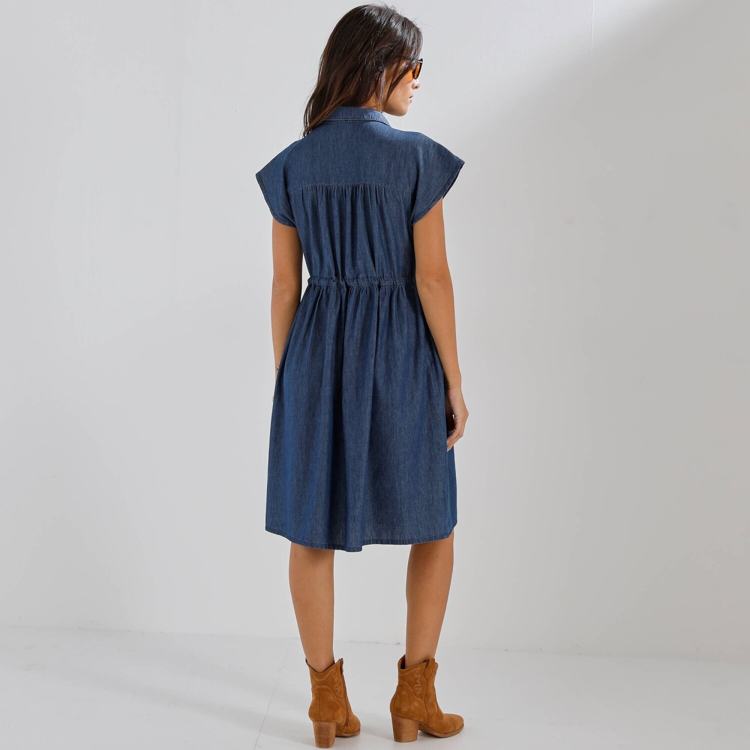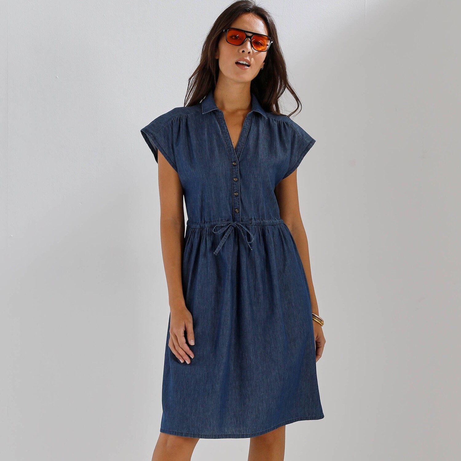 Váš budúci módny crush? Naše džínsové šaty vo voľnom strihu! Z ľahkého denimu, s nariasenými ramenami a šnúrkou v páse, je ťažké im odolať! Košeľový golier s prestrihom do "V" a gombíkovou légou. Vpredu na ramenách stredové nariasenie. Vzadu sedlo a nariasenie. Voľné ramená. V páse prestrčená šnúrka. Vrecká v bočných švoch. Rovný dolný lem. Certifikát Made In Green značky OEKO-TEX®. Okrem overenia niekoľkých stoviek chemických látok (STANDARD 100), ktoré prispievajú k vysokej bezpečnosti, toto označenie zaručuje ohľaduplné výrobné princípy a kontrolované spoločenské postupy. Možno prať v práčke.