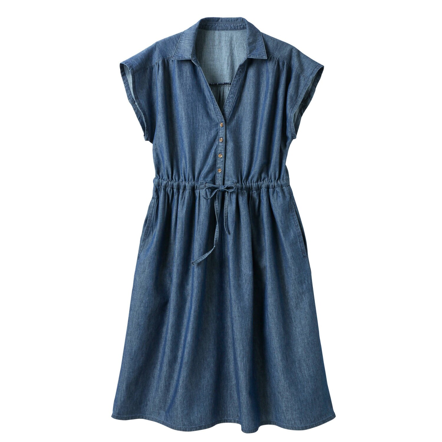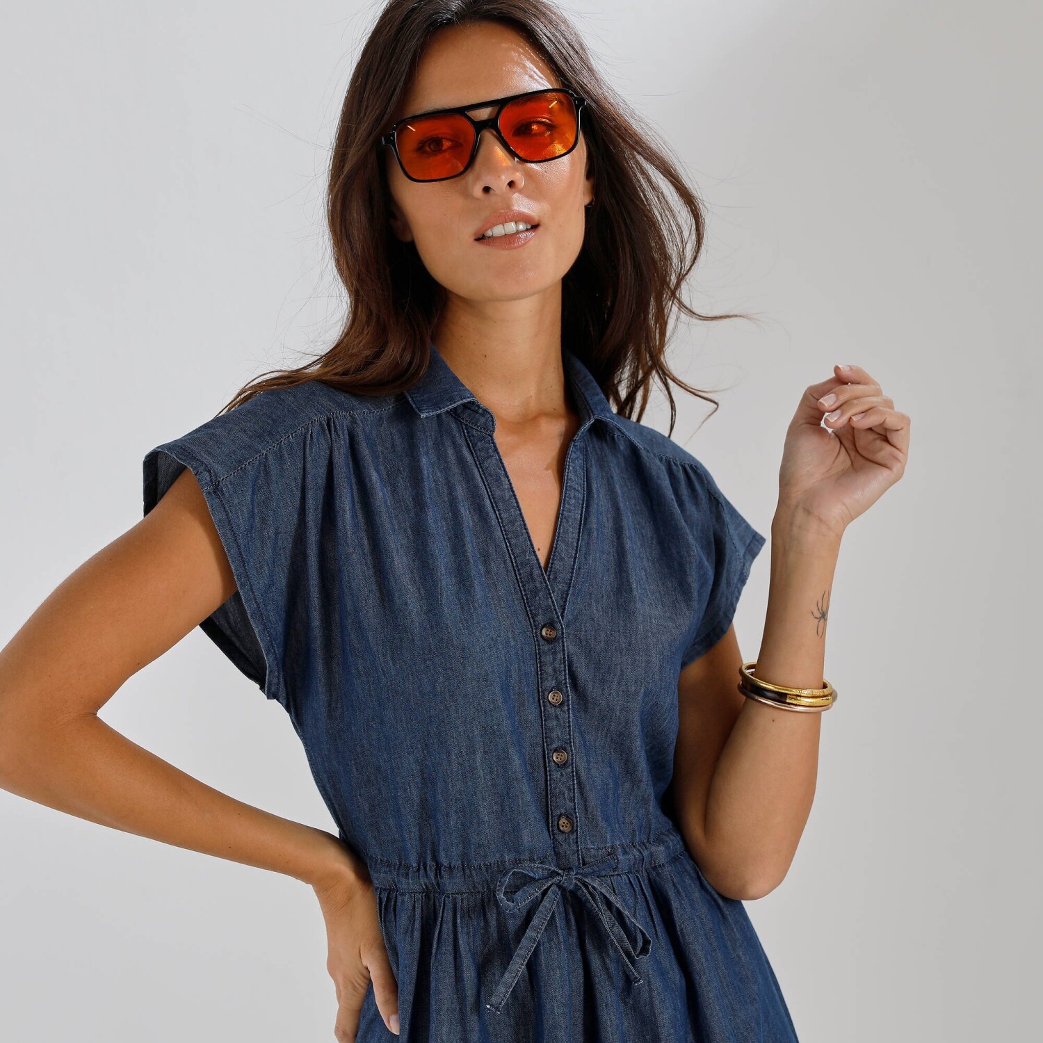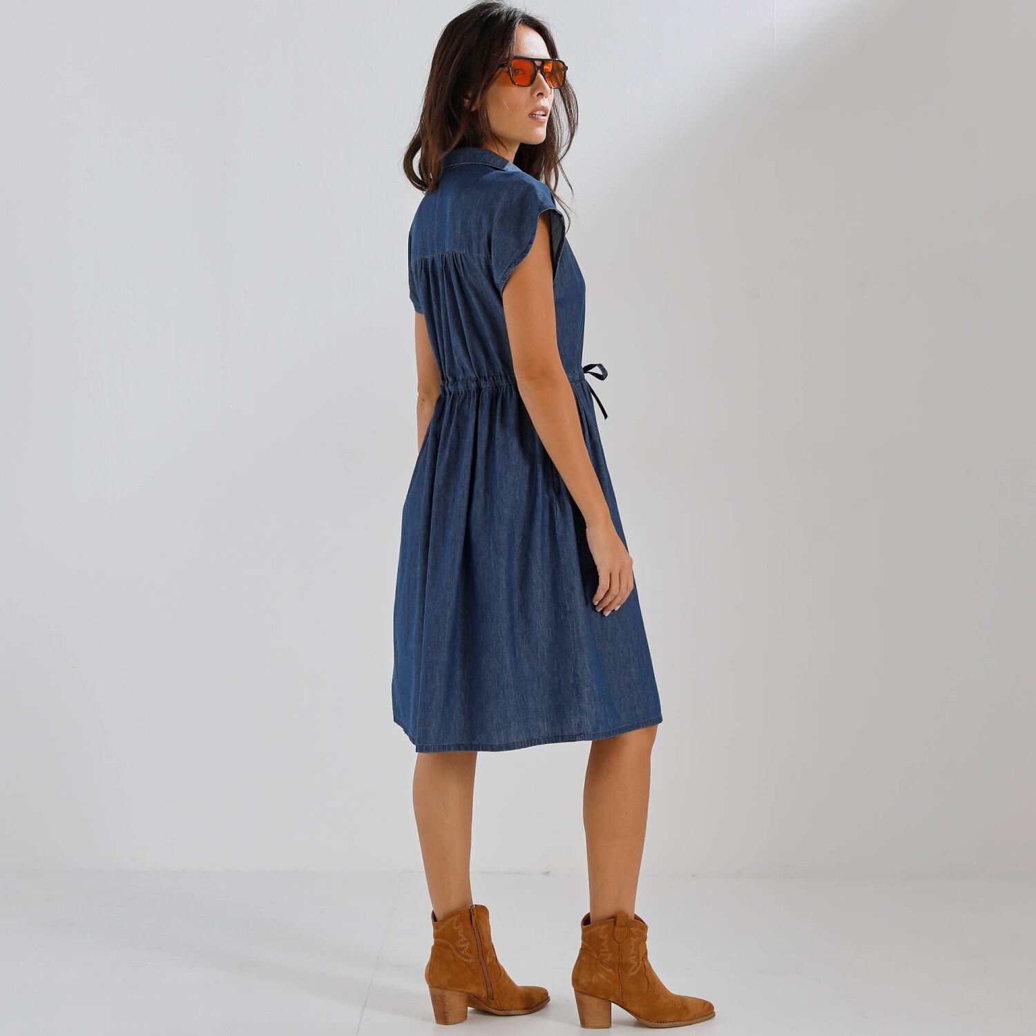 Váš budúci módny crush? Naše džínsové šaty vo voľnom strihu! Z ľahkého denimu, s nariasenými ramenami a šnúrkou v páse, je ťažké im odolať! Košeľový golier s prestrihom do "V" a gombíkovou légou. Vpredu na ramenách stredové nariasenie. Vzadu sedlo a nariasenie. Voľné ramená. V páse prestrčená šnúrka. Vrecká v bočných švoch. Rovný dolný lem. Certifikát Made In Green značky OEKO-TEX®. Okrem overenia niekoľkých stoviek chemických látok (STANDARD 100), ktoré prispievajú k vysokej bezpečnosti, toto označenie zaručuje ohľaduplné výrobné princípy a kontrolované spoločenské postupy. Možno prať v práčke.
