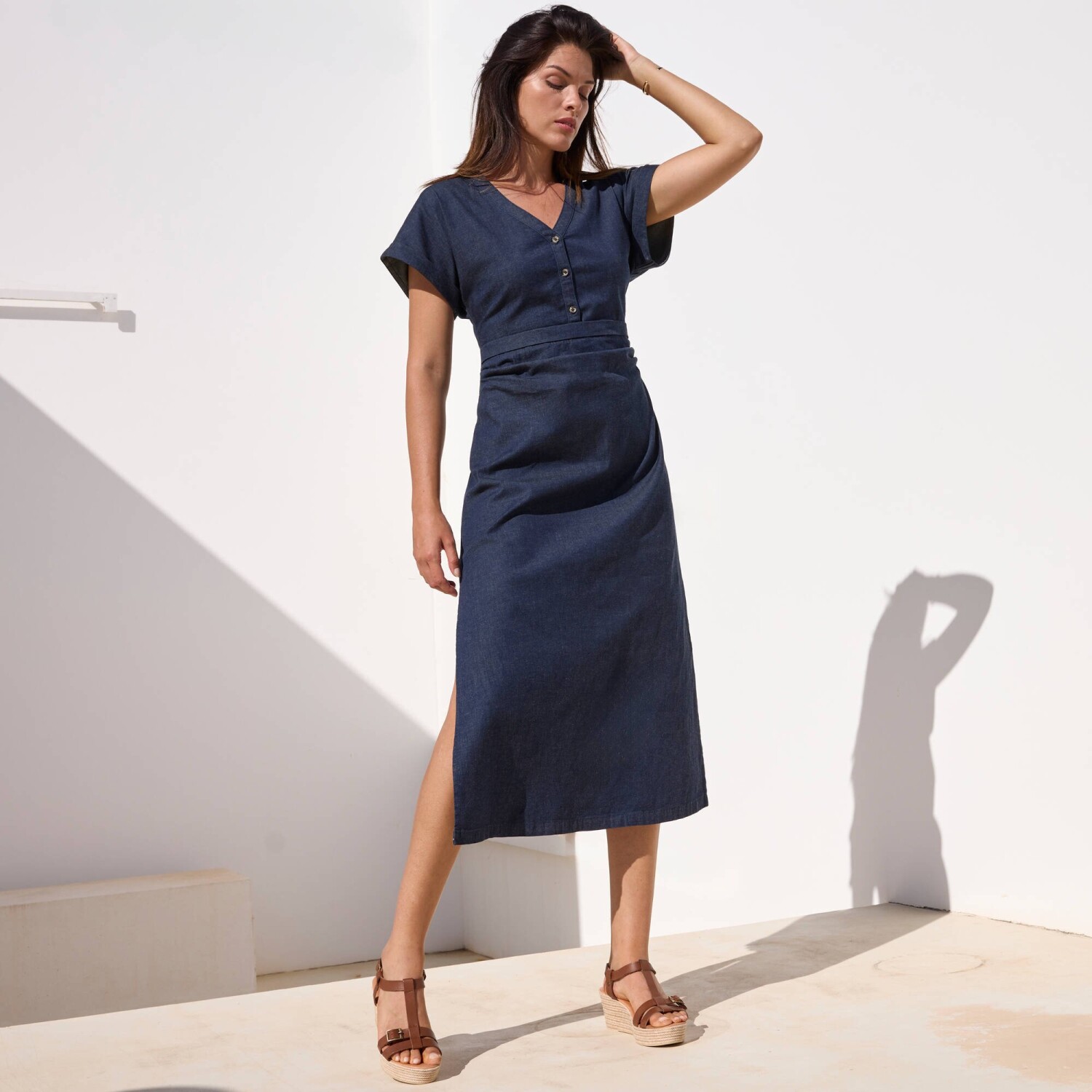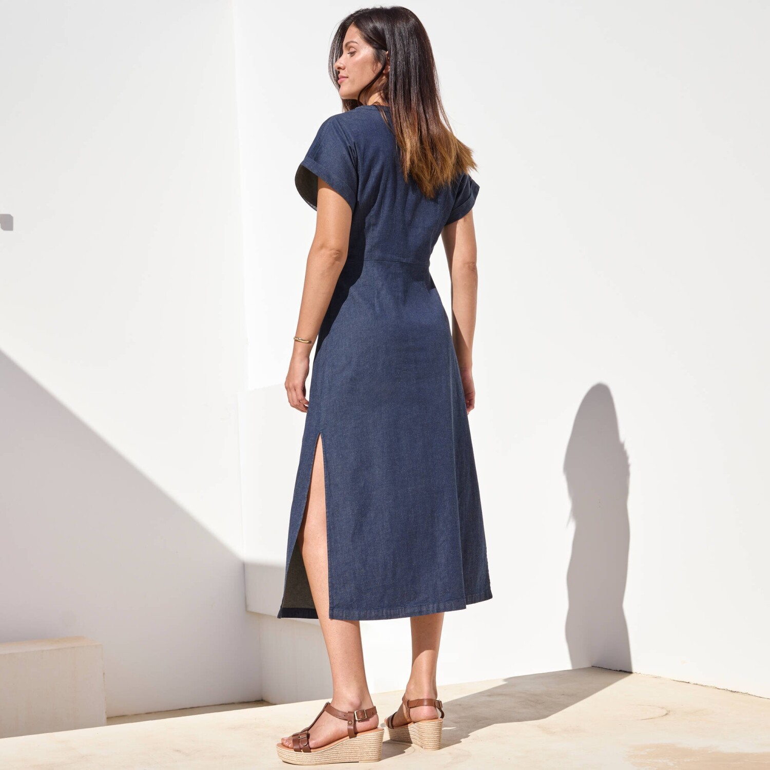 Pokiaľ máte rady denimovú módu, tak venujte pozornosť dlhým džínsovým šatám s výstrihom do "V"! Denimový materiál. Výstrih do "V" s gombíkovou légou. Krátke rukávy s ohrnutím, Voľné plecia. bočné rozparky. 2 záševky vzadu. Na boku skrytý zips. Rovný dolný lem. Certifikát Made In Green značky OEKO-TEX®. Okrem overenia niekoľkých stoviek chemických látok, čím prispieva k vysokej bezpečnosti, toto označenie zaručuje ohľaduplné výrobné princípy a kontrolované spoločenské postupy. Možno prať v práčke.