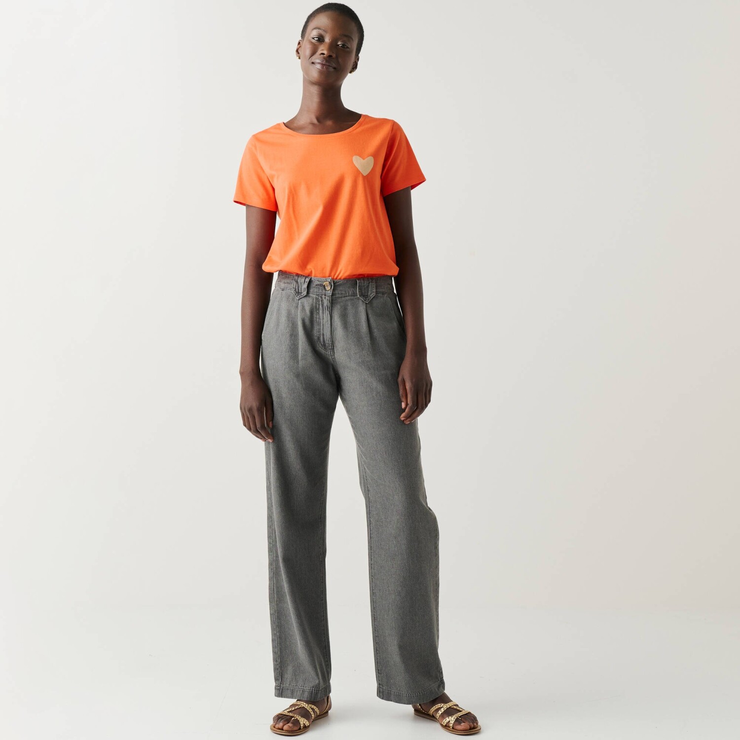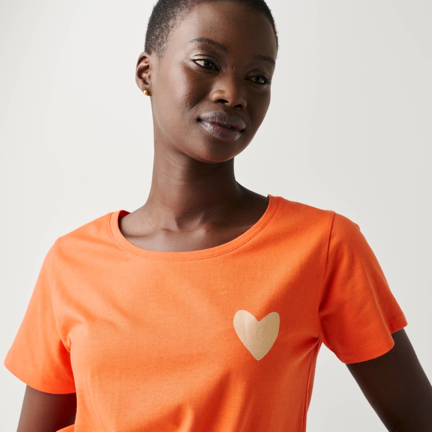 Jednofarebné tričko s okrúhlym výstrihom a zlatým srdiečkom predstavuje základný kúsok dámskeho šatníka, ktorý sa ľahko kombinuje. Na boku potlač srdca. Okrúhly výstrih. Krátke rukávy. Rovný dolný lem. Standard 100 by Oeko-Tex (n° CQ 1216 / 3 IFTH). Táto známka označuje textilné výrobky, ktoré boli podrobené laboratórnym testom na široké spektrum škodlivých látok a výrobok je bezpečný nad rámec platných noriem. Možno prať v práčke.