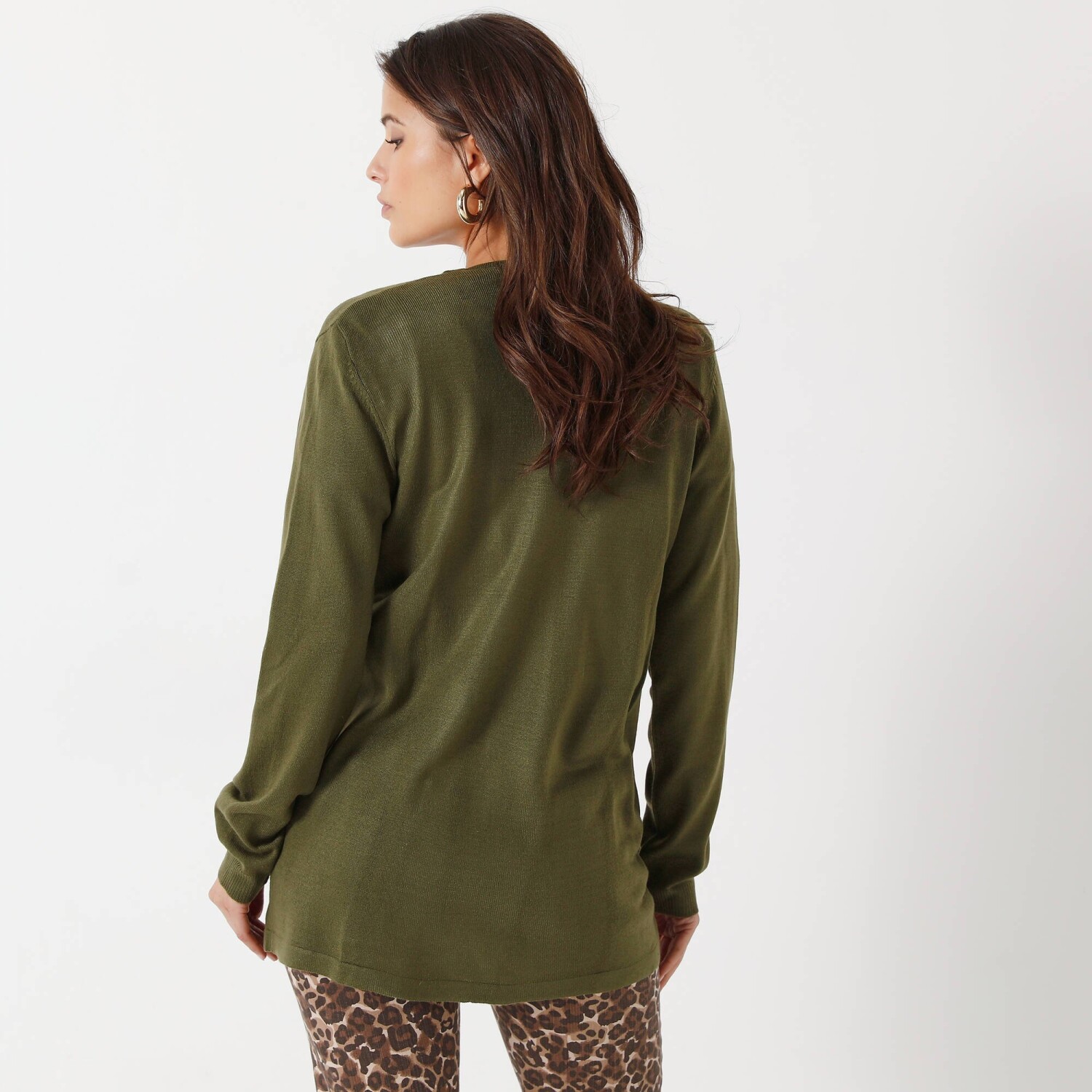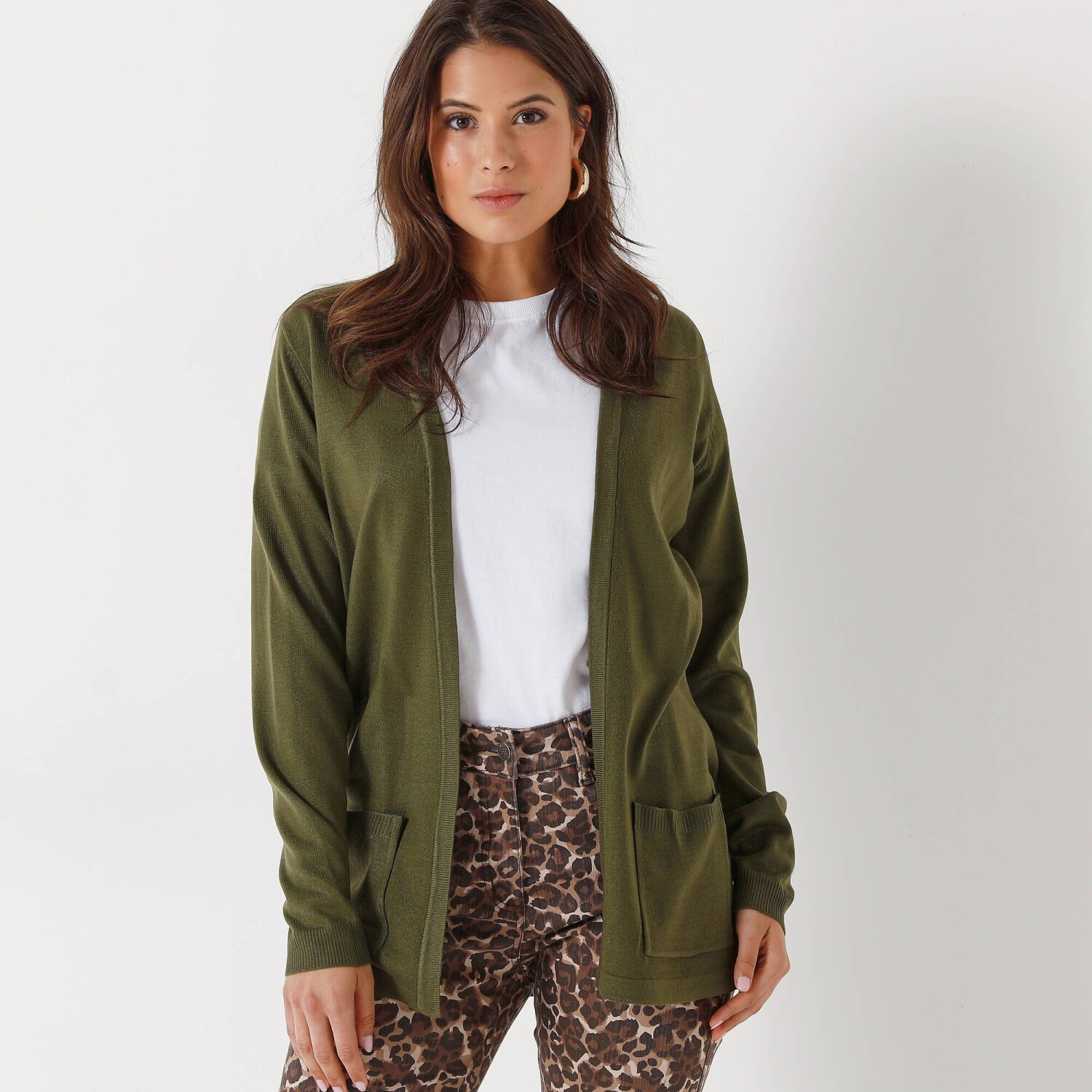 Objavte veľkú dávku jemnosti v podobe kardiganu kašmírového na dotyk. V dĺžke pod zadok. Bez zapínania. 2 vrecká vpredu. Dlhé rukávy. Rovný spodný lem.