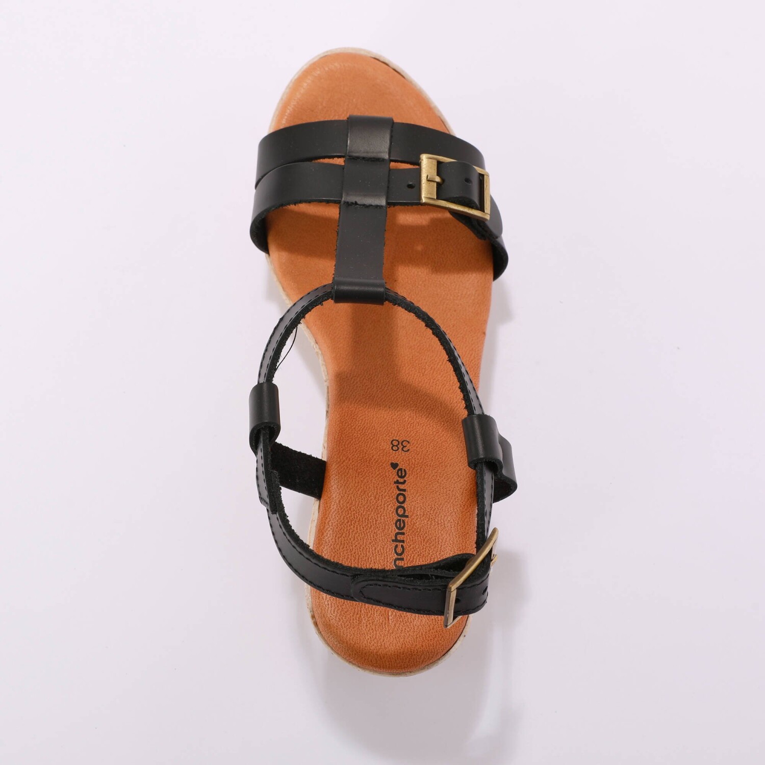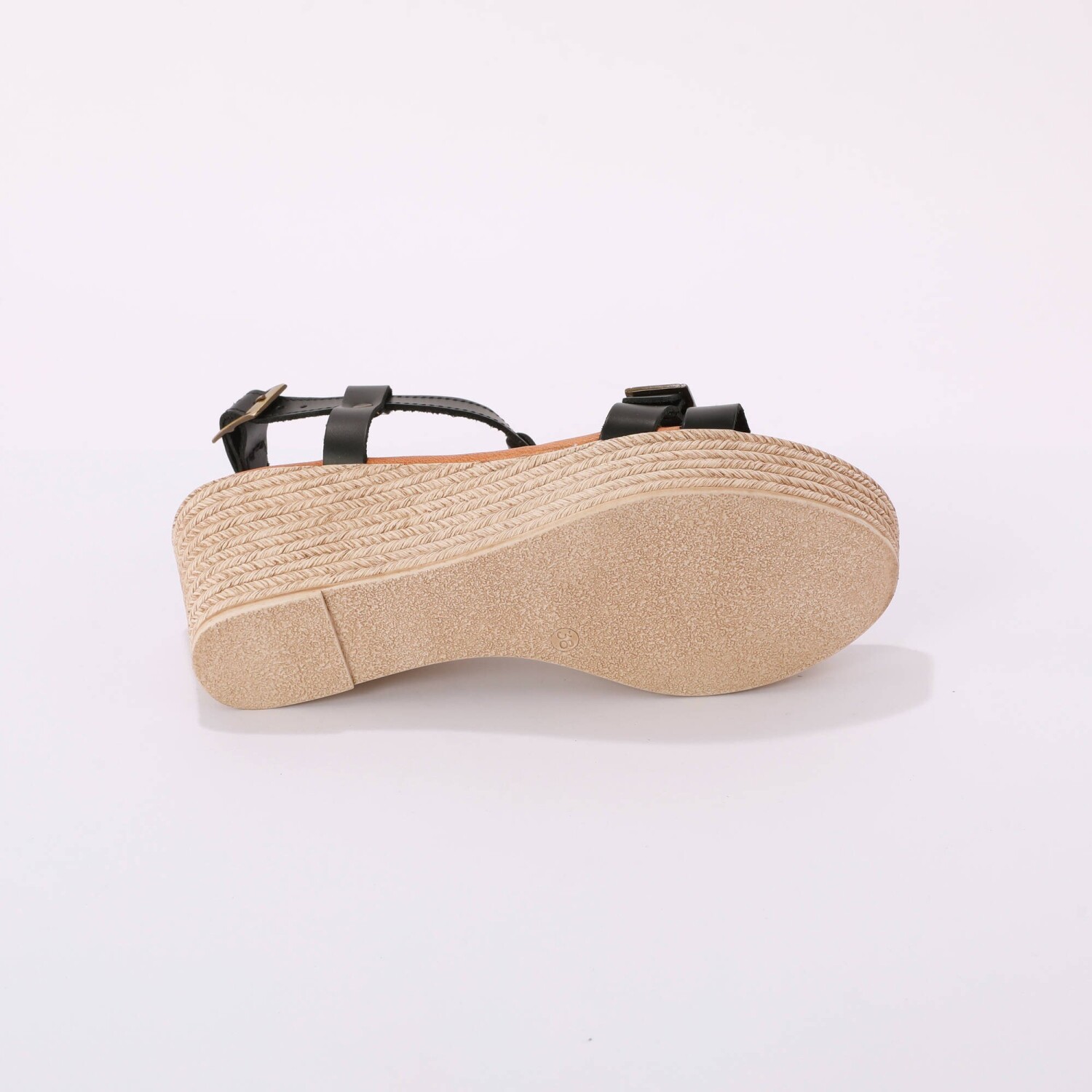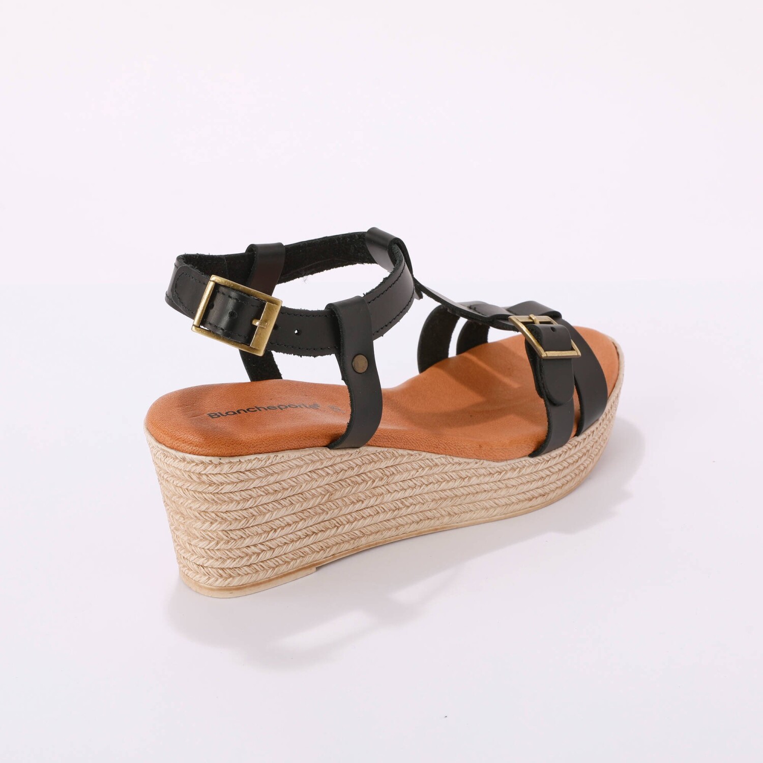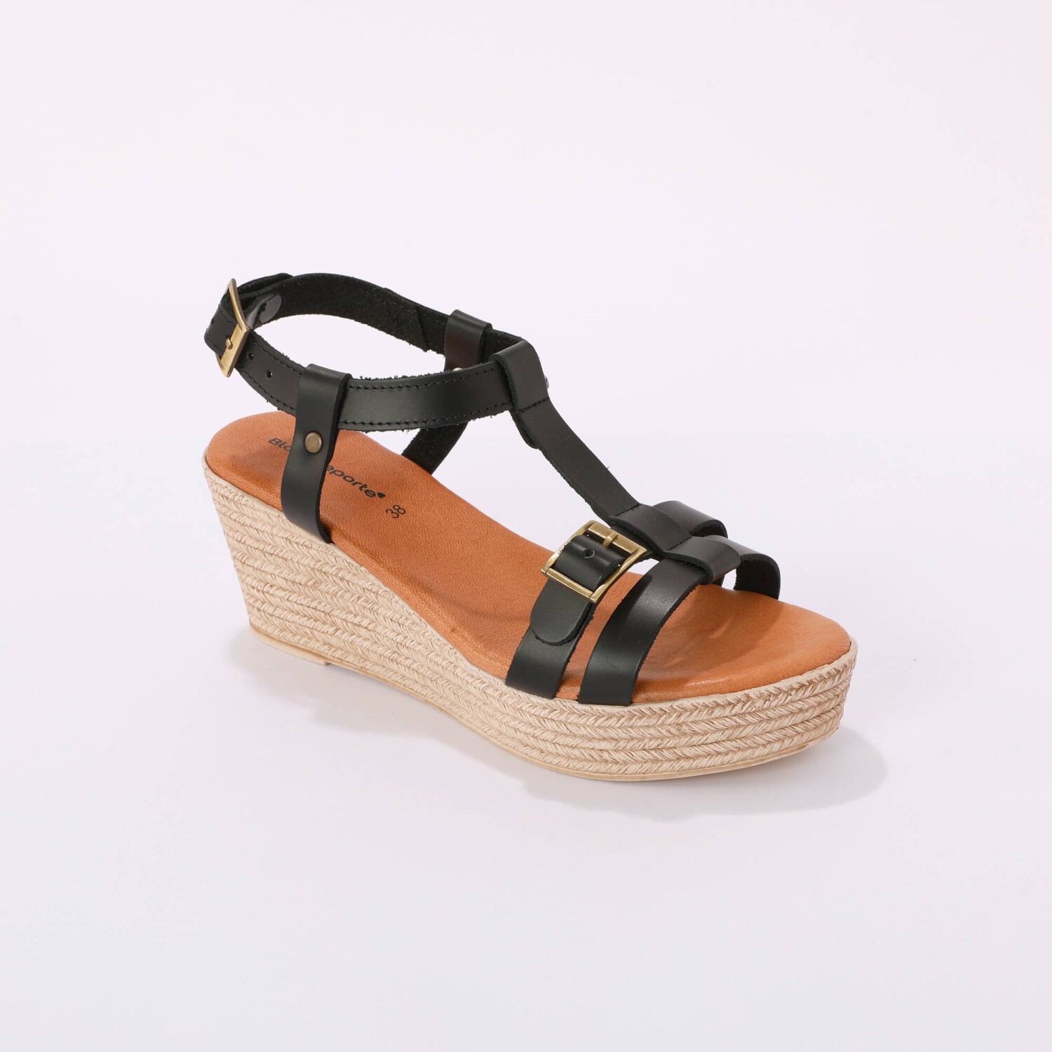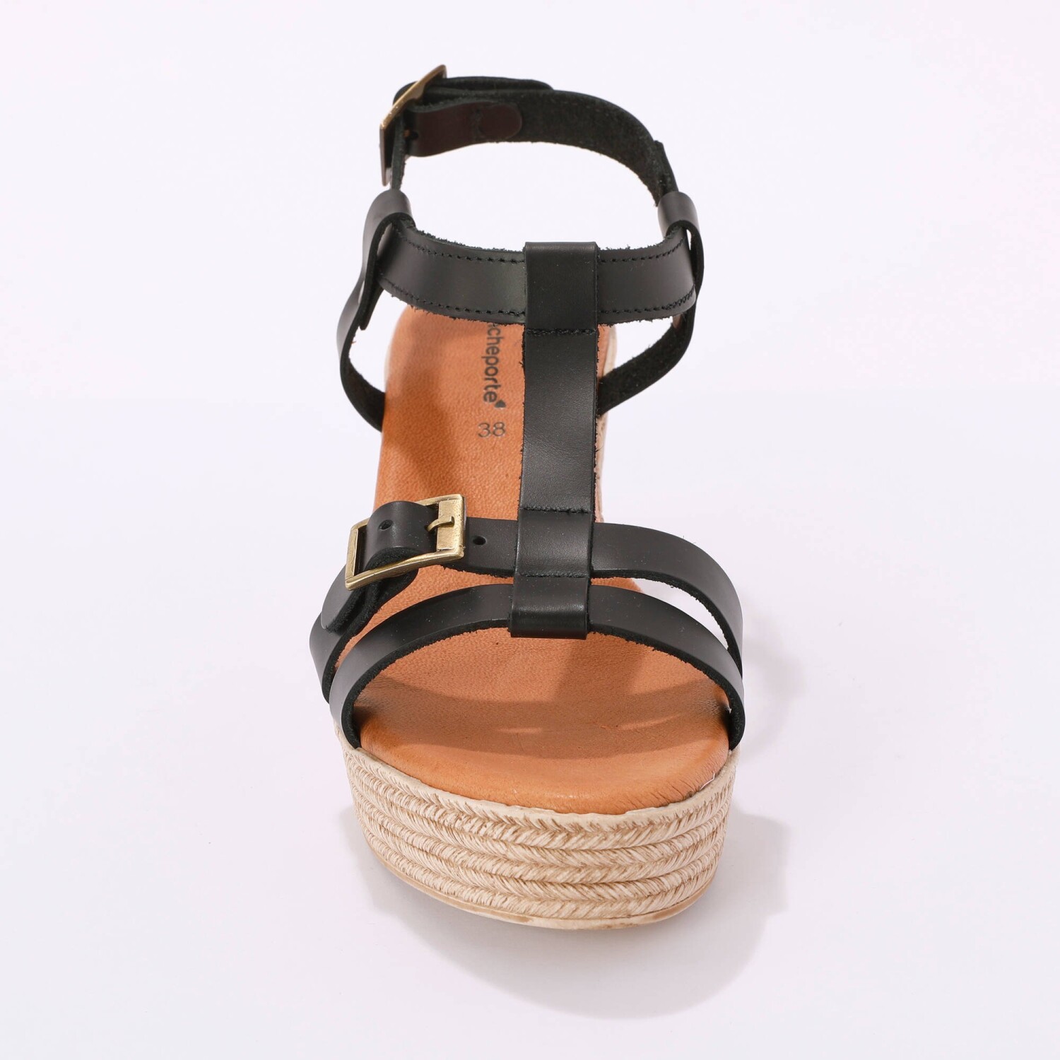 Vychutnajte si leto naplno v kožených sandáloch na klinovom podpätku. Z kvalitnej kože. Dvojité remienky s hranatou sponou v zlatej farby s patinou a nastavením na mieru. Okolo členka nastaviteľný remienok. Kožená stielka umožní priedušnosť chodidla. Penová stielka. Klinový podpätok s letným lykovým efektom. Protišmyková podrážka. Táto obuv je vyrobená z kože, ktorá pochádza z výrobní s certifikátom Leather Working Group, ktorých záväzkom je znížiť dopad na životné prostredie nižšou spotrebou vody a energie.