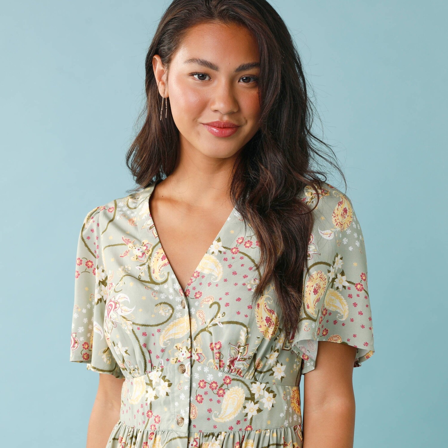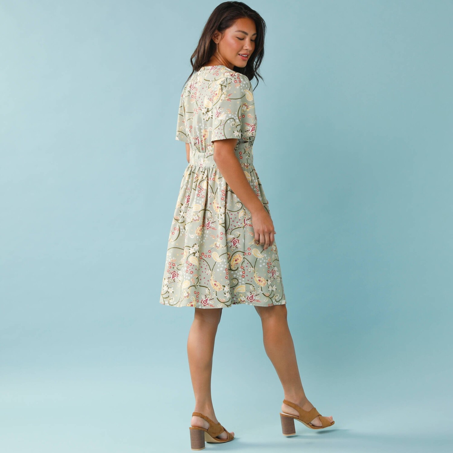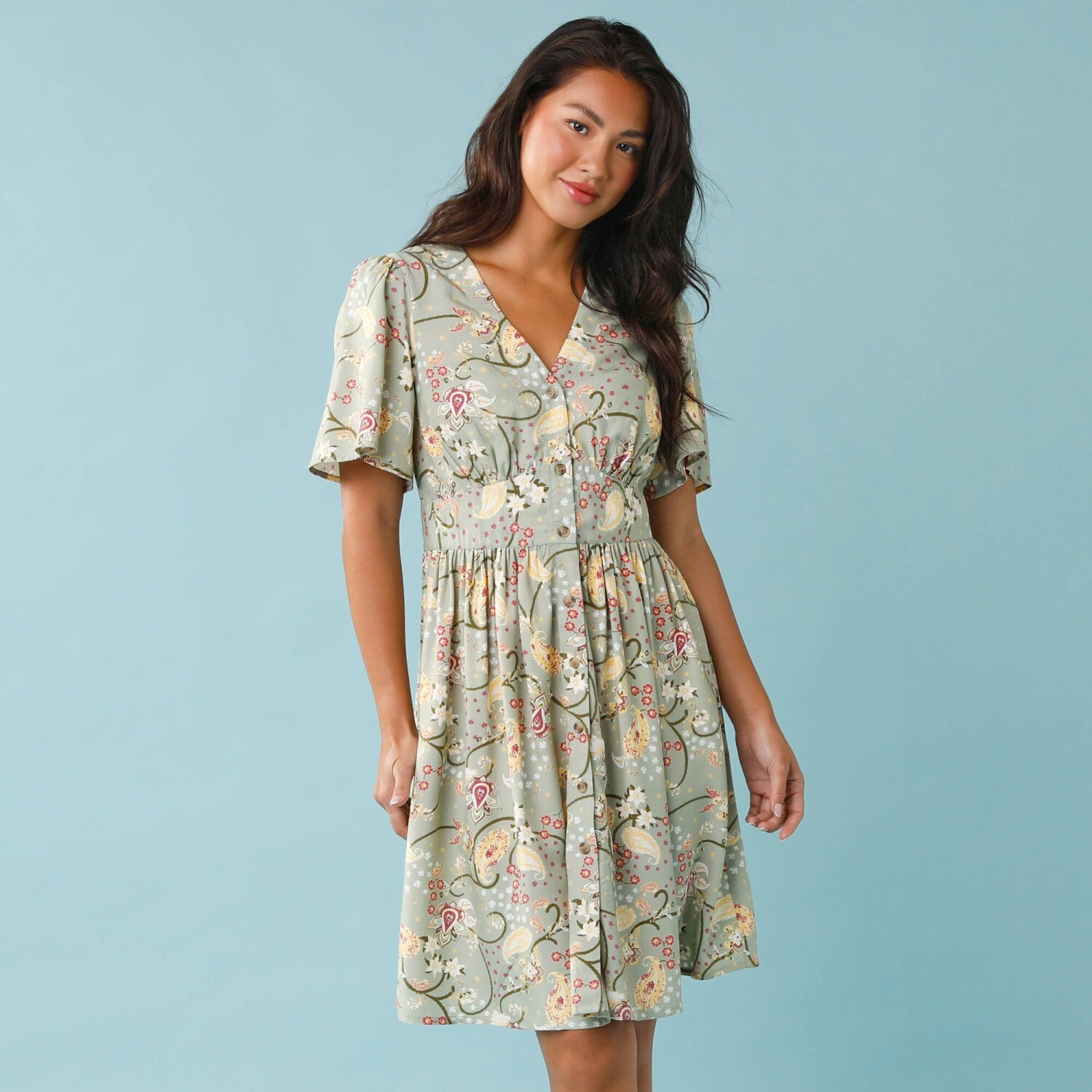 Vzdušné, s gombíkovým zapínaním a potlačou jarného vzoru, krátke šaty sú proporčne navrhnuté pre malú výšku postavy. Výstrih do V. Krátke motýlie rukávy. Nariasené plecia. Vpredu a vzadu v páse široký vsadený pruh s nariasením. Rozšírený dolný lem. Tento produkt bol vyrobený z viskózy Lenzing™ EcoVero™. Ekologická viskóza je materiál vyrobený z buničiny z udržateľne obhospodarovaných lesov. Výrobný proces vyžaduje menej vody a energie. Možno prať v práčke