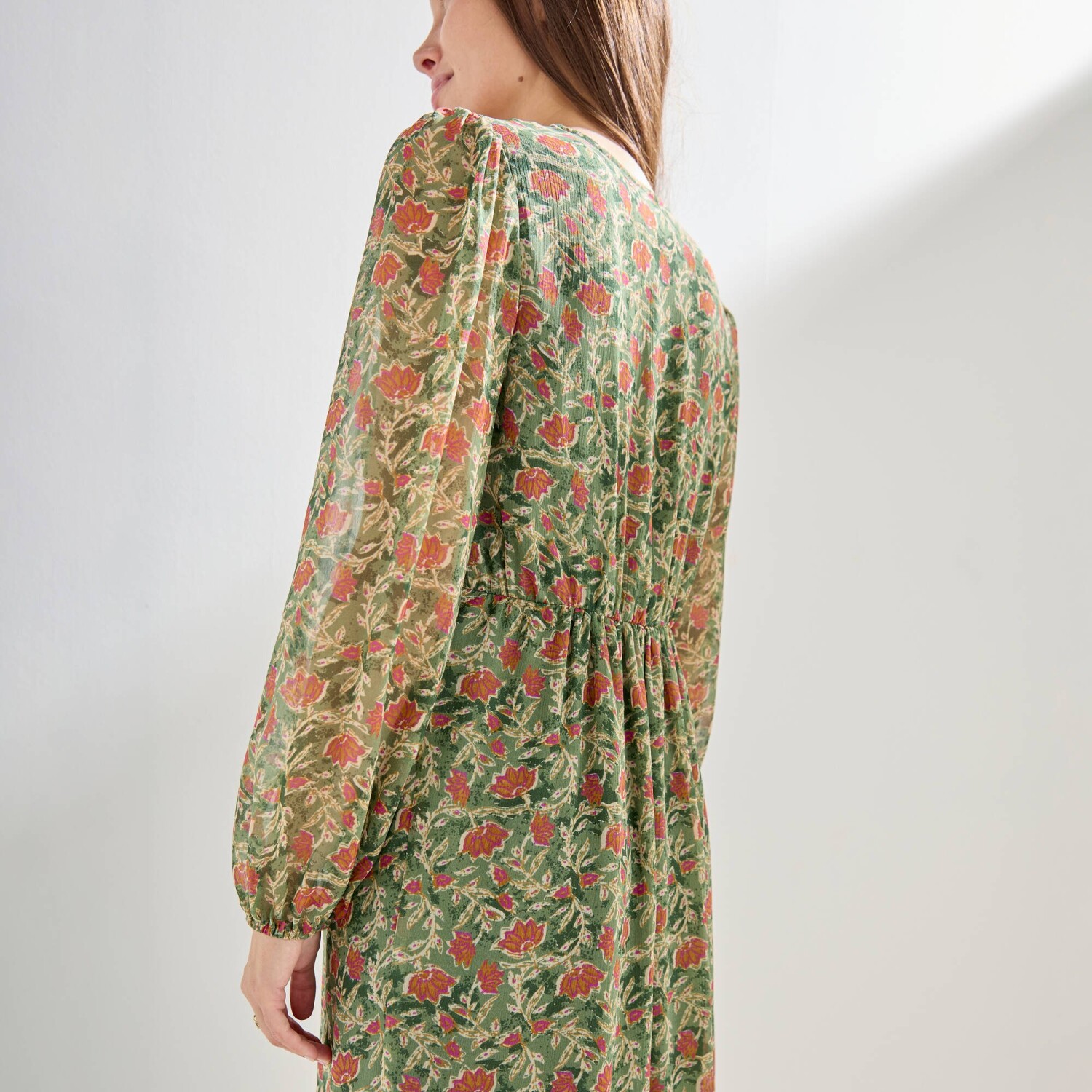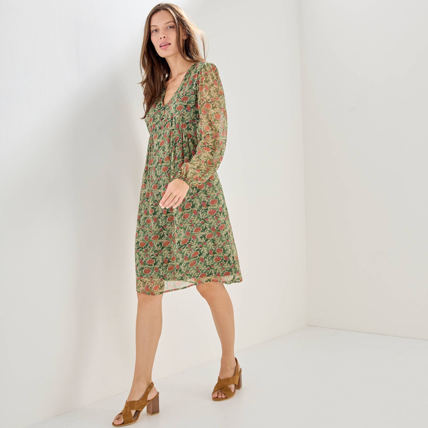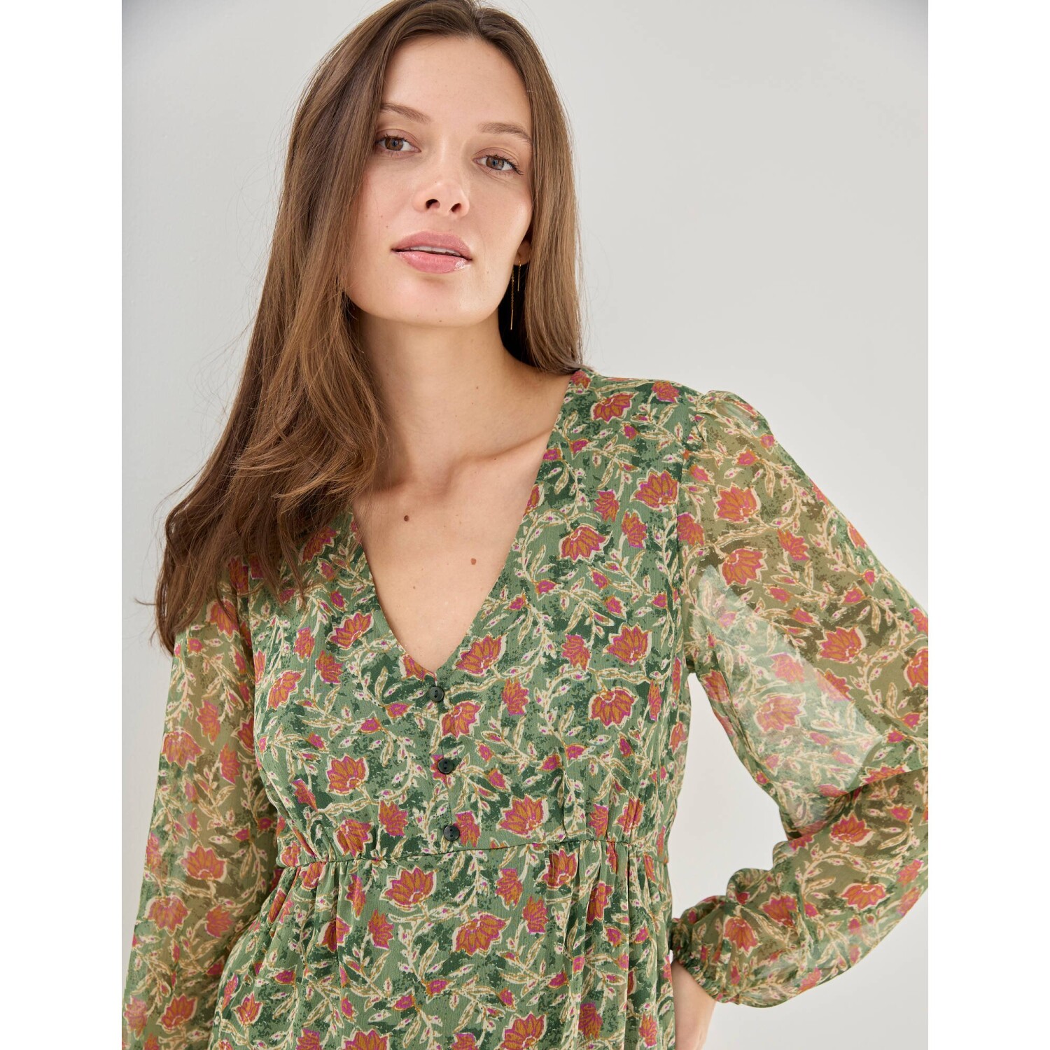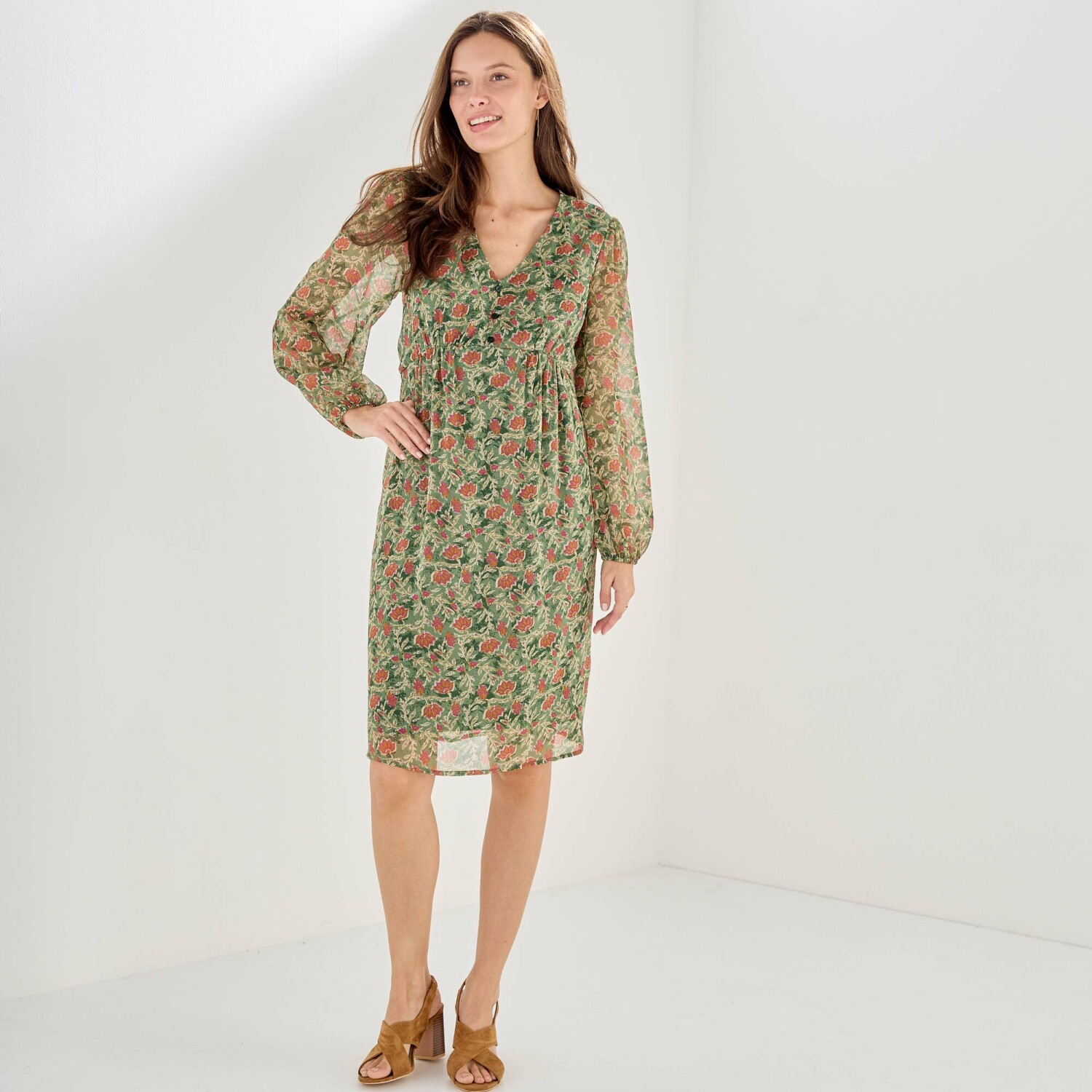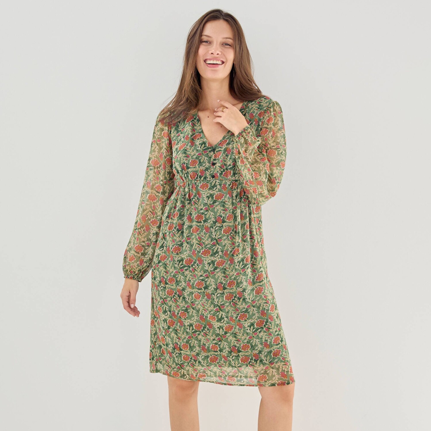 Elegantné a módne šaty s kvetinovým vzorom stavajú na romantickej móde. Jemný voál, trup s úpletovou podšívkou. Výstrih do "V" s 3 gombíkmi. Pod prsiami nariasený prestrih. Vzadu v páse pružný prestrih. Dlhé rukávy s pružnými manžetami. Nariasené plecia. Možno prať v práčke.
