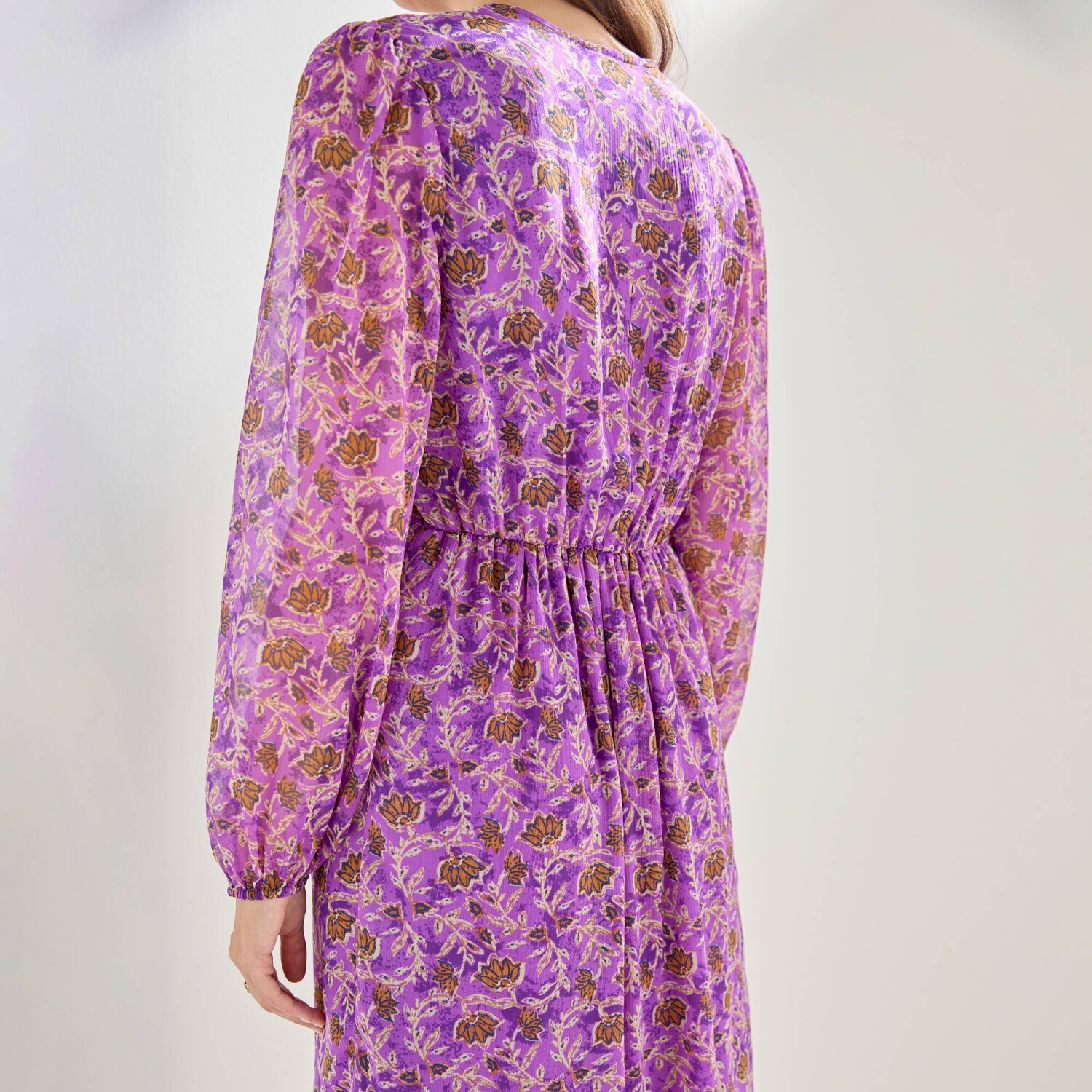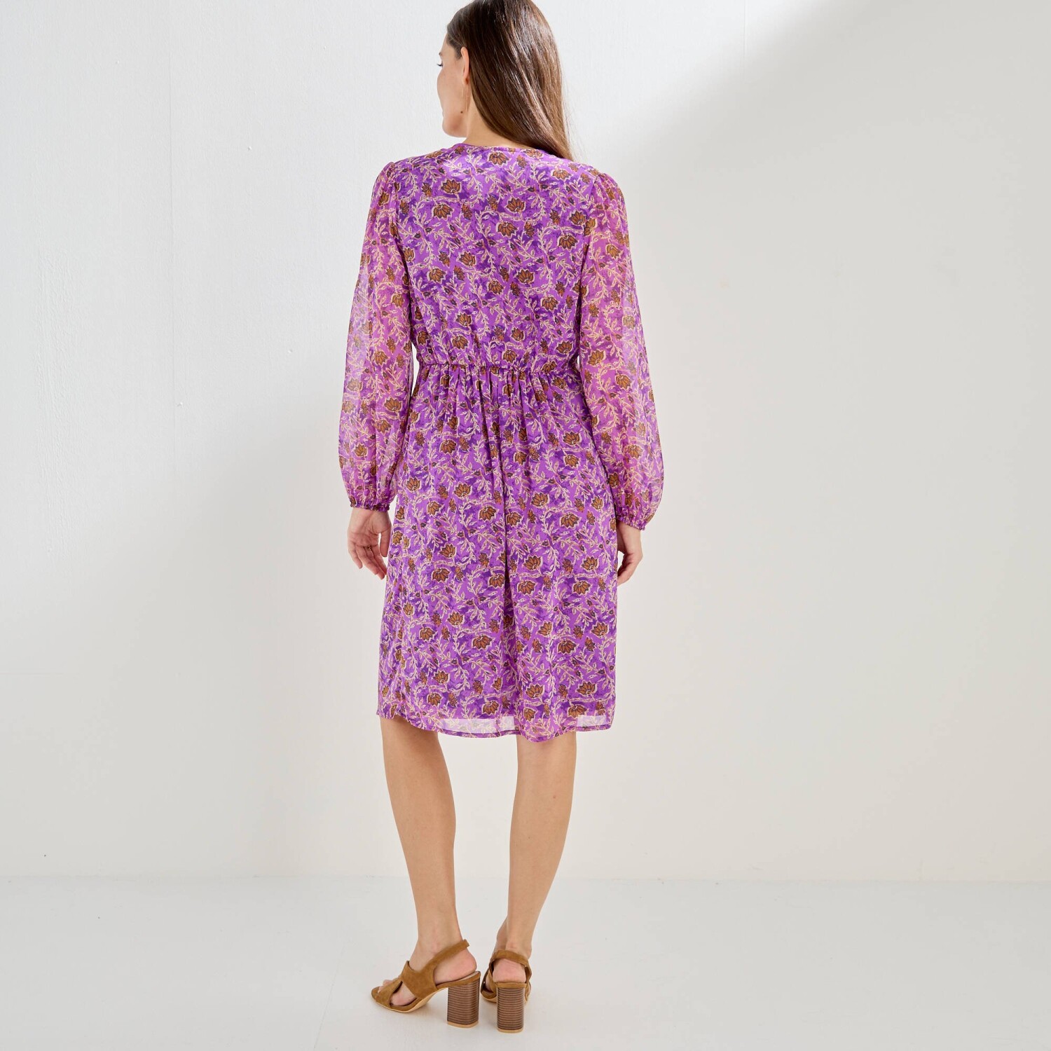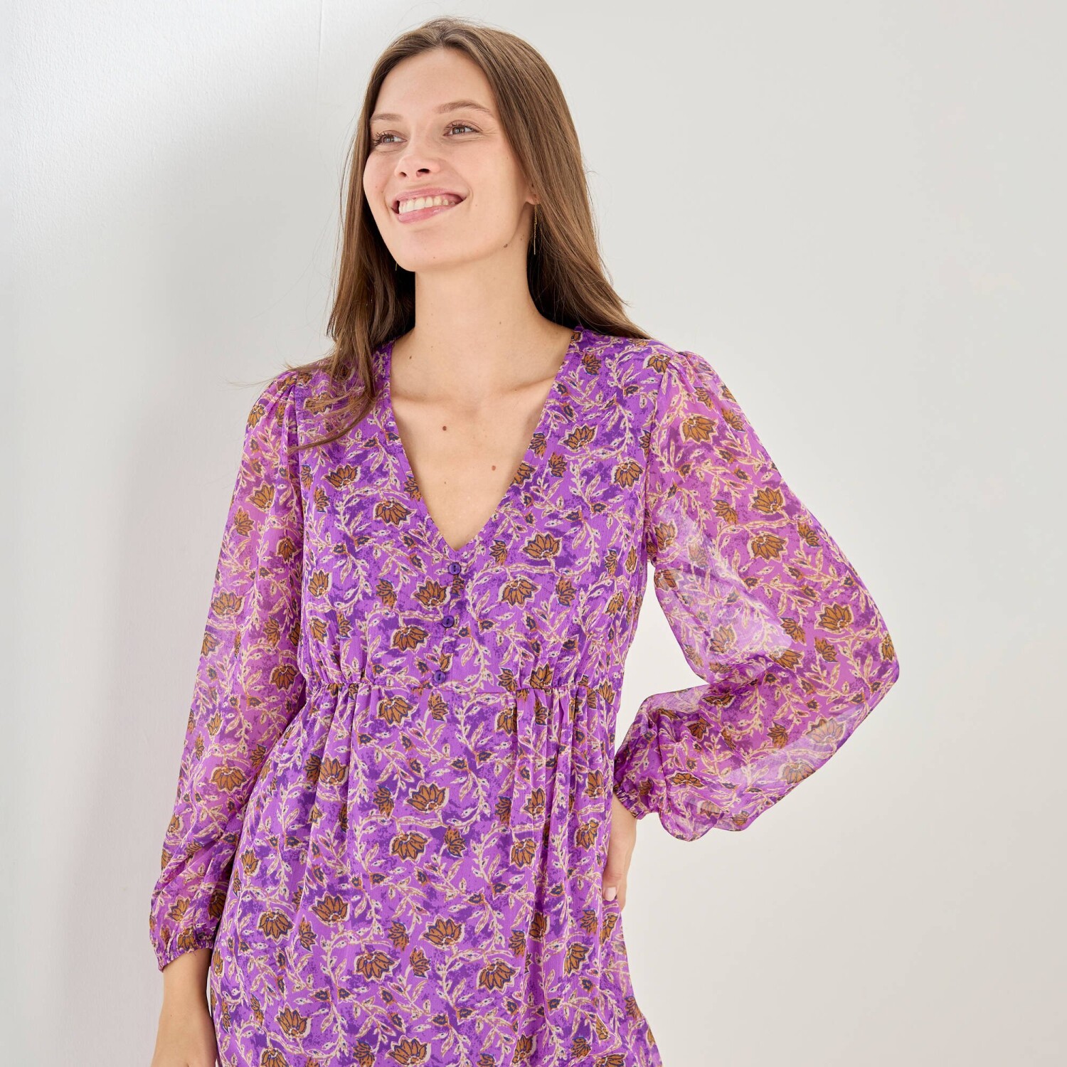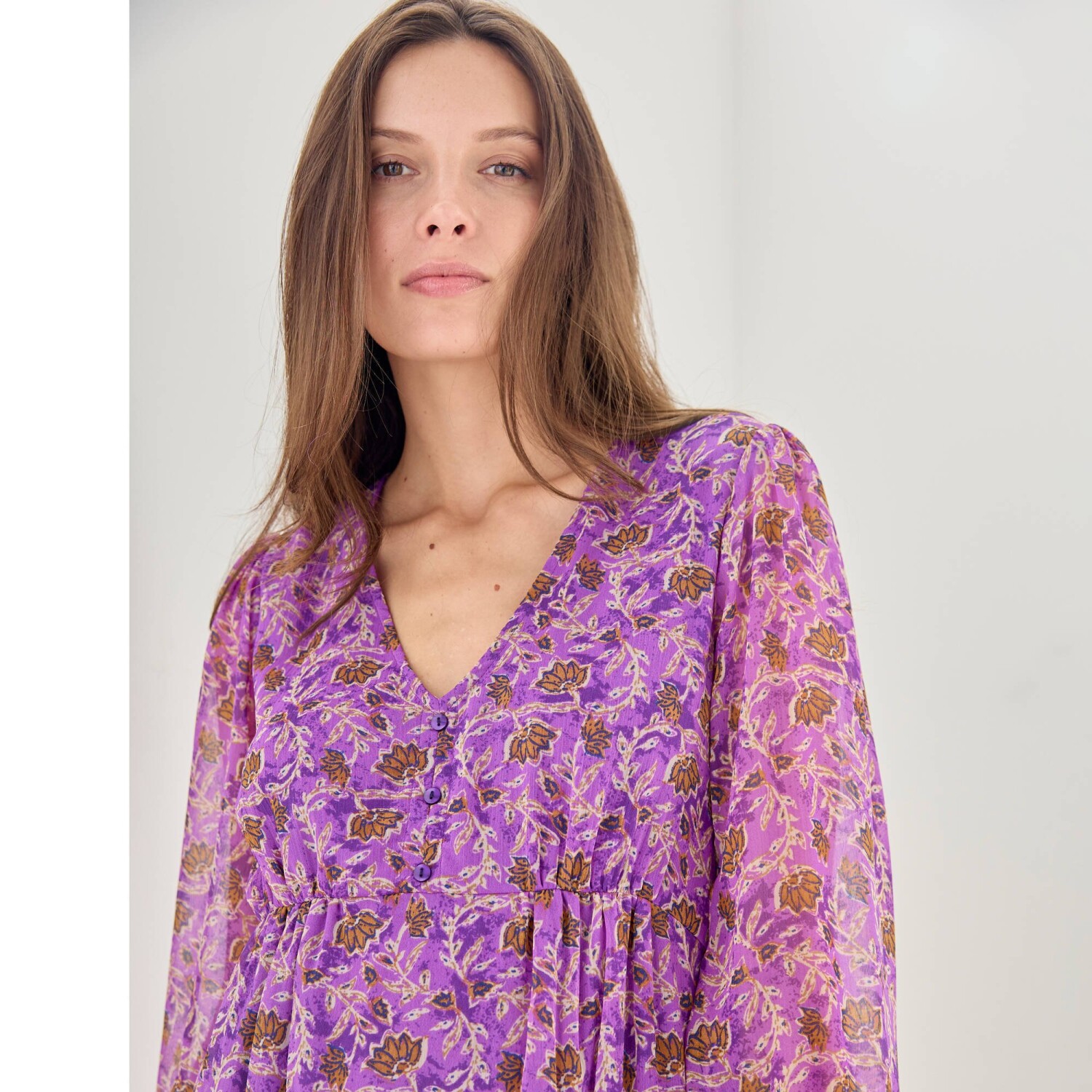 Elegantné a módne šaty s kvetinovým vzorom stavajú na romantickej móde. Jemný voál, trup s úpletovou podšívkou. Výstrih do "V" s 3 gombíkmi. Pod prsiami nariasený prestrih. Vzadu v páse pružný prestrih. Dlhé rukávy s pružnými manžetami. Nariasené plecia. Možno prať v práčke.