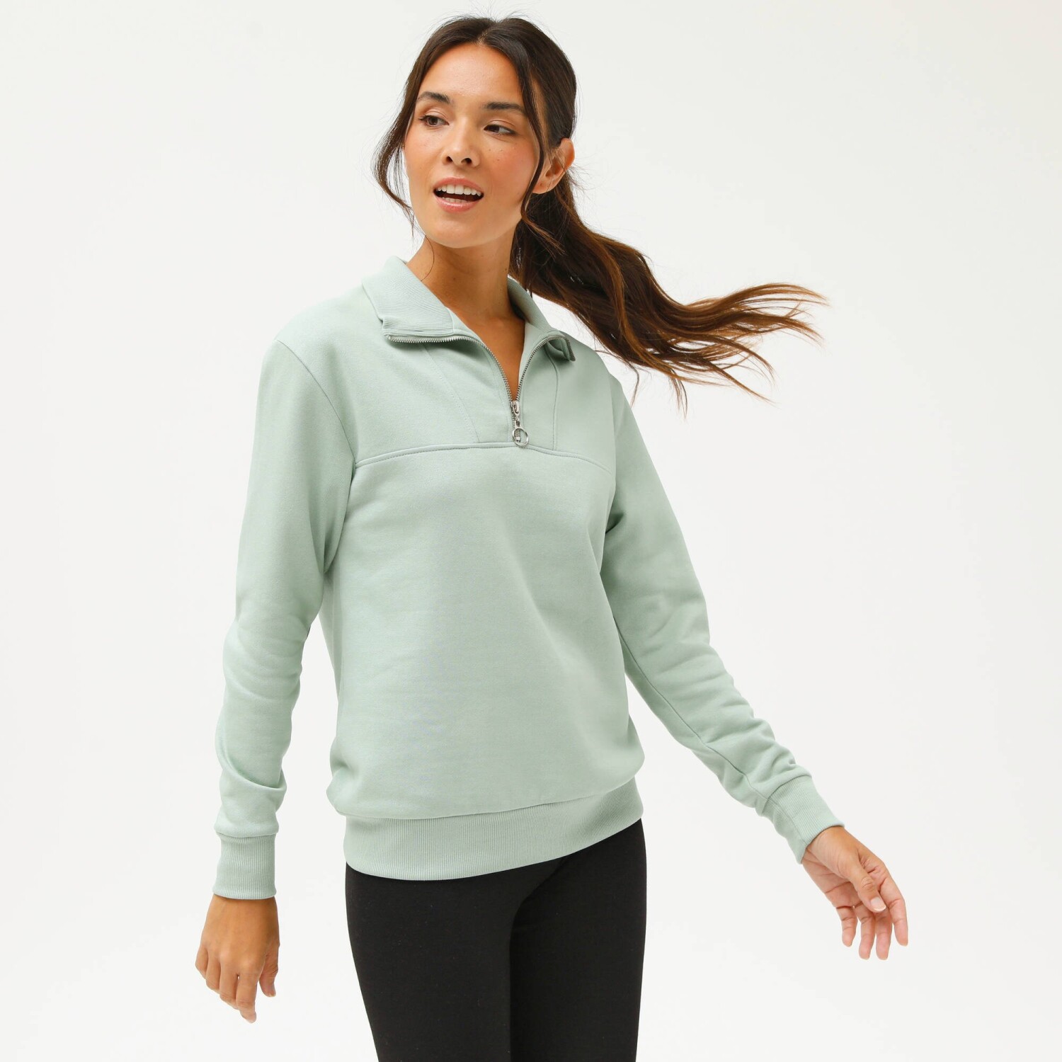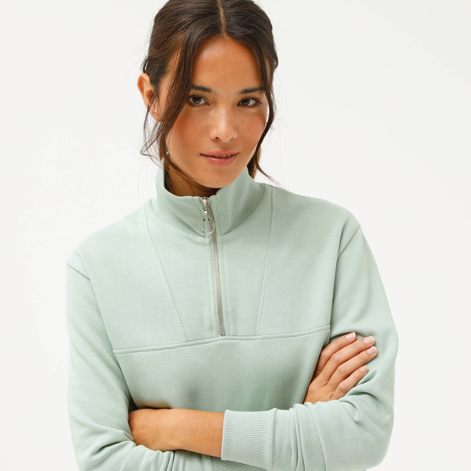 Štýlový módny vzhľad doplní mikina so stojačikom na zips. Mäkký úplet. Stojačik so zipsom a kovovým krúžkom. Vpredu prestrih. Voľné ramená. Dlhé rukávy a rovný spodný lem. Rovný strih. Česané vnútro. Možno prať v práčke.