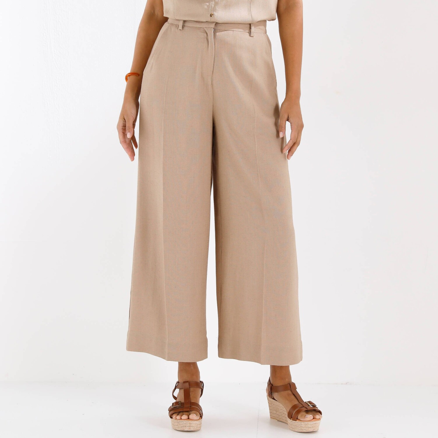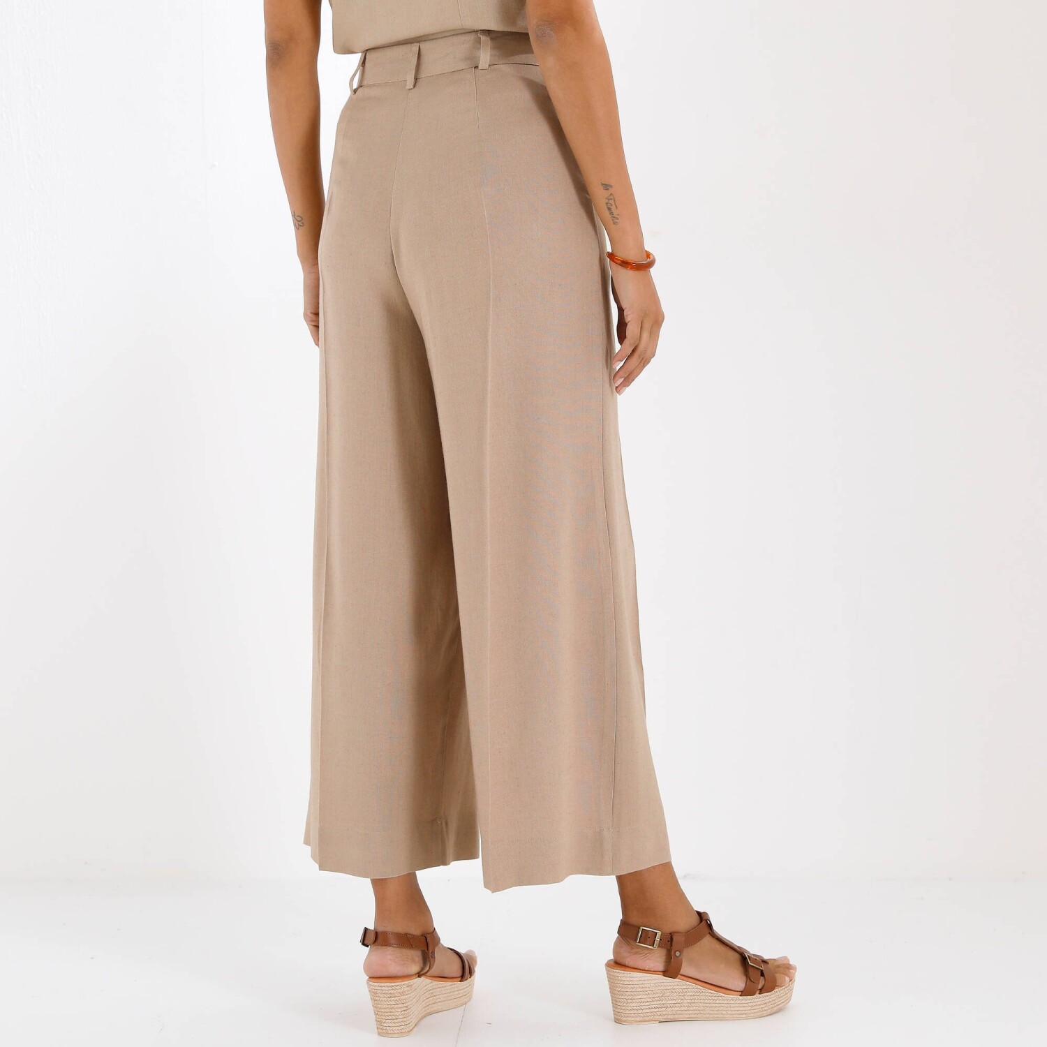 Nohavice s efektom sukne sú skvelým kúskom na privítanie novej sezóny! Pekný materiál. Široký strih. Vysoký pás. Tvarovaný pás s pútkami. Vpredu zips + háčik a vnútorný gombík. 2 klinové vrecká vpredu. 2 záševky vzadu. Puky. Možno prať v práčke.