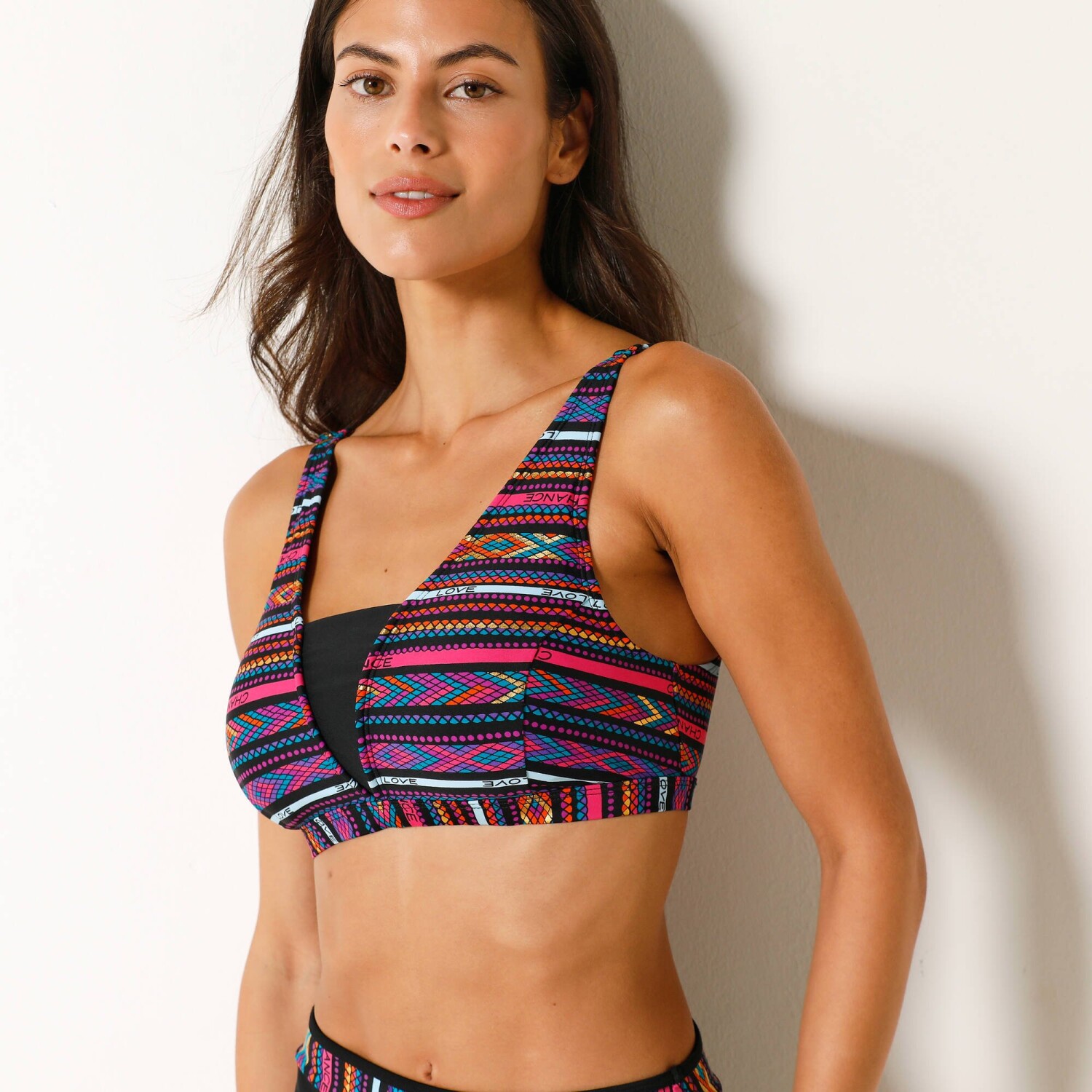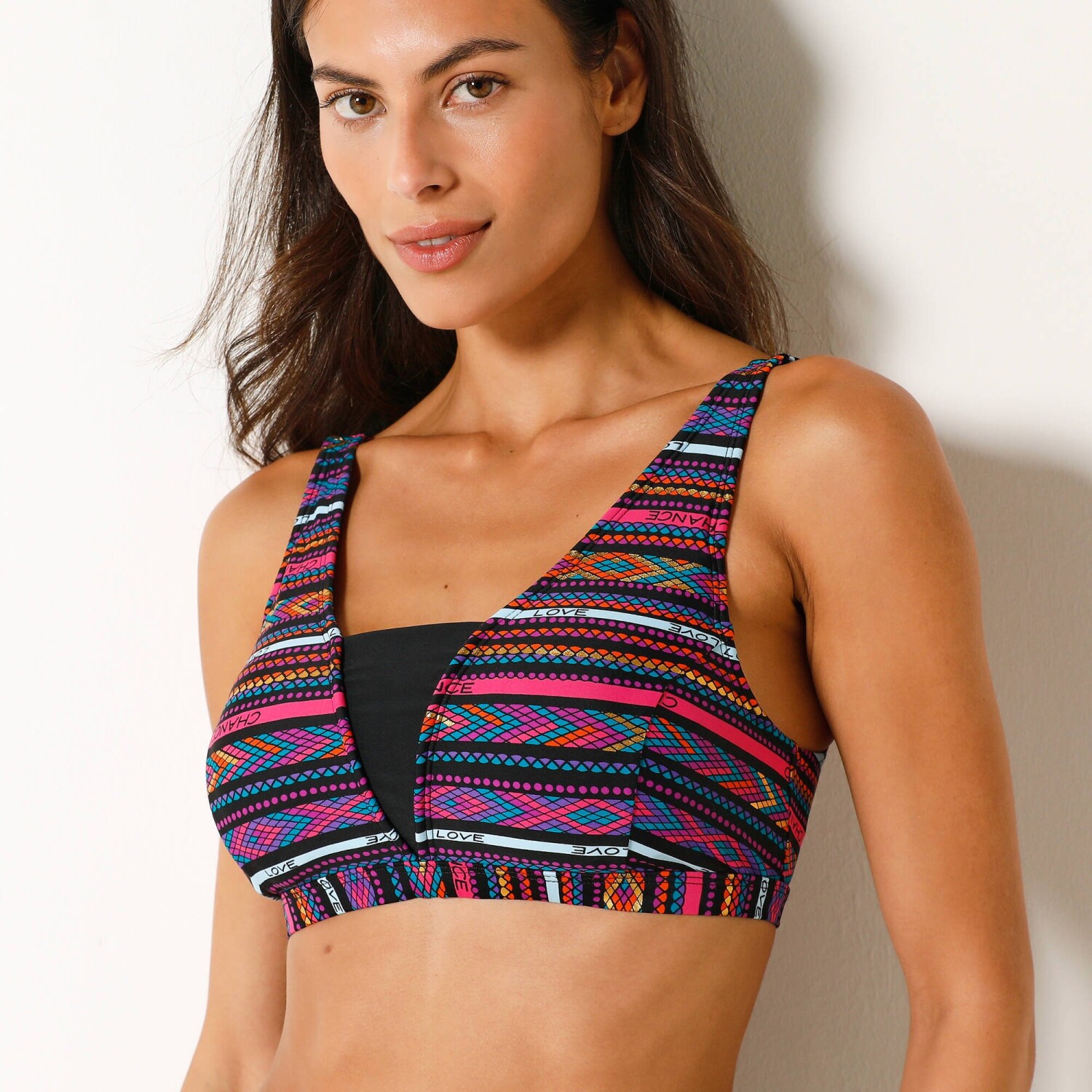Plavková podprsenka Brésilien s potlačou je špeciálne navrhnutá pre ženy po operácii prsníka. Šetrná k pokožke. Matriál s ochranou UV50. Výstrih do "V" s kontrastným čiernym sedlom. košíky v členitom strihu. Integrovaná podprsenka s tvarovanými košíkmi. Pružné otvory na vloženie prsných náhrad. Široké, vzadu nastaviteľné ramienka. Vzadu háčik. Exkluzívna potlač Blancheporte. Standard 100 by Oeko-Tex (n° CQ 1216 / 3 IFTH). Táto známka označuje textilné výrobky, ktoré boli podrobené laboratórnym testom na široké spektrum škodlivých látok a výrobok je bezpečný nad rámec platných noriem. Možno prať v práčke. Po každom použití odporúčame vypláchať v čistej vode. Odolné voči chlóru a vhodné do bazéna.