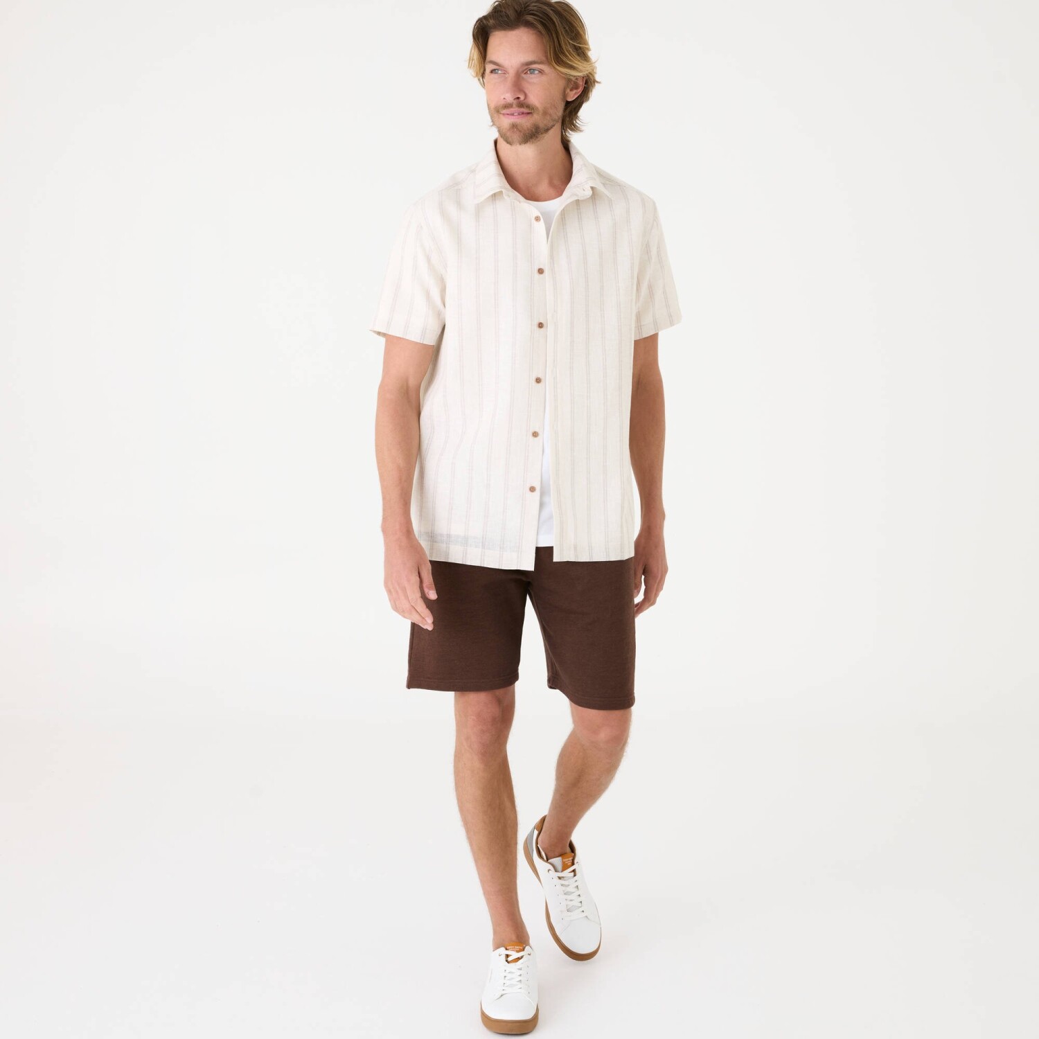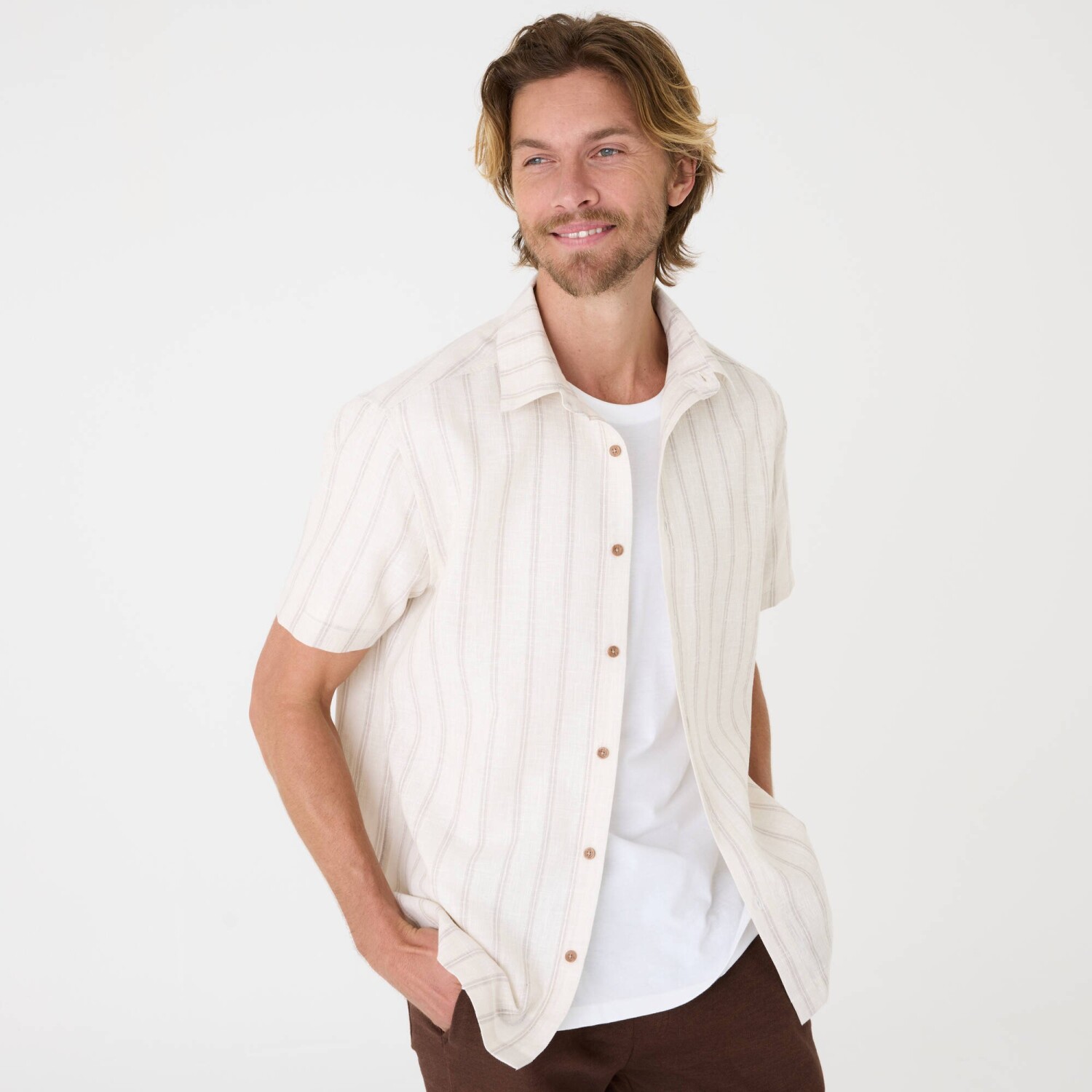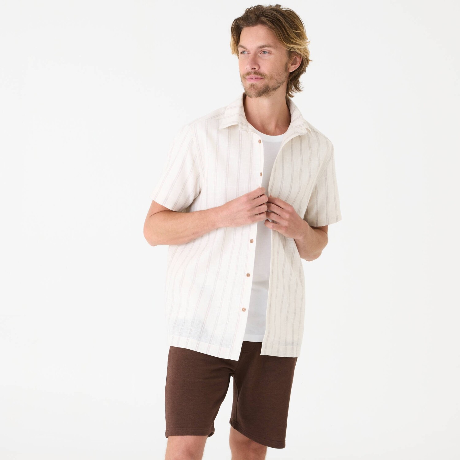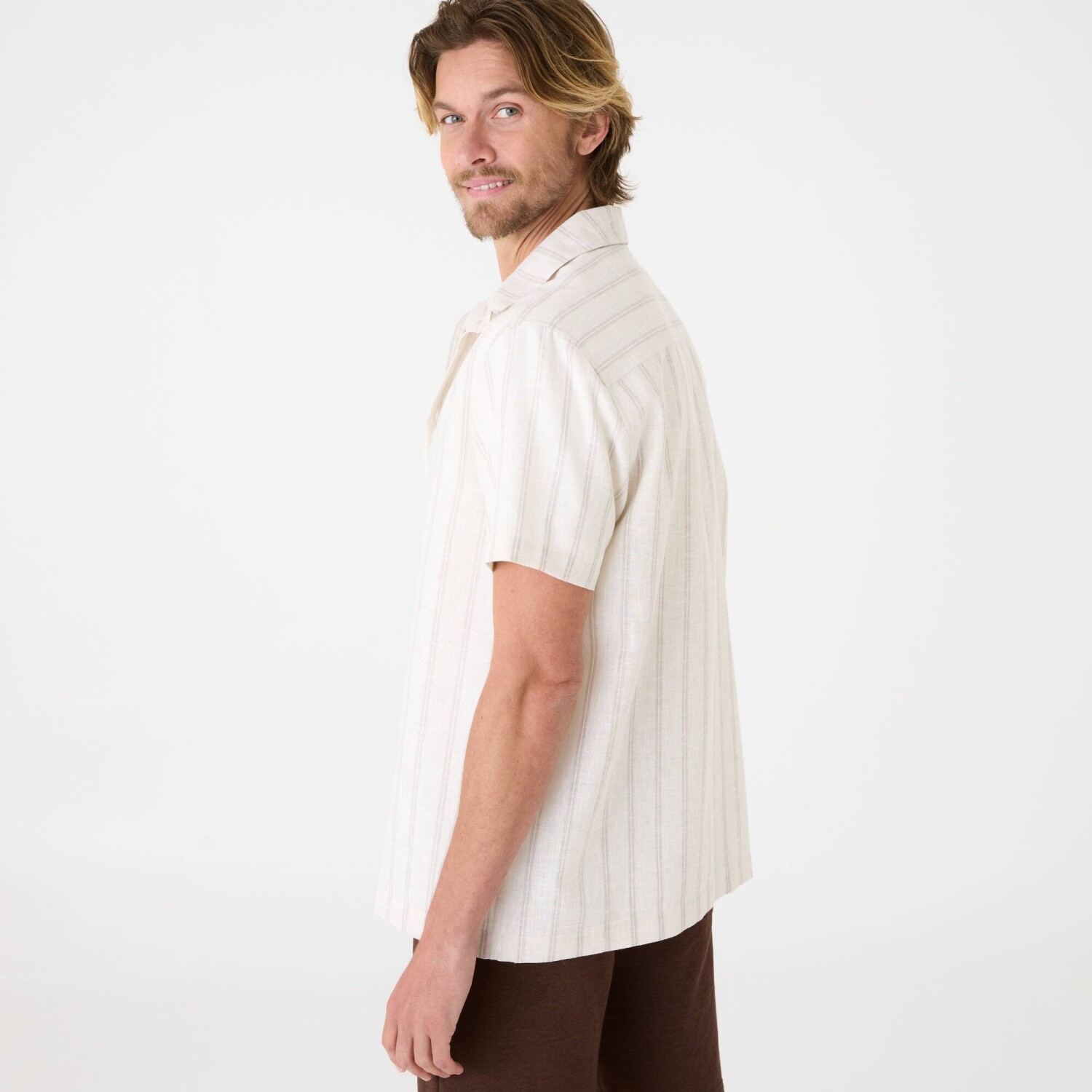 Diskrétne pruhy zdobia košeľu s krátkymi rukávmi. Z polycotonu s textúrovaným vzorom. Ideálna na letnú sezónu. Pruhy z farbených vlákien. Košeľový golier. Na gombíky. Krátke rukávy. Vzadu podšité sedlo. Rovný dolný lem. Možno prať v práčke.