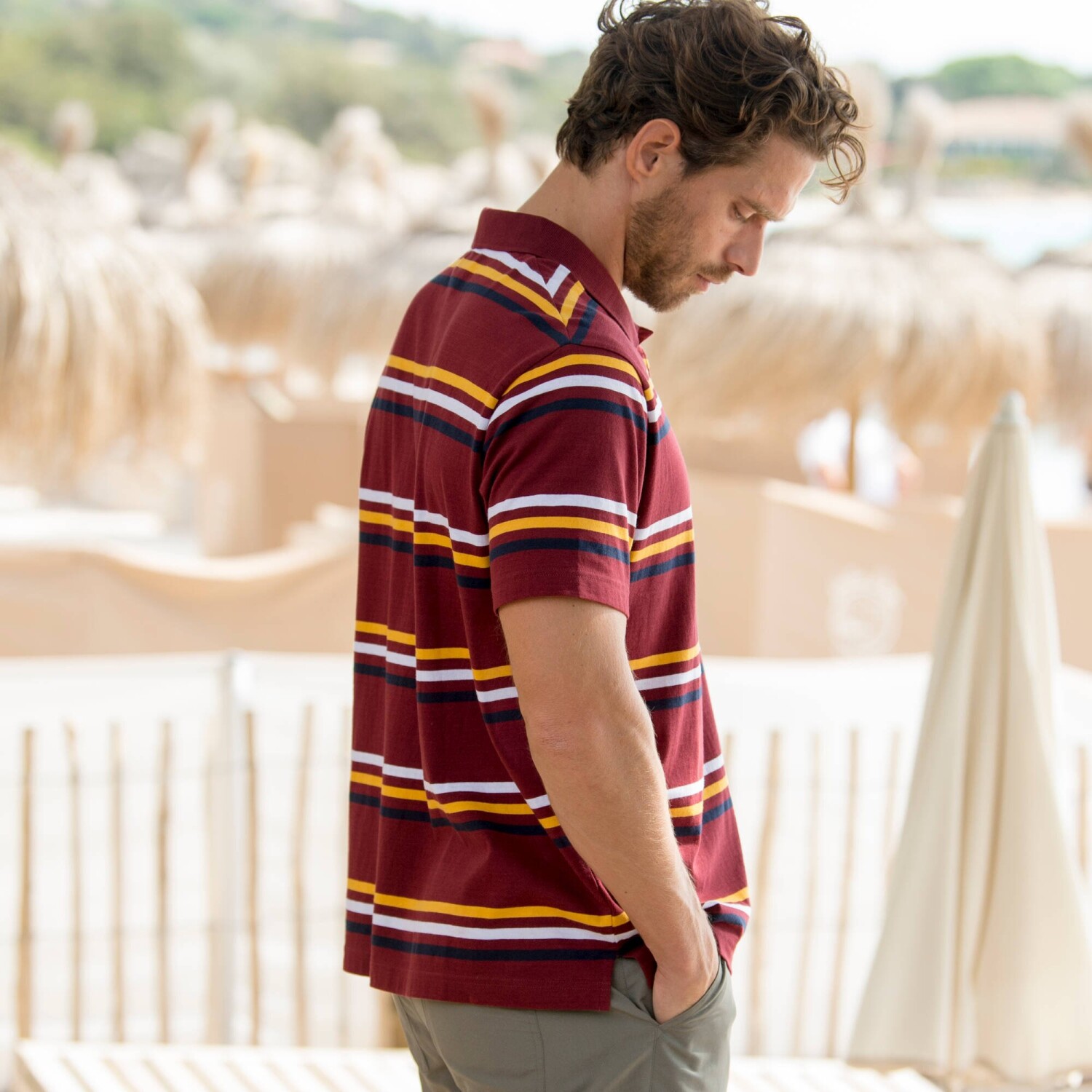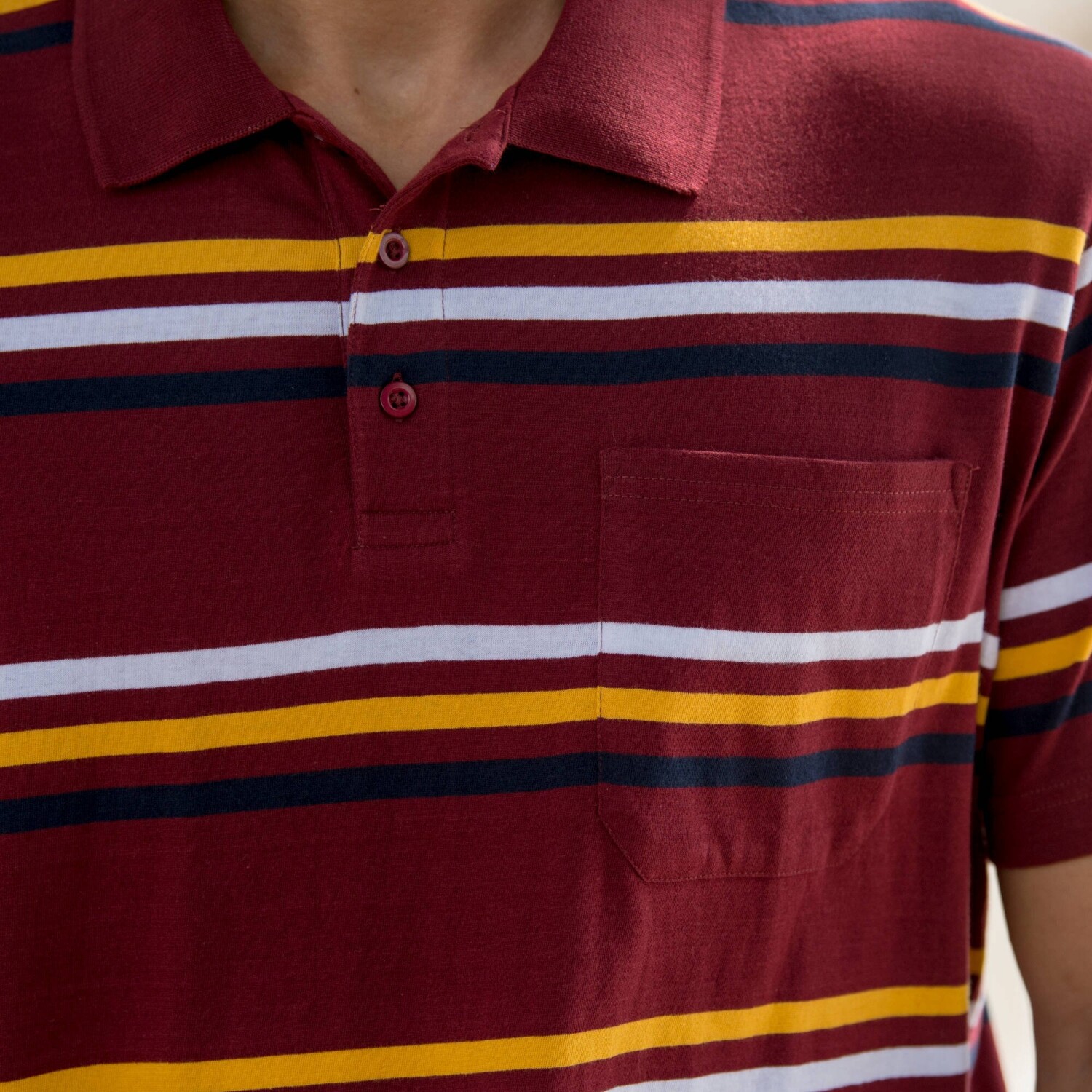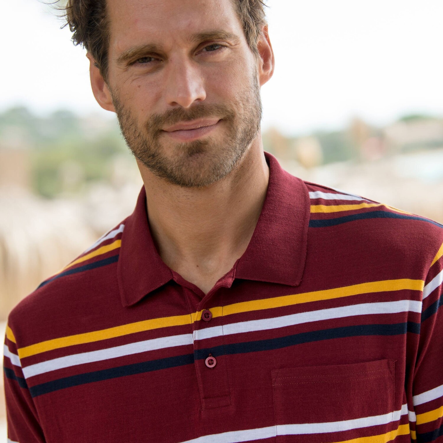 Štýl a pohodlie sa stretávajú v pruhovanom polo tričku z prirodzene jemnej bavlny! Pruhy z farbených vlákien. Vrúbkovaný golier a gombíková léga. 1 náprsné vrecko. Krátke rukávy. Rovný spodný lem s rozparkami na bokoch. Standard 100 by Oeko-Tex (n° CQ 1216/3 IFTH). Táto známka označuje textilné výrobky, ktoré boli podrobené laboratórnym testom na široké spektrum škodlivých látok a výrobok je bezpečný nad rámec platných noriem. Možno prať v práčke.