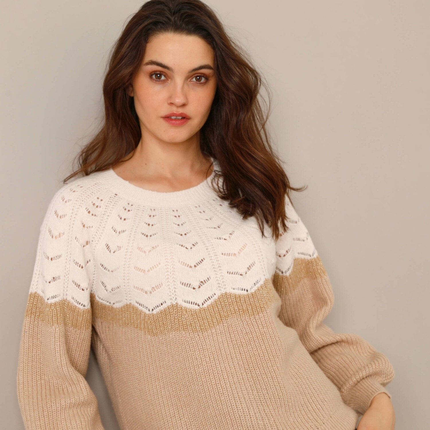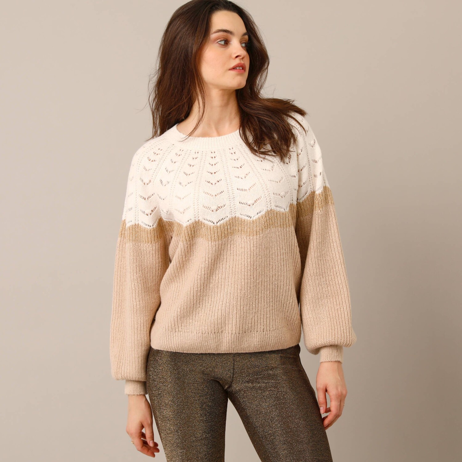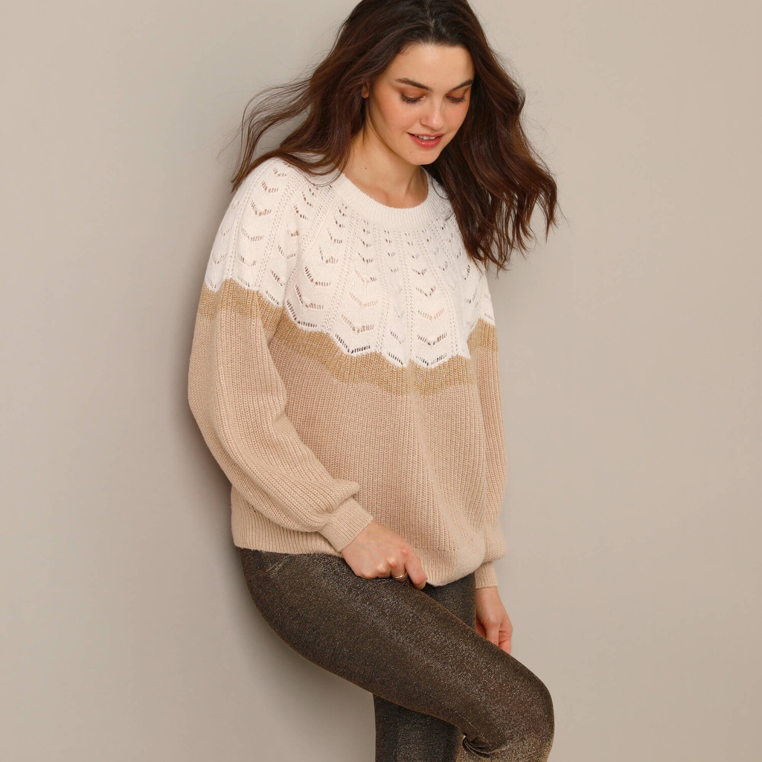Rozjasnite módnu sezónu týmto očarujúcim pulóvrom s hladkým vzorom! Jemný model s lesklými pruhmi dodá Vašim sezónnym outfitom žiarivý nádych. Hladký vzor a originálne a ažúrové vzory. Okrúhly výstrih s ažúrou. Raglánové prieramky. Zlatý trblietavý pruh uprostred. Nazberané rukávy s vrúbkovaným zakončením. Spodný lem zúžený vrúbkovaním. Možno prať v práčke.