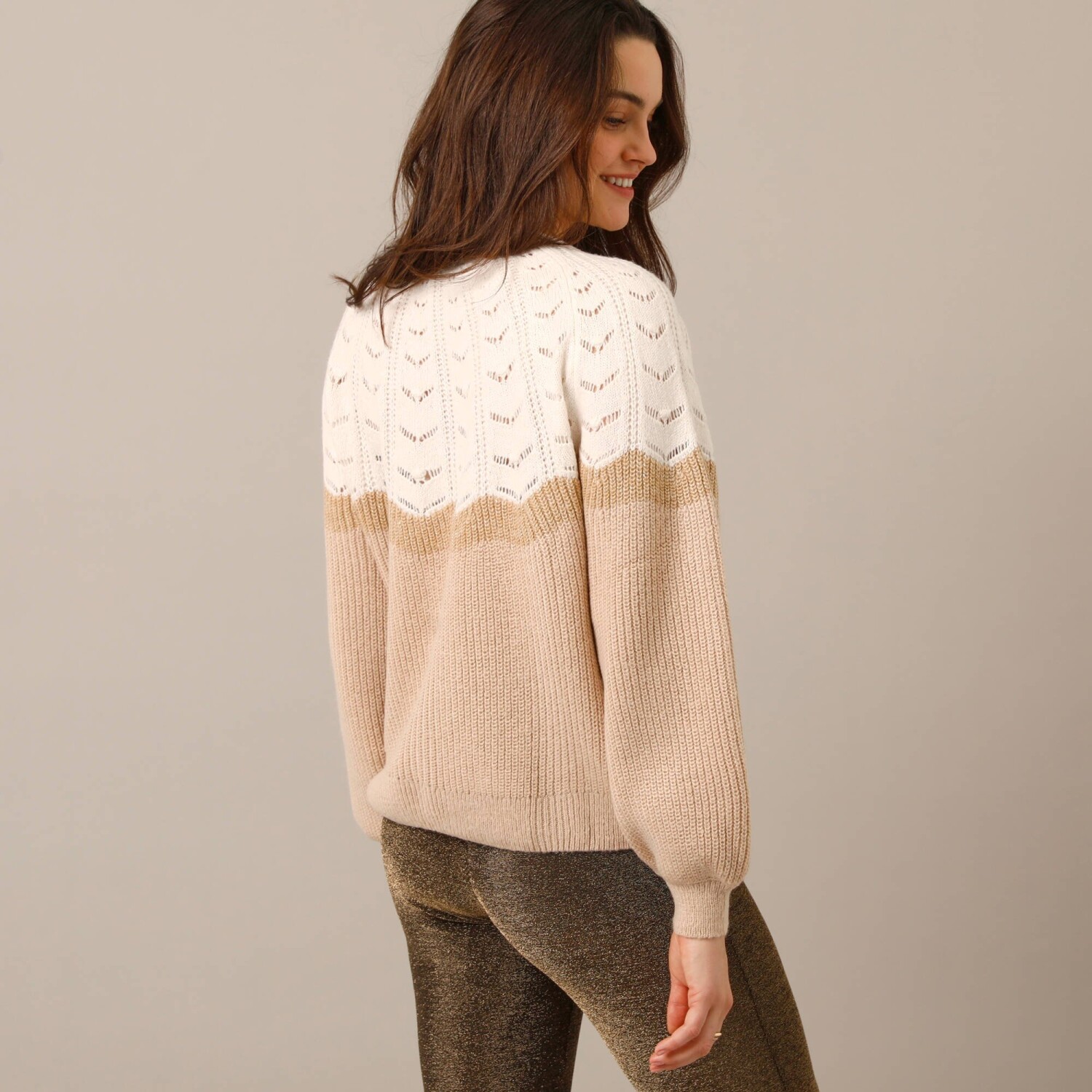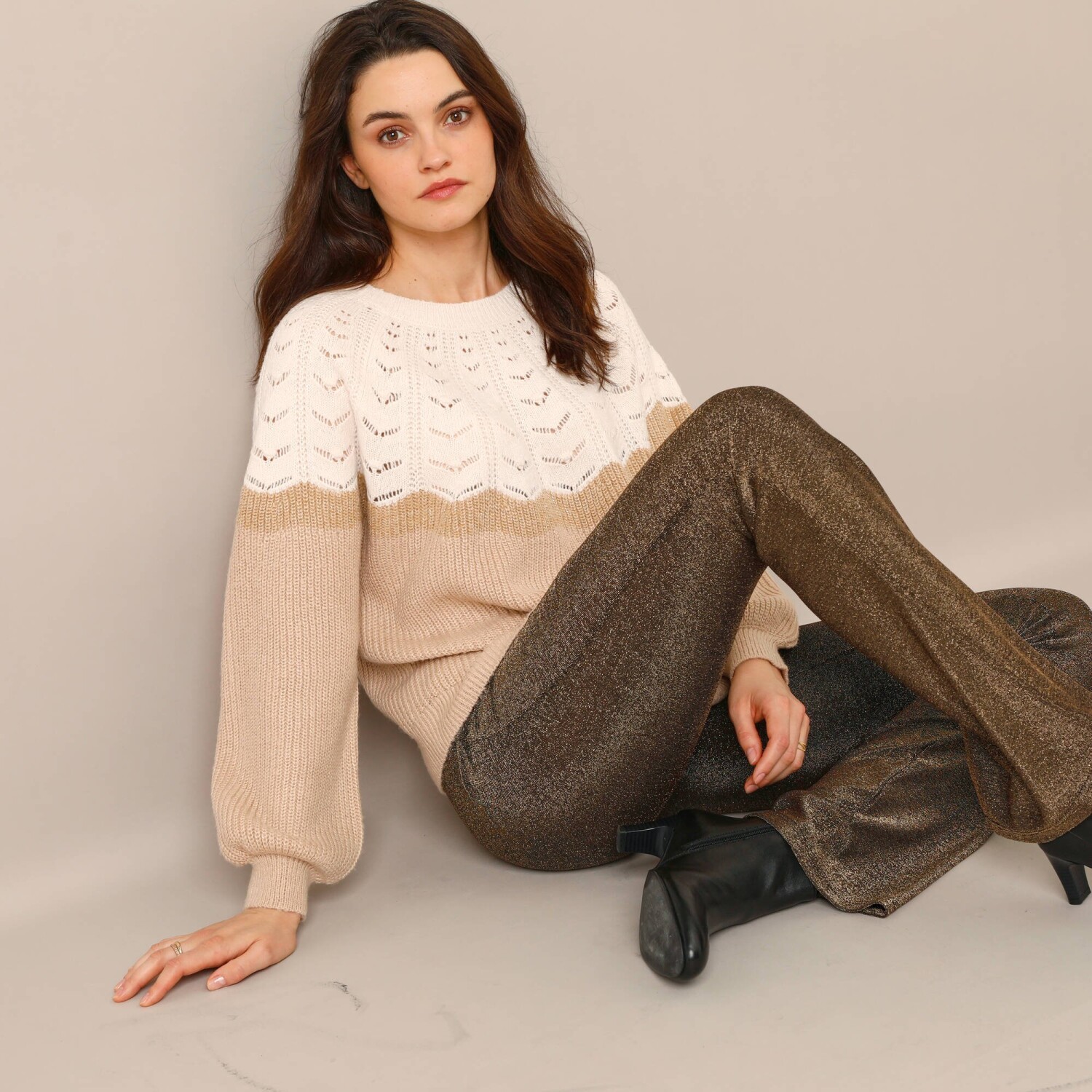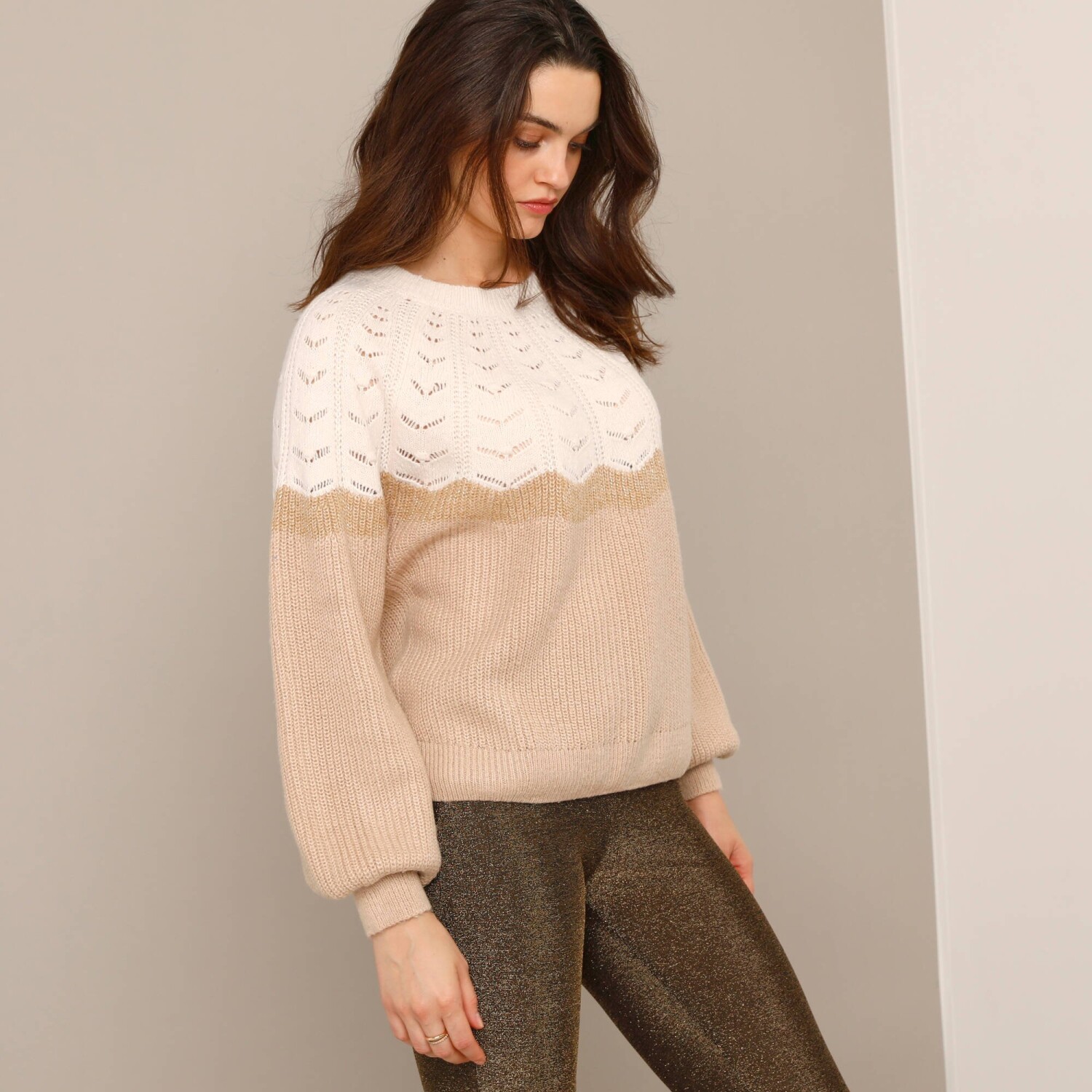 Rozjasnite módnu sezónu týmto očarujúcim pulóvrom s hladkým vzorom! Jemný model s lesklými pruhmi dodá Vašim sezónnym outfitom žiarivý nádych. Hladký vzor a originálne a ažúrové vzory. Okrúhly výstrih s ažúrou. Raglánové prieramky. Zlatý trblietavý pruh uprostred. Nazberané rukávy s vrúbkovaným zakončením. Spodný lem zúžený vrúbkovaním. Možno prať v práčke.
