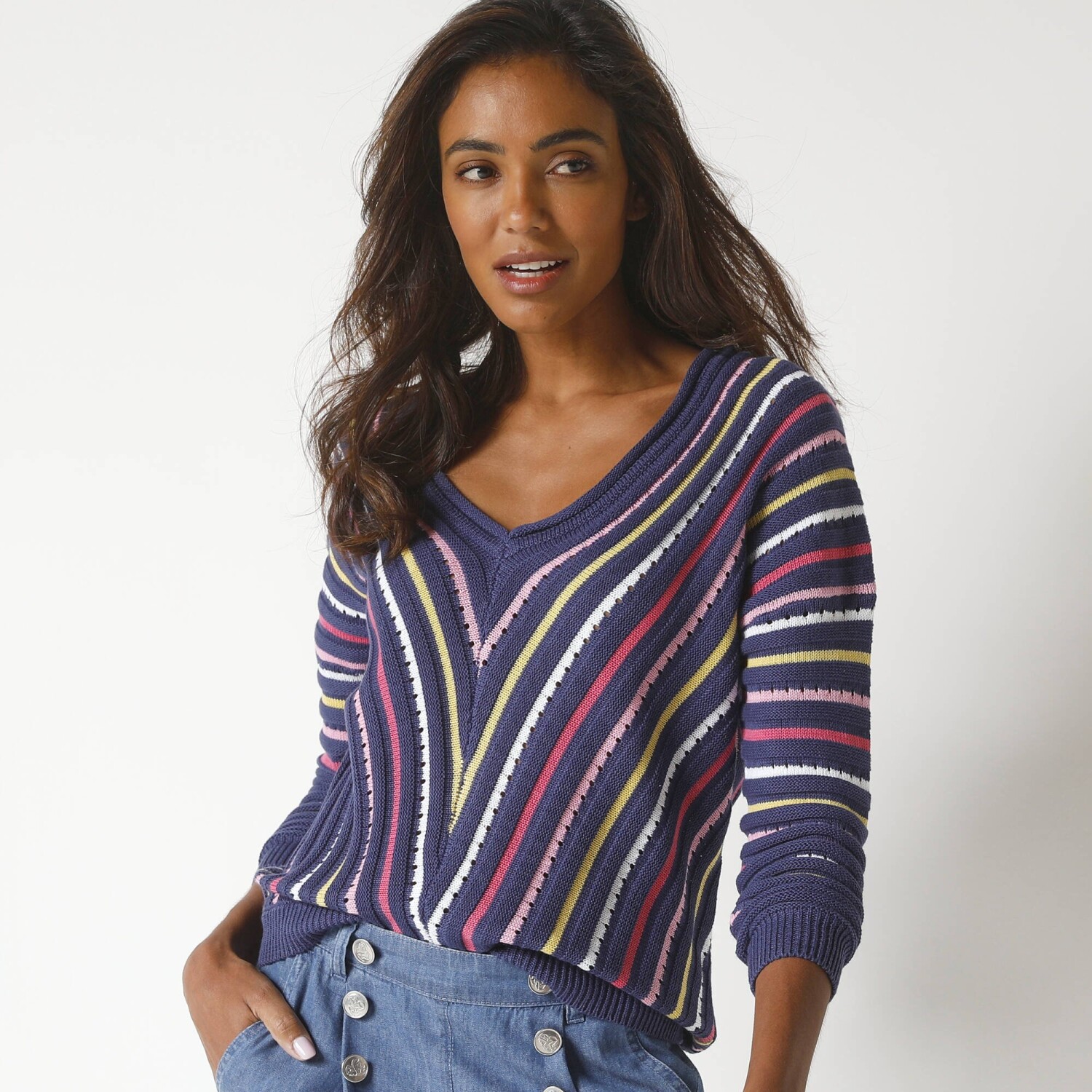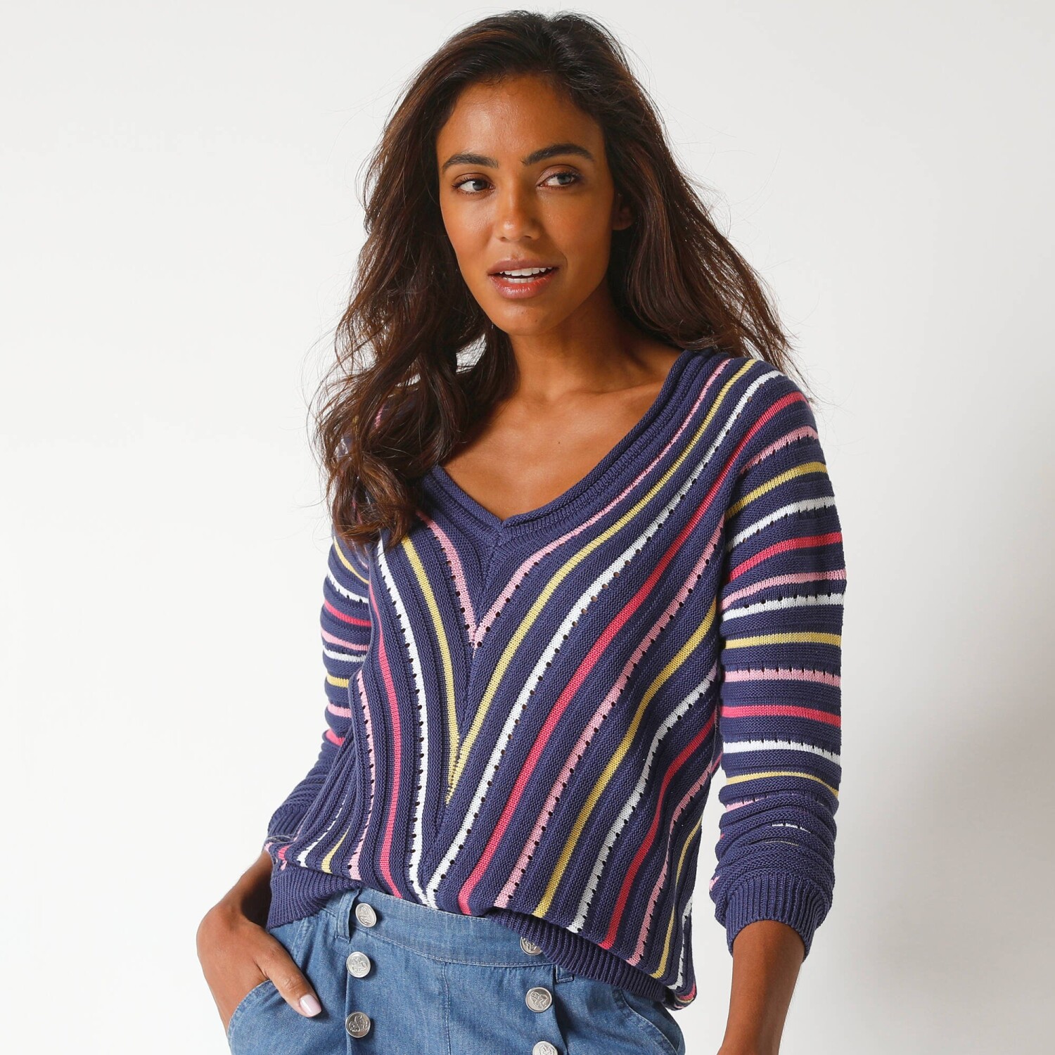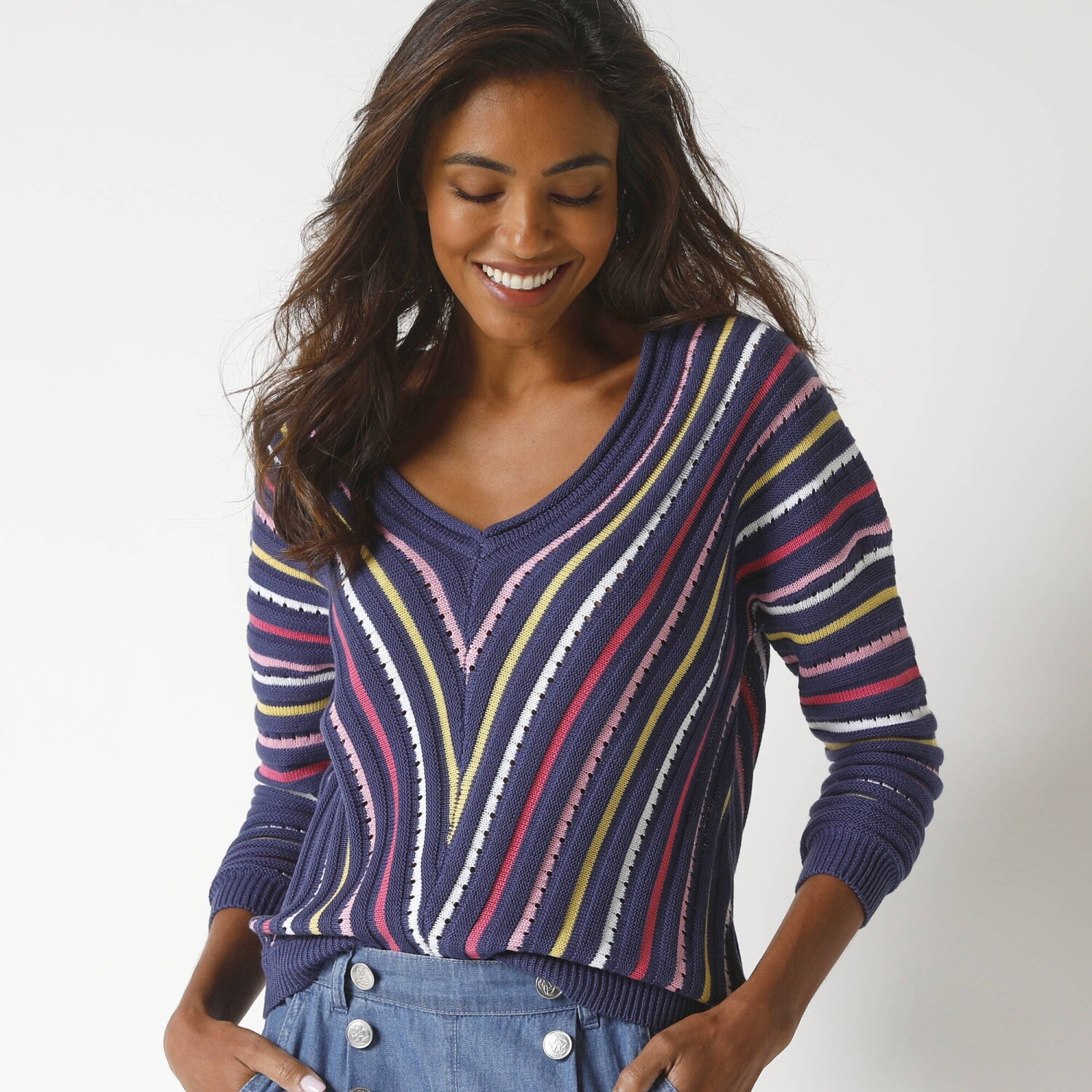 Ľahký a farebný pulóver sa ľahko kombinuje, záleží na Vašej fantázii. Výstrih do "V". Ažúrový vzor. Grafické pruhy (vpredu a vzadu). Dlhé rukávy. Rovný dolný lem. Možno prať v práčke.