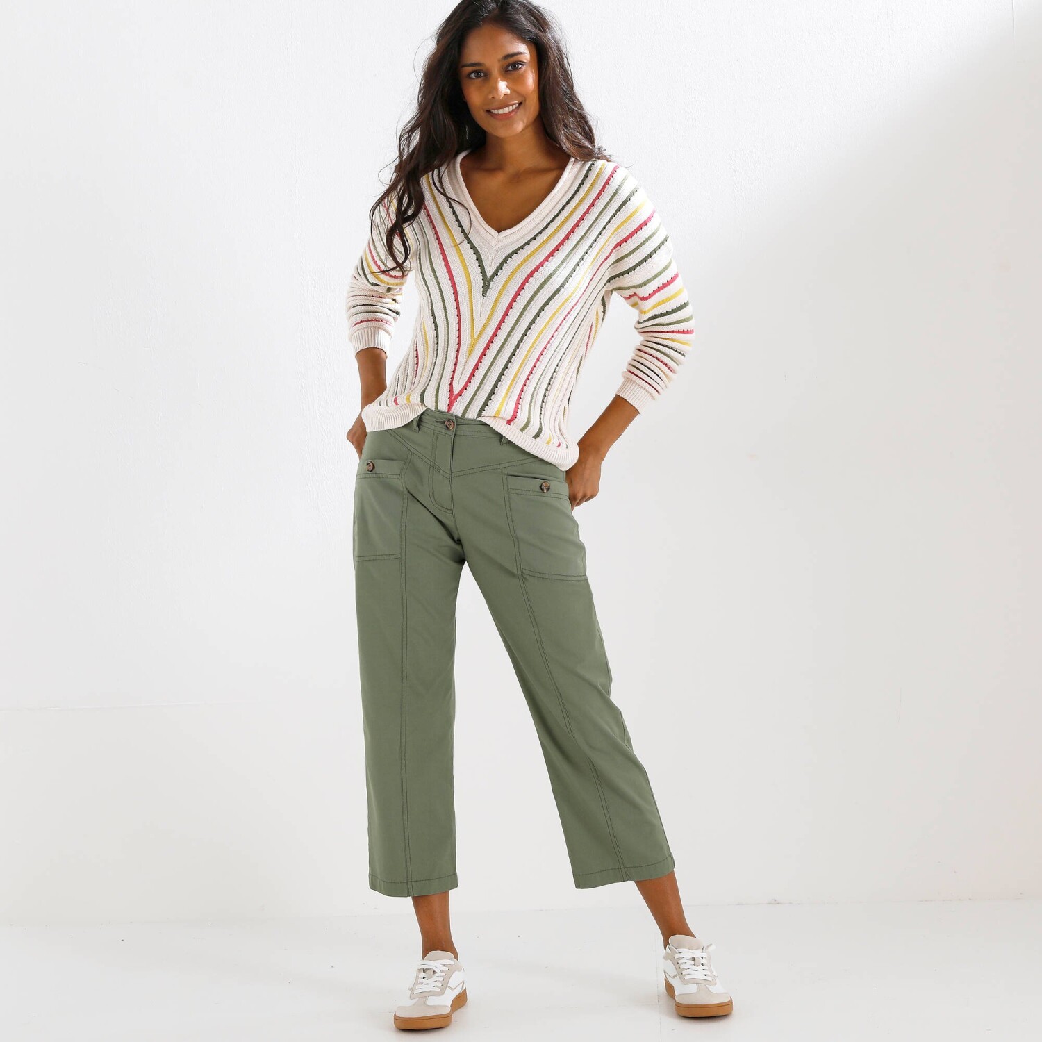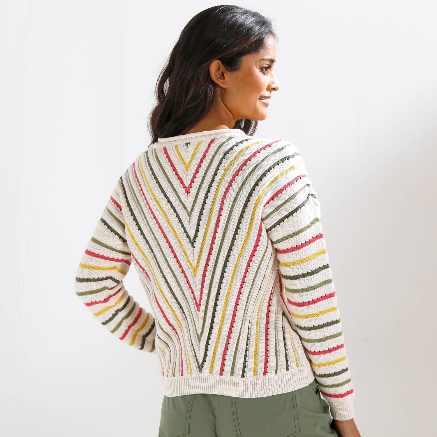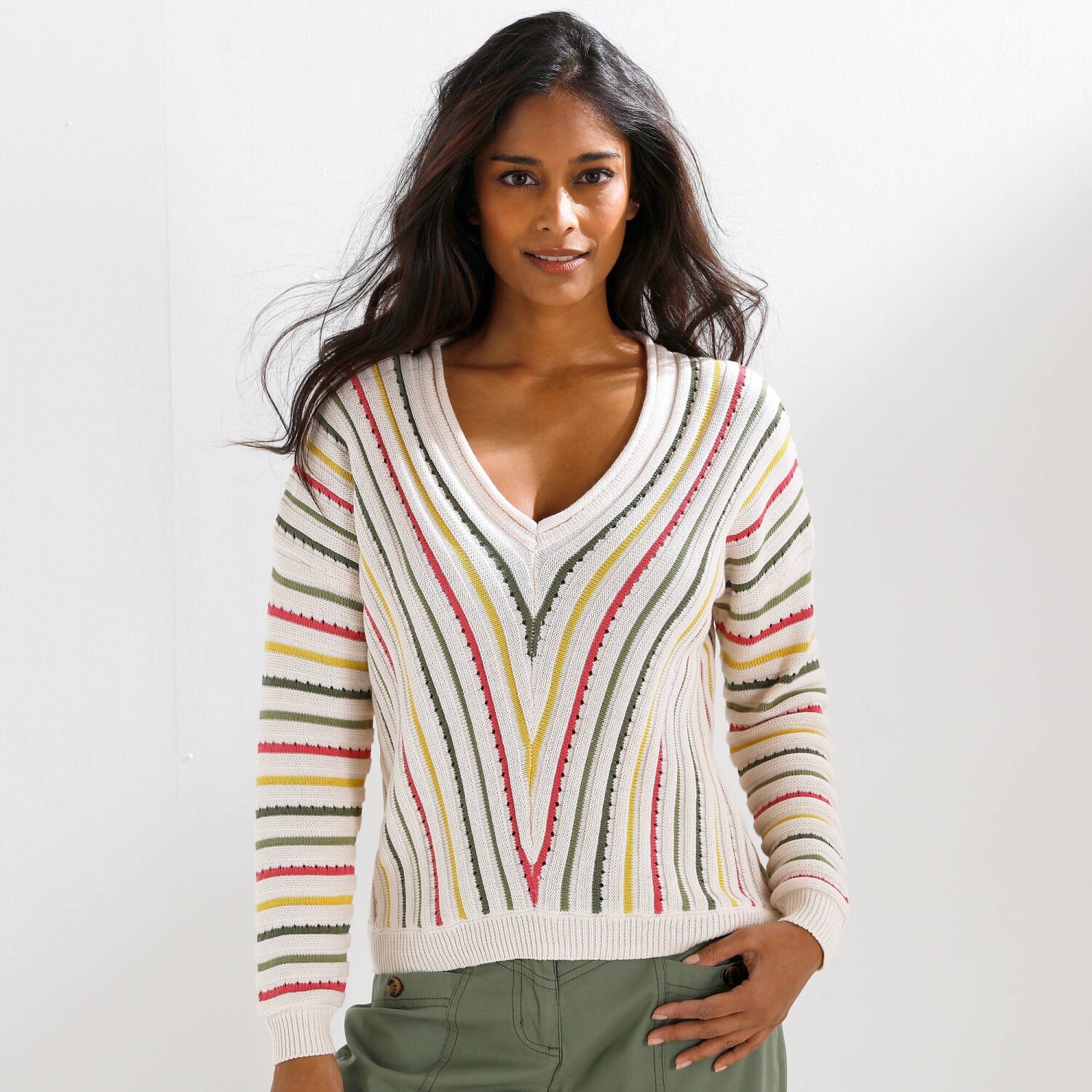 Ľahký a farebný pulóver sa ľahko kombinuje, záleží na Vašej fantázii. Výstrih do "V". Ažúrový vzor. Grafické pruhy (vpredu a vzadu). Dlhé rukávy. Rovný dolný lem. Možno prať v práčke.