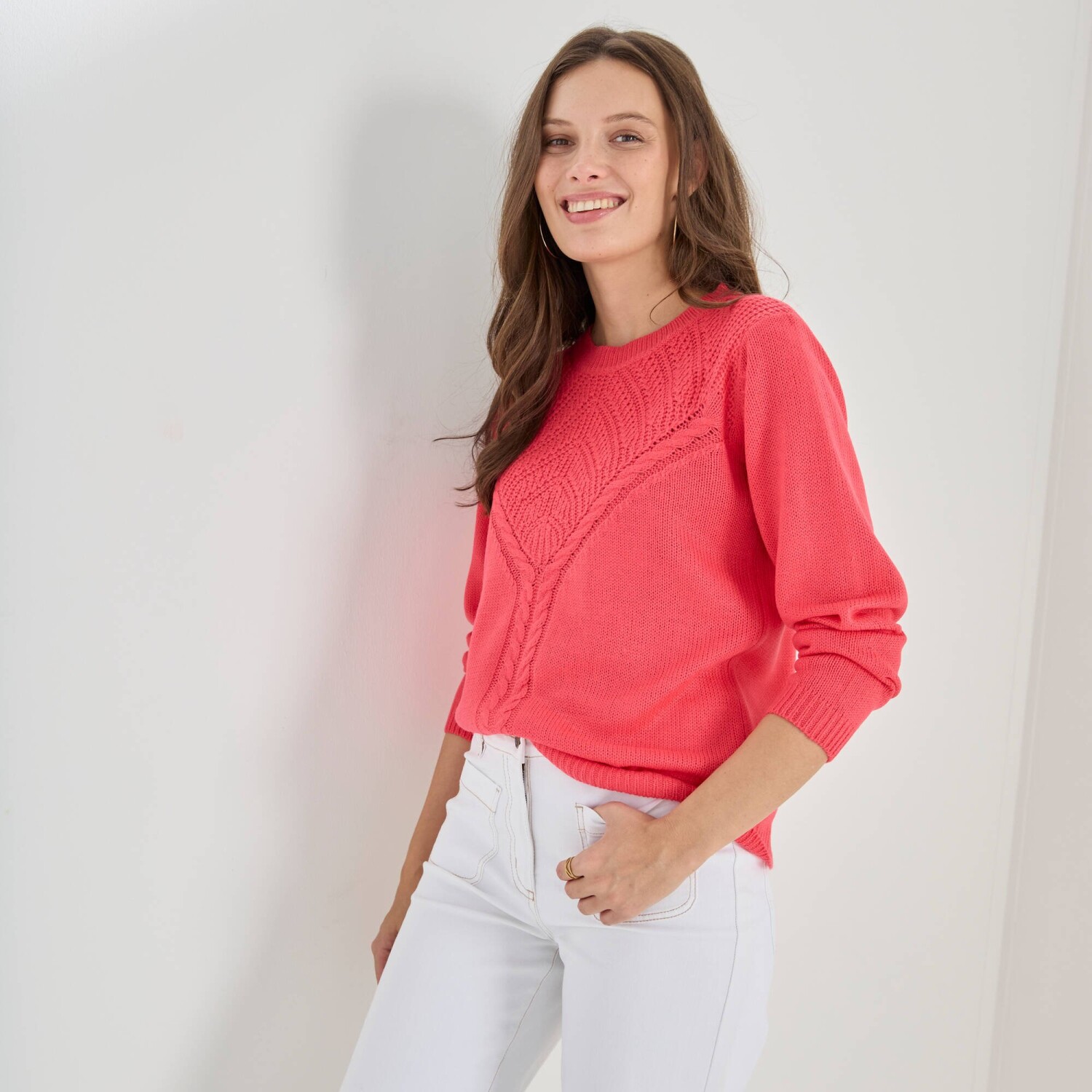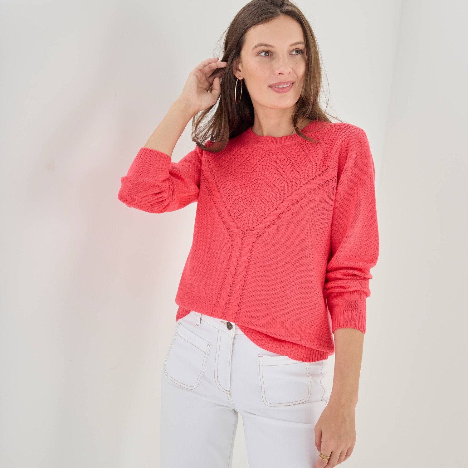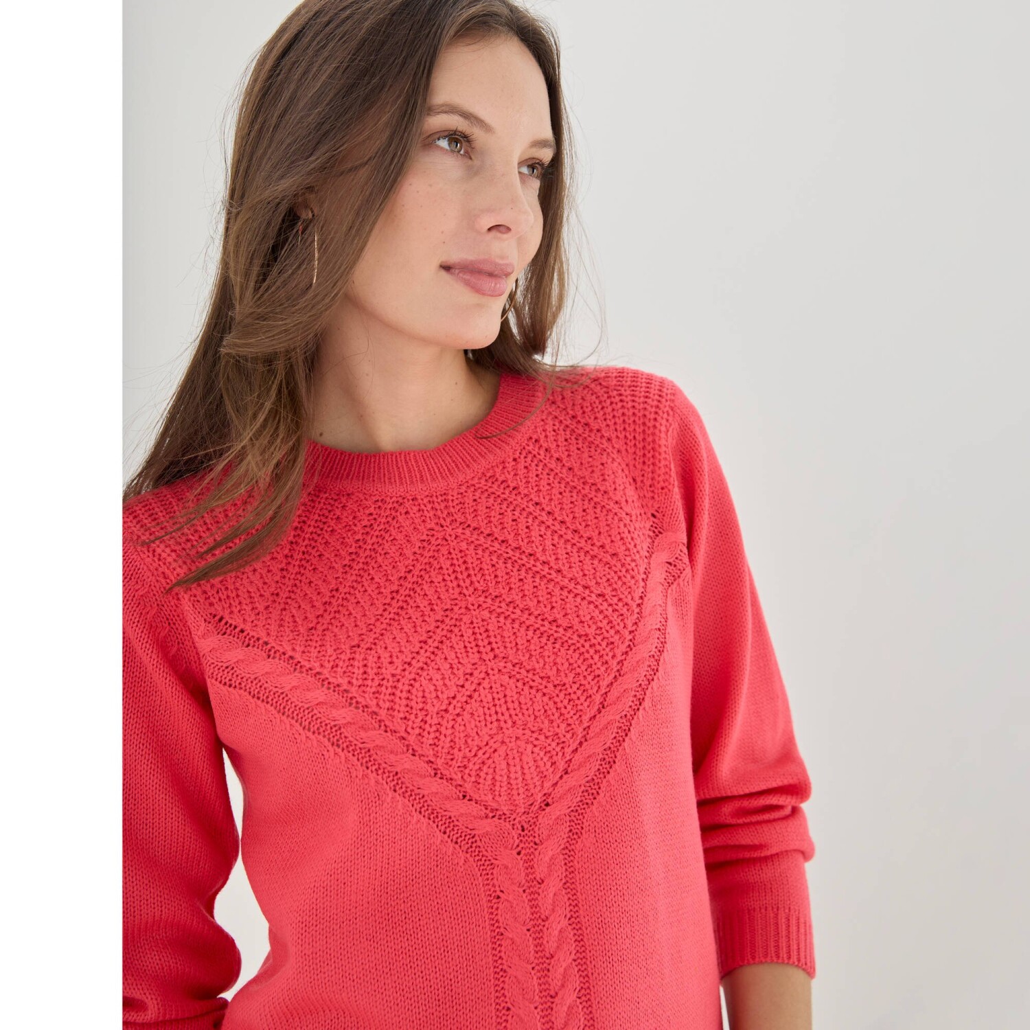 Pulóver s okrúhlym výstrihom originálne kombinuje pletené vzory. Okrúhly výstrih. Dlhé rukávy. Rovný dolný lem. Vrkočový vzor vpredu. Možno prať v práčke.
