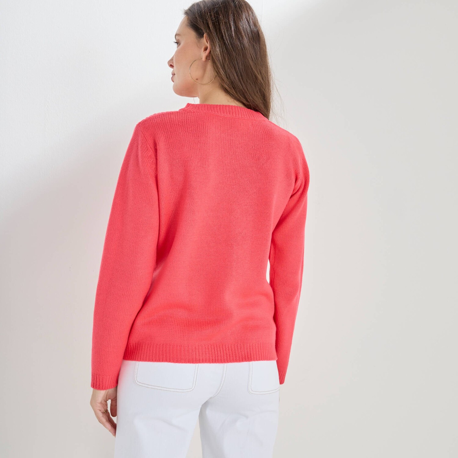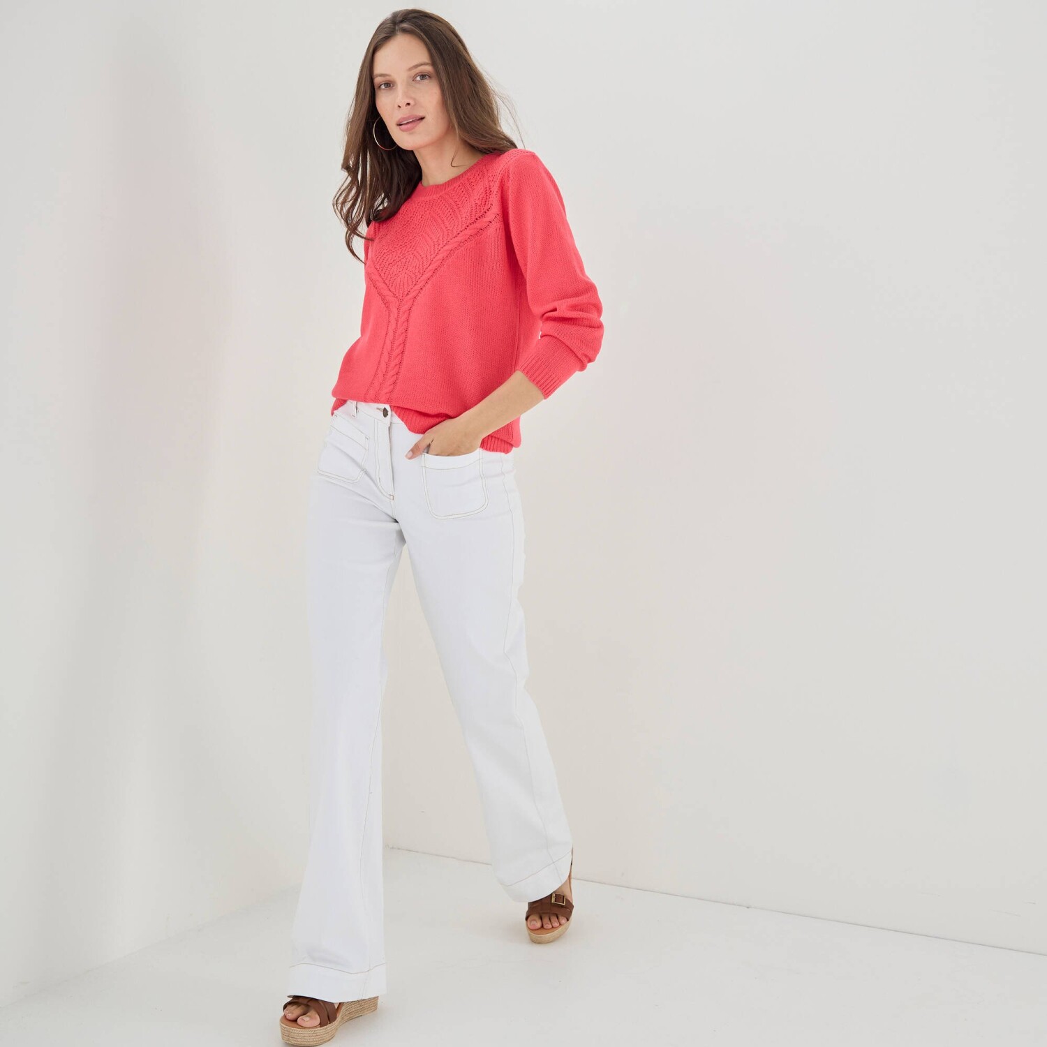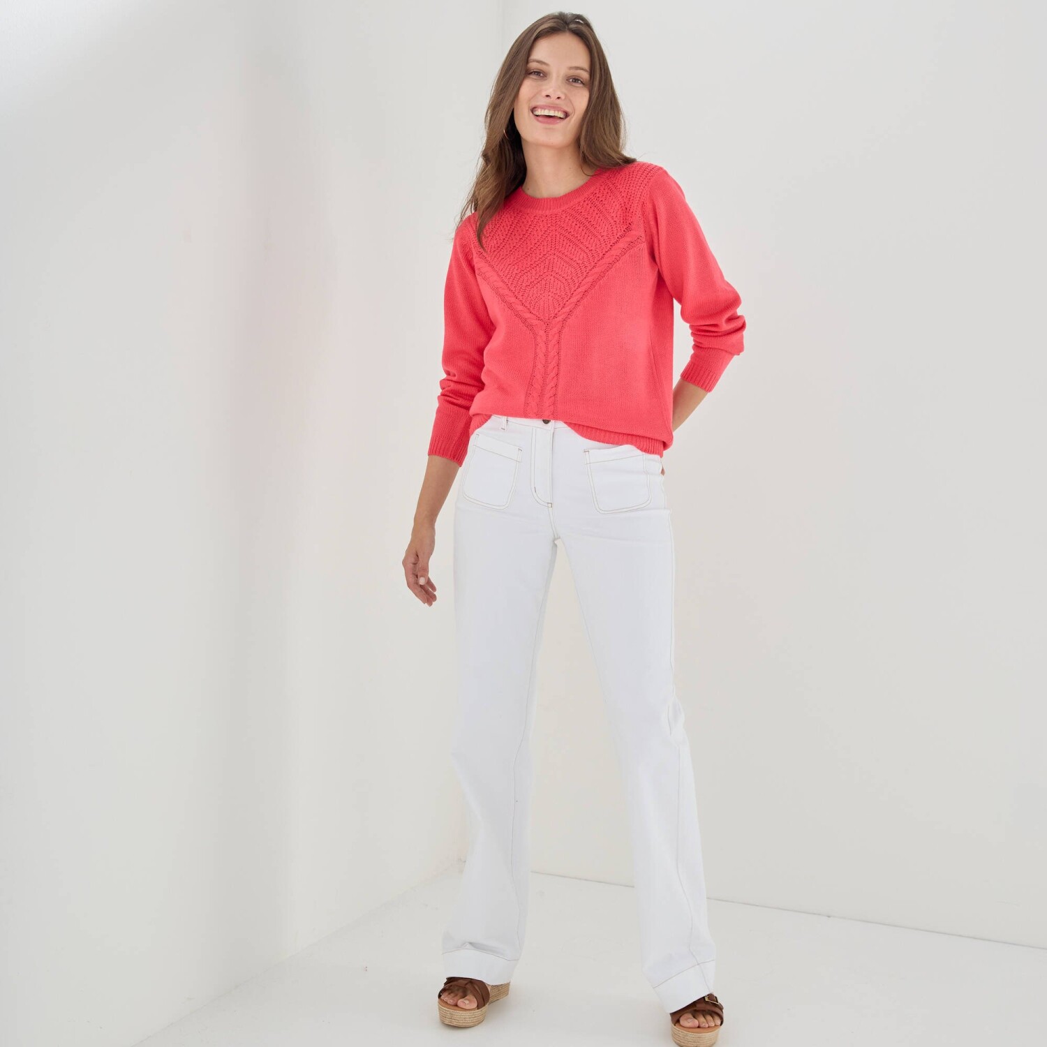 Pulóver s okrúhlym výstrihom originálne kombinuje pletené vzory. Okrúhly výstrih. Dlhé rukávy. Rovný dolný lem. Vrkočový vzor vpredu. Možno prať v práčke.