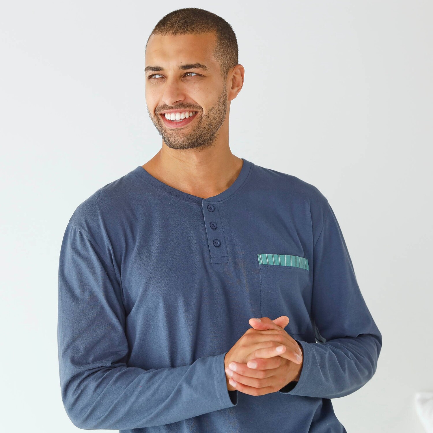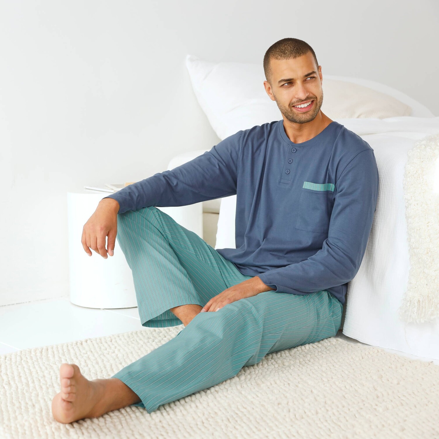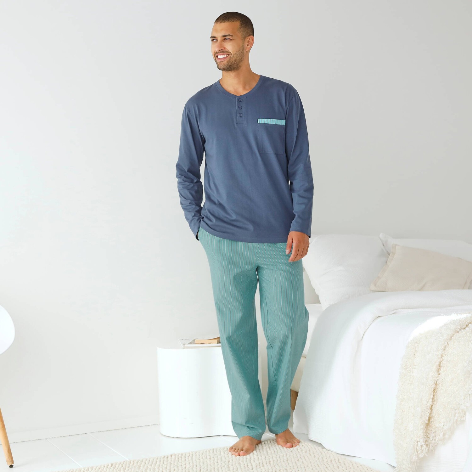 Horný diel z jednofarebného džerseja, nohavice z pruhovaného popelínu: zamilujte si aj Vy toto krásne pyžamo! Horný diel z jednofarebného džerseja. Tuniský výstrih na gombíky. Náprsné našité vrecko s pruhovaným zakončením. Dlhé rukávy. Nohavice z pruhovaného popelínu. Klinové vrecká vpredu. Pružný pás. Standard 100 by Oeko-Tex (n° CQ 1216 / 3 IFTH). Táto známka označuje textilné výrobky, ktoré boli podrobené laboratórnym testom na široké spektrum škodlivých látok a výrobok je bezpečný nad rámec platných noriem. Možno prať v práčke.
