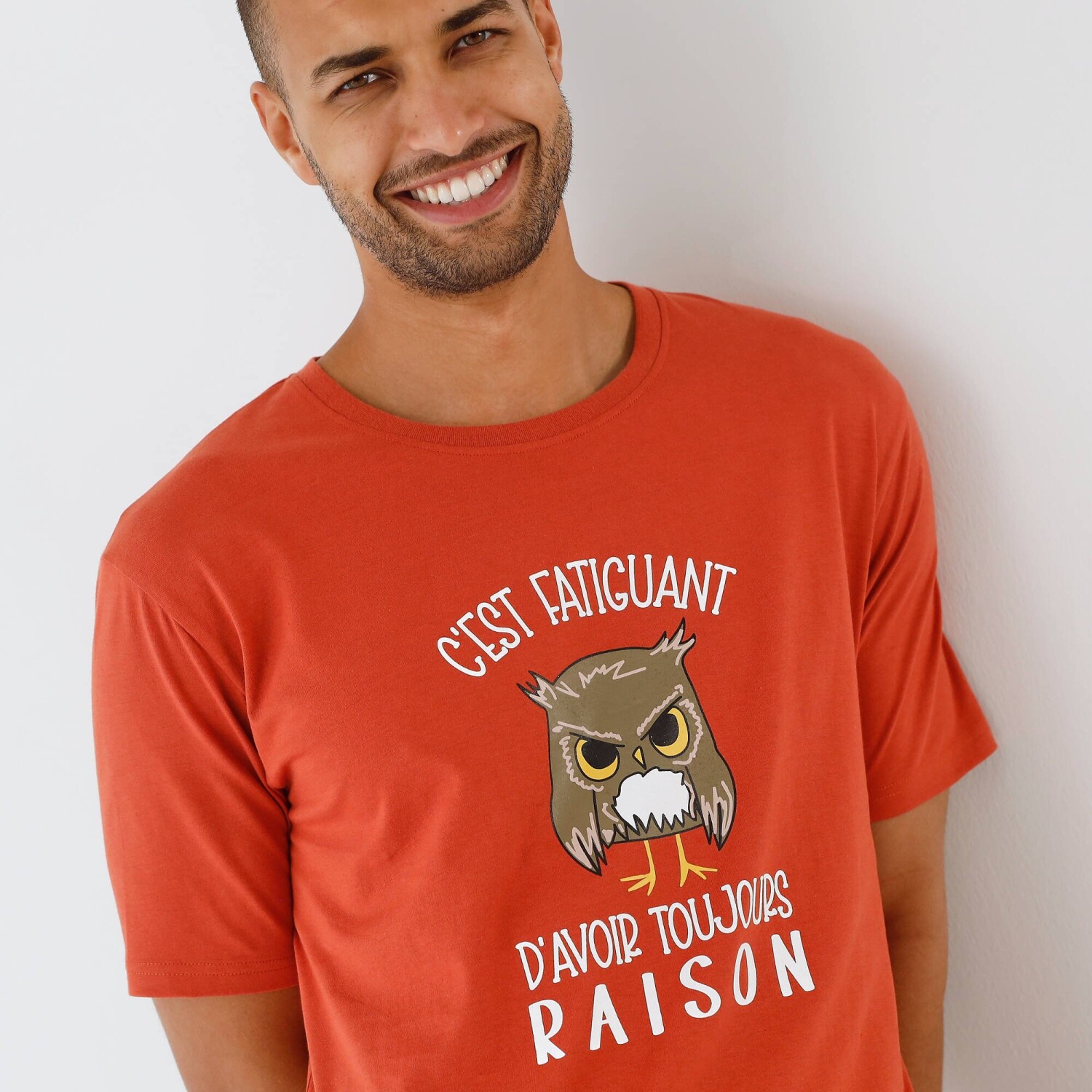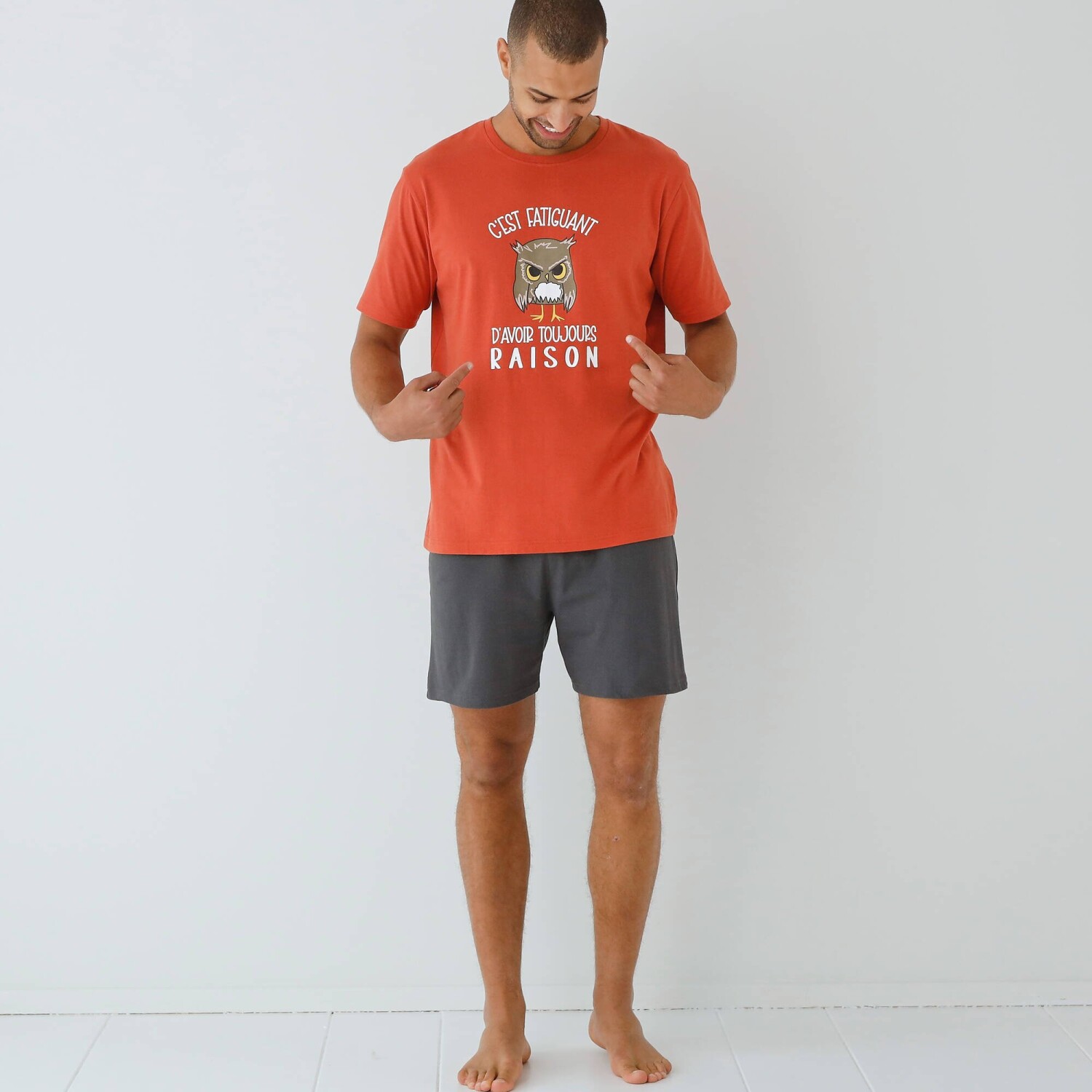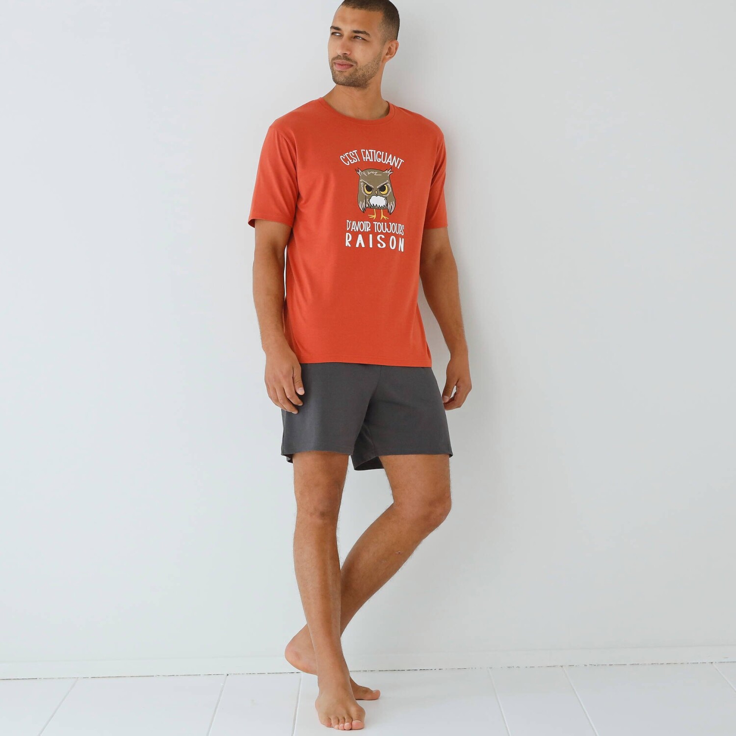 V módnych farbách a zo 100 % bavlny, pyžamo so šortkami a potlačou sovy nemá chybu! Jednofarebný horný diel. Vpredu potlač. Okrúhly výstrih. Krátke rukávy. Rovný dolný lem. Jednofarebné kontrastné šortky. Pružný pás. Standard 100 by Oeko-Tex (n° CQ 1216 / 3 IFTH). Táto známka označuje textilné výrobky, ktoré boli podrobené laboratórnym testom na široké spektrum škodlivých látok a výrobok je bezpečný nad rámec platných noriem. Možno prať v práčke.