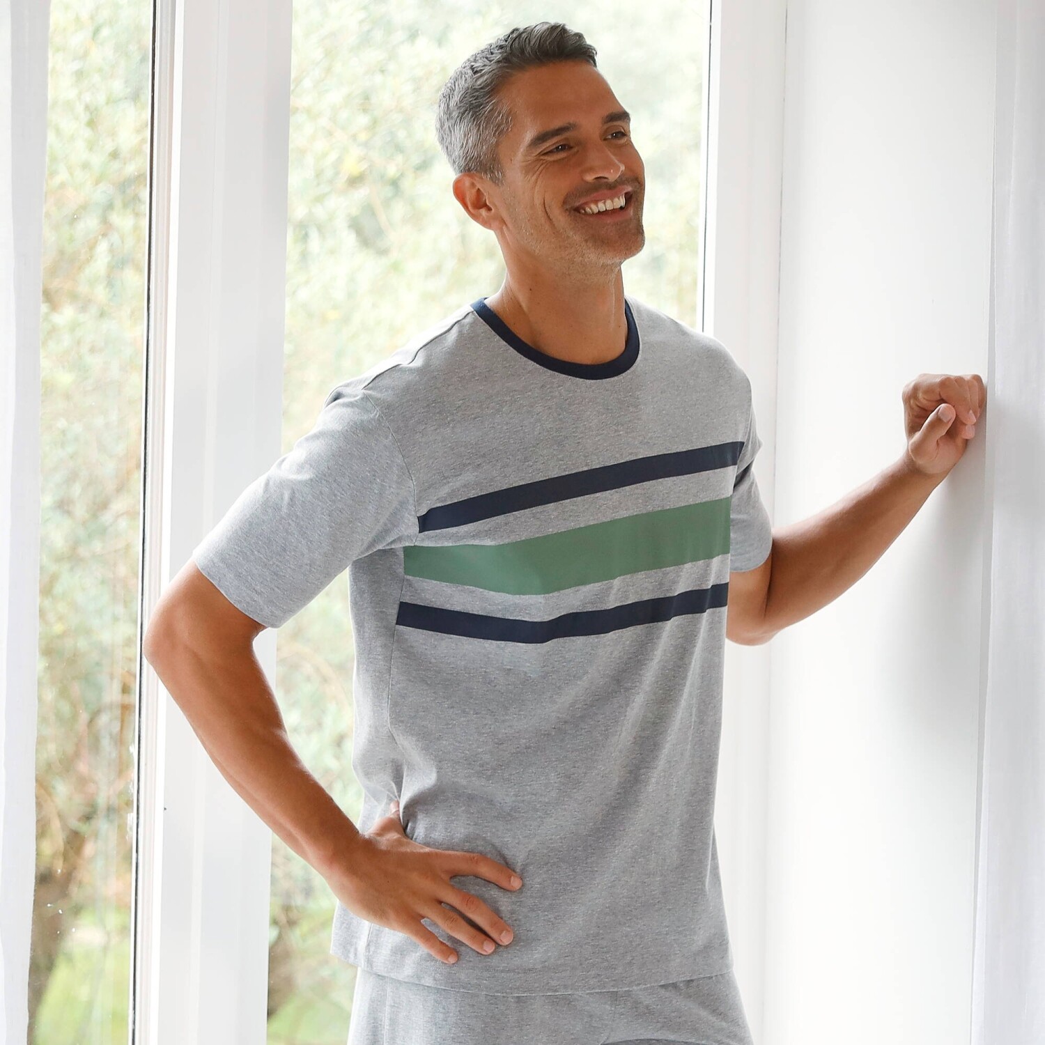Pružnosť a jemnosť sa snúbia v pyžamovom tričku s pruhmi a krátkymi rukávmi. Okrúhly výstrih. Vpredu kontrastné časti. Krátke rukávy. Rovný spodný lem. Standard 100 by Oeko-Tex (n° CQ 1216/1 IFTH). Táto známka označuje textilné výrobky, ktoré boli podrobené laboratórnym testom na široké spektrum škodlivých látok a výrobok je bezpečný nad rámec platných noriem. Možno prať v práčke.