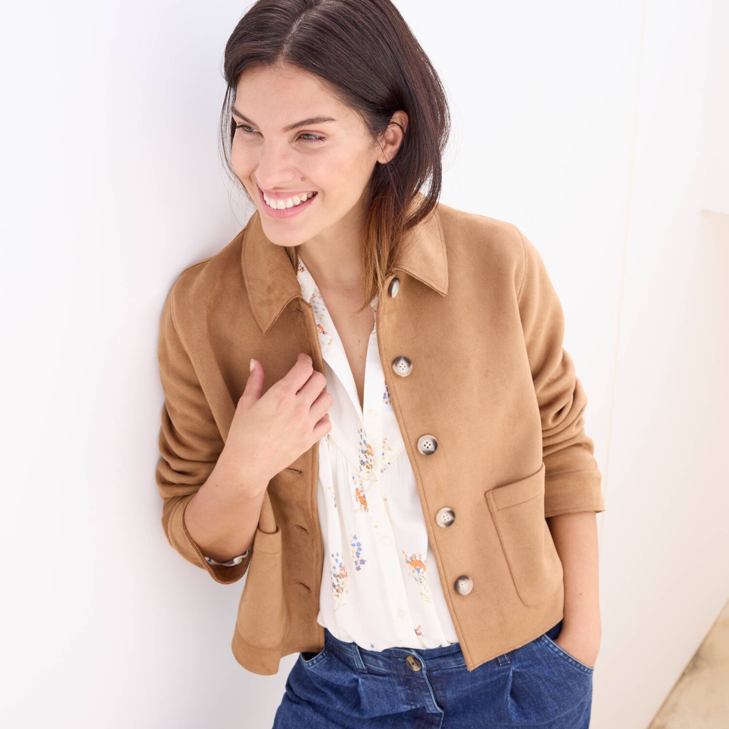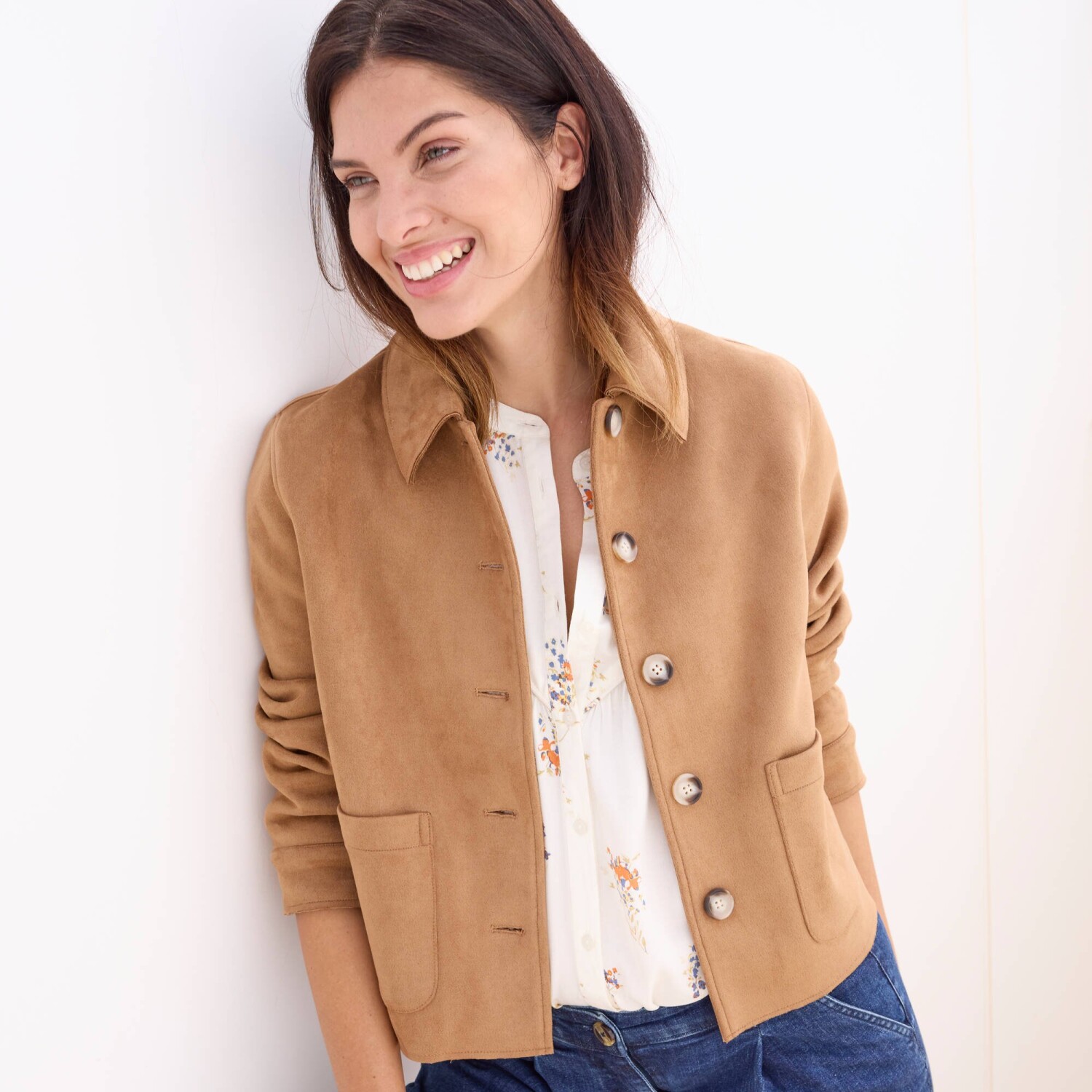 Rovná bunda na gombíky v semišovom vzhľade